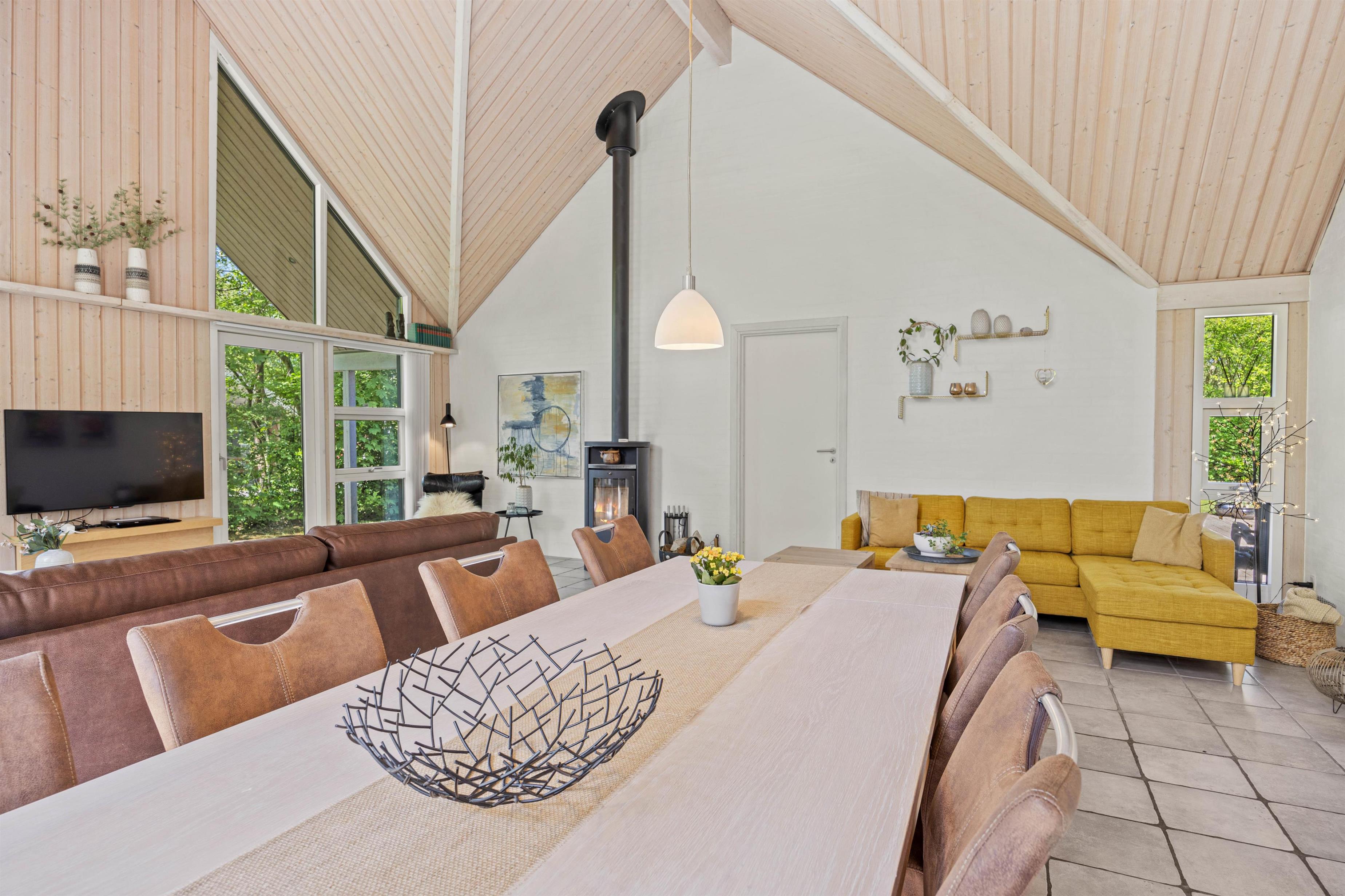 Opholdsrummene er nøje indrettet for at sikre både fredfyldte stunder ved den knitrende brændeovn og livligt samvær i det åbne og lyse fællesareal. Store vinduer slipper et blødt lys ind, der smukt falder over køkkenet, spisestuen og stuen, der glider sammen i en elegant symbiose, med lækre møbler og bordtennis.