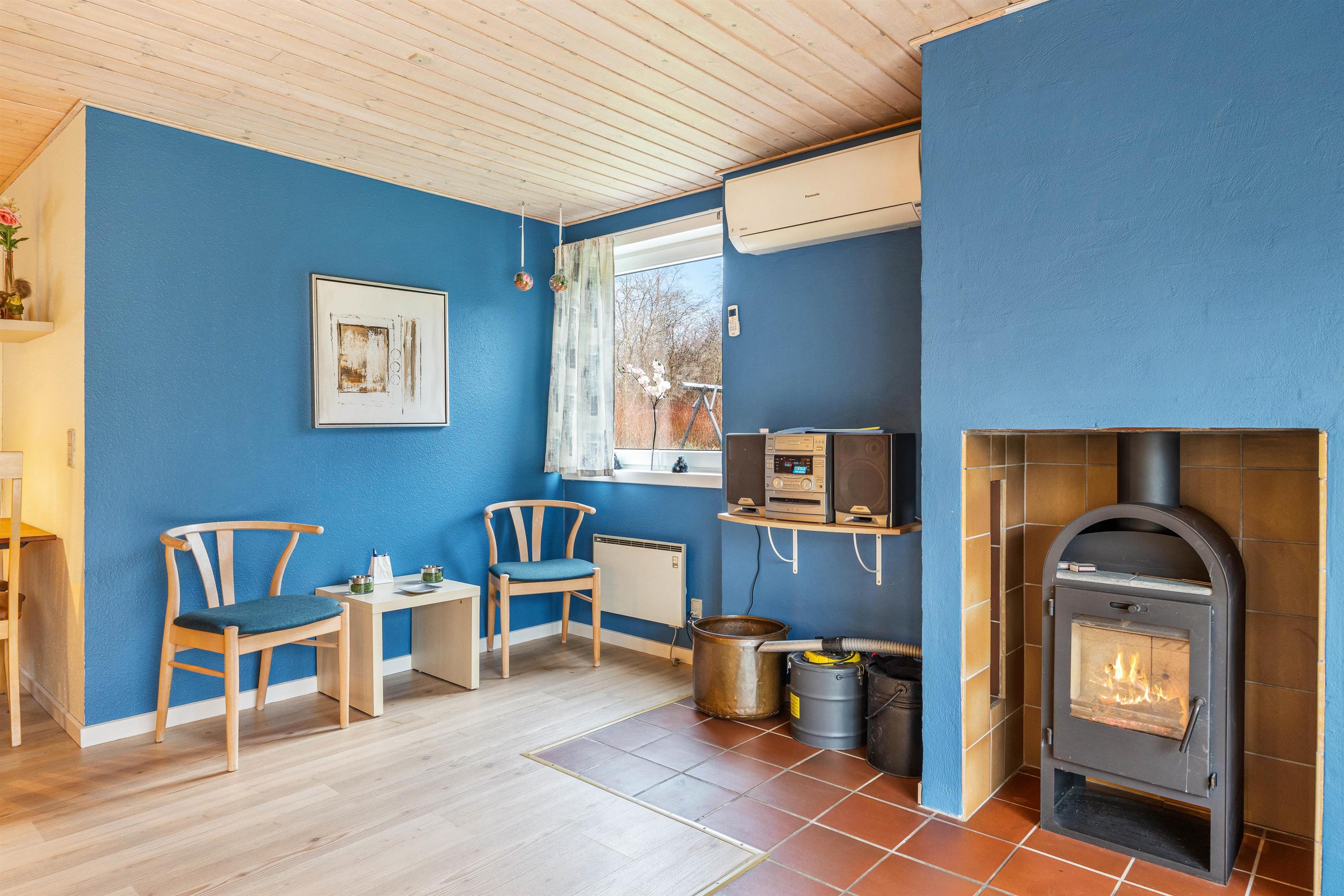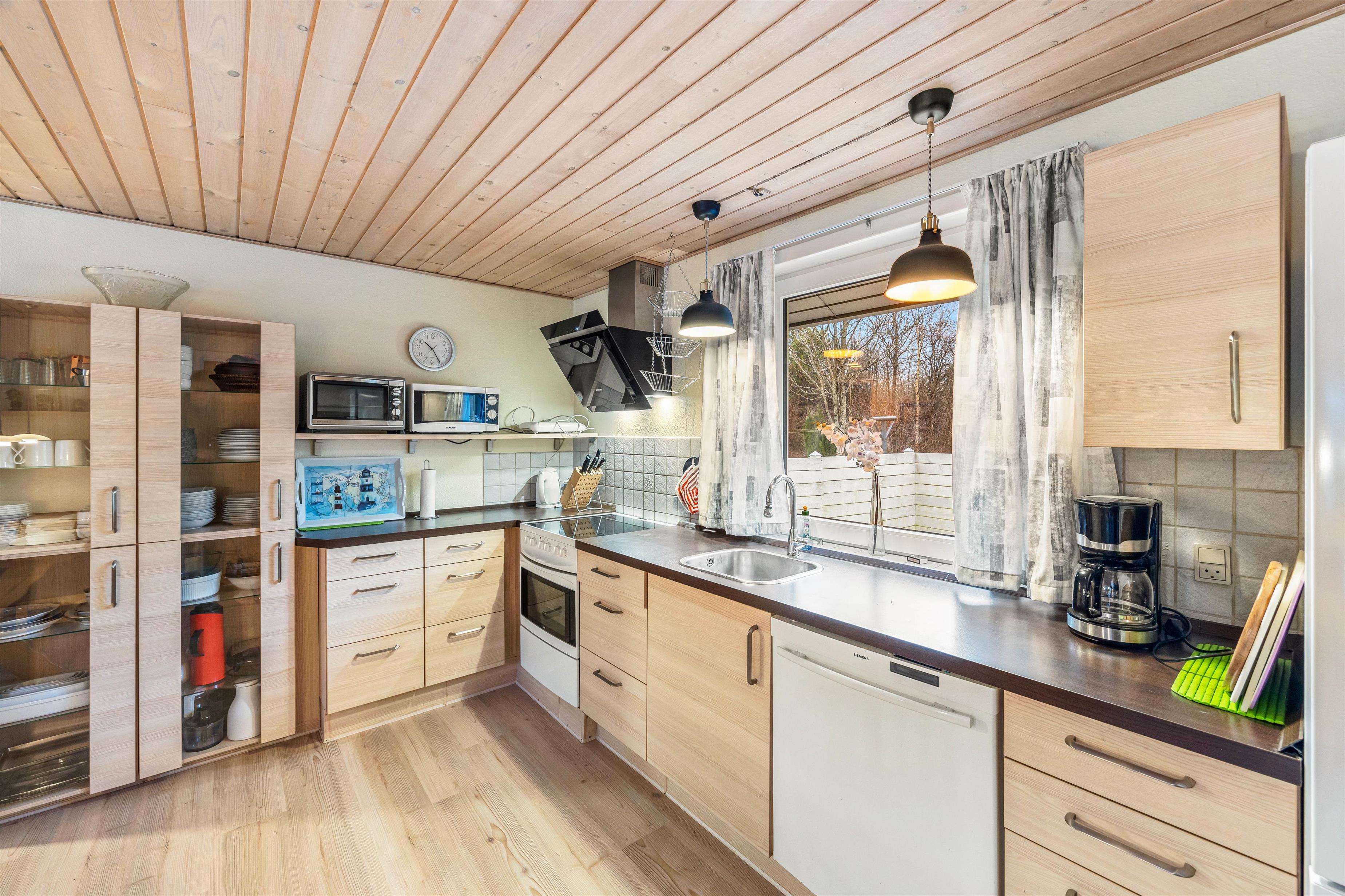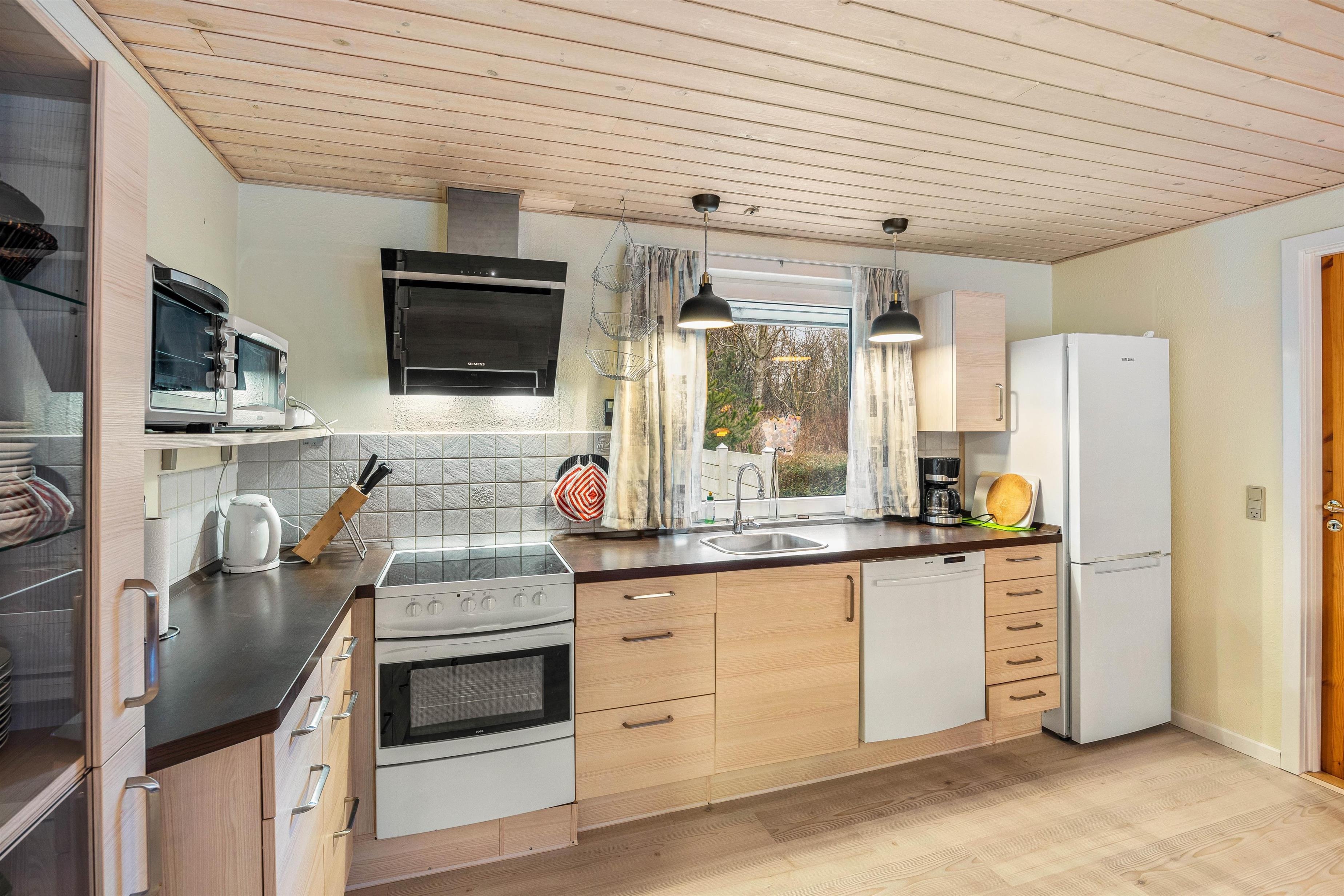 Køkkenet er udstyret med en opvaskemaskine, der gør madlavningen og oprydningen til en fornøjelse, mens den tilstødende stue inviterer til brætspil og hyggestunder. Her finder I også en brændeovn, der tilføjer den klassiske sommerhusstemning.