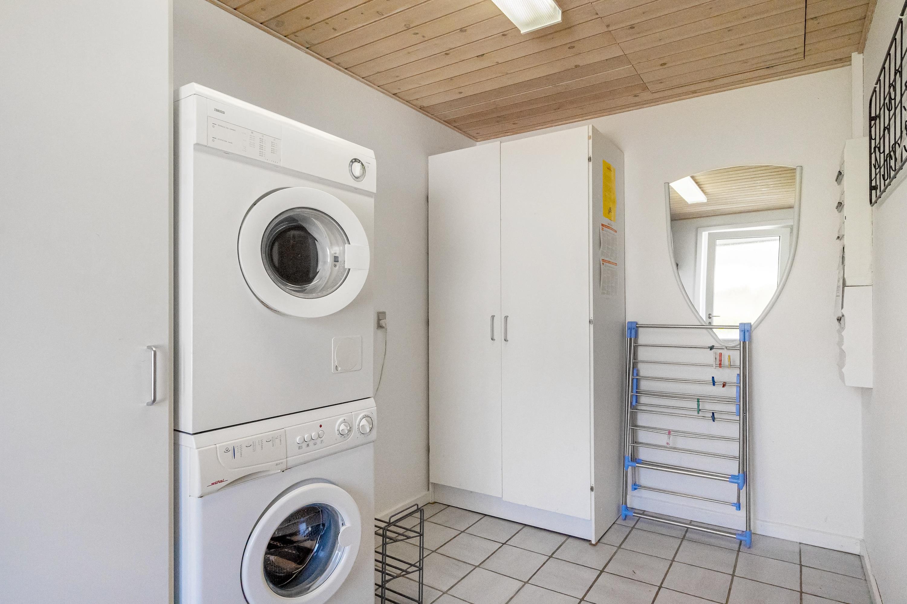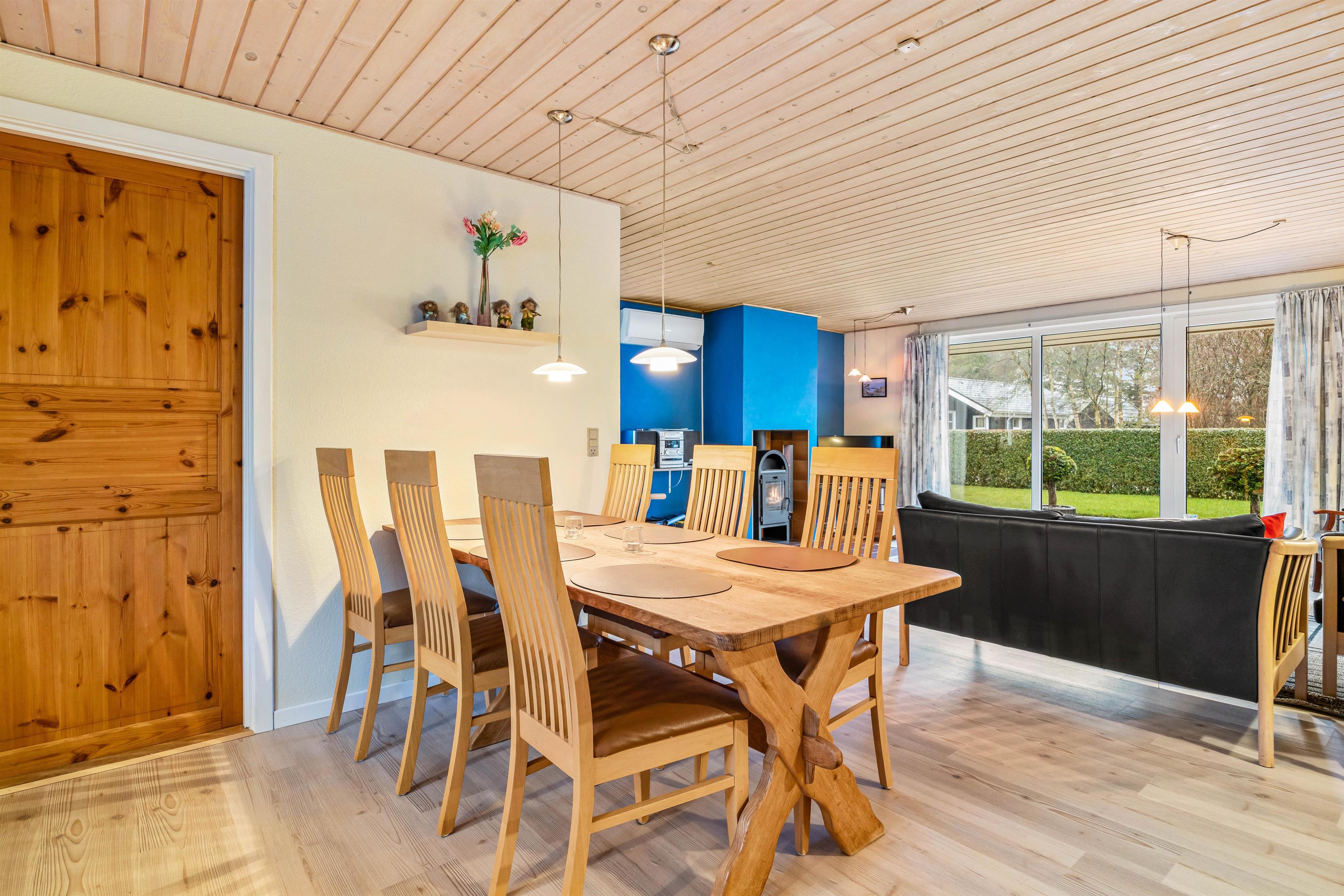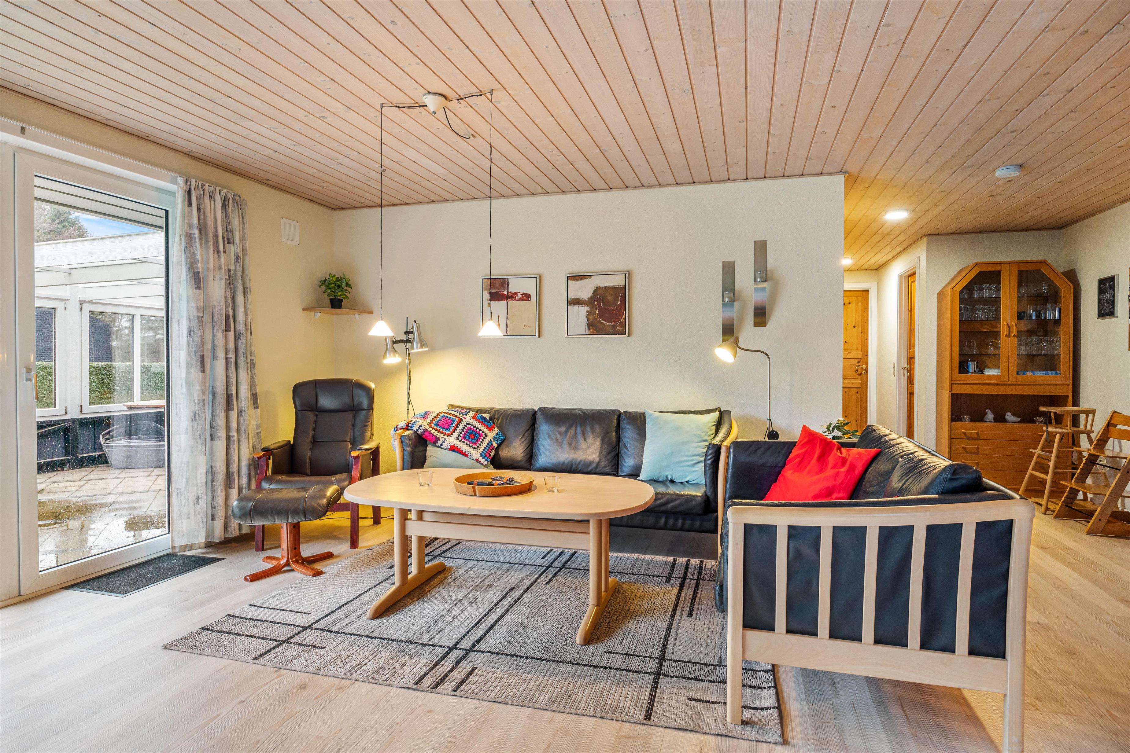 Køkkenet er udstyret med en opvaskemaskine, der gør madlavningen og oprydningen til en fornøjelse, mens den tilstødende stue inviterer til brætspil og hyggestunder. Her finder I også en brændeovn, der tilføjer den klassiske sommerhusstemning.