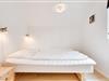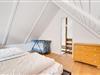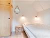 På første sal (stejl trappe) ligger det ene af sommerhusets 2 soveværelser med dobbeltsenge, imens du i stueetagen har det andet soveværelse, opholdsrummet og et badeværelse holdt i lyse farver med bruser og gulvvarme.