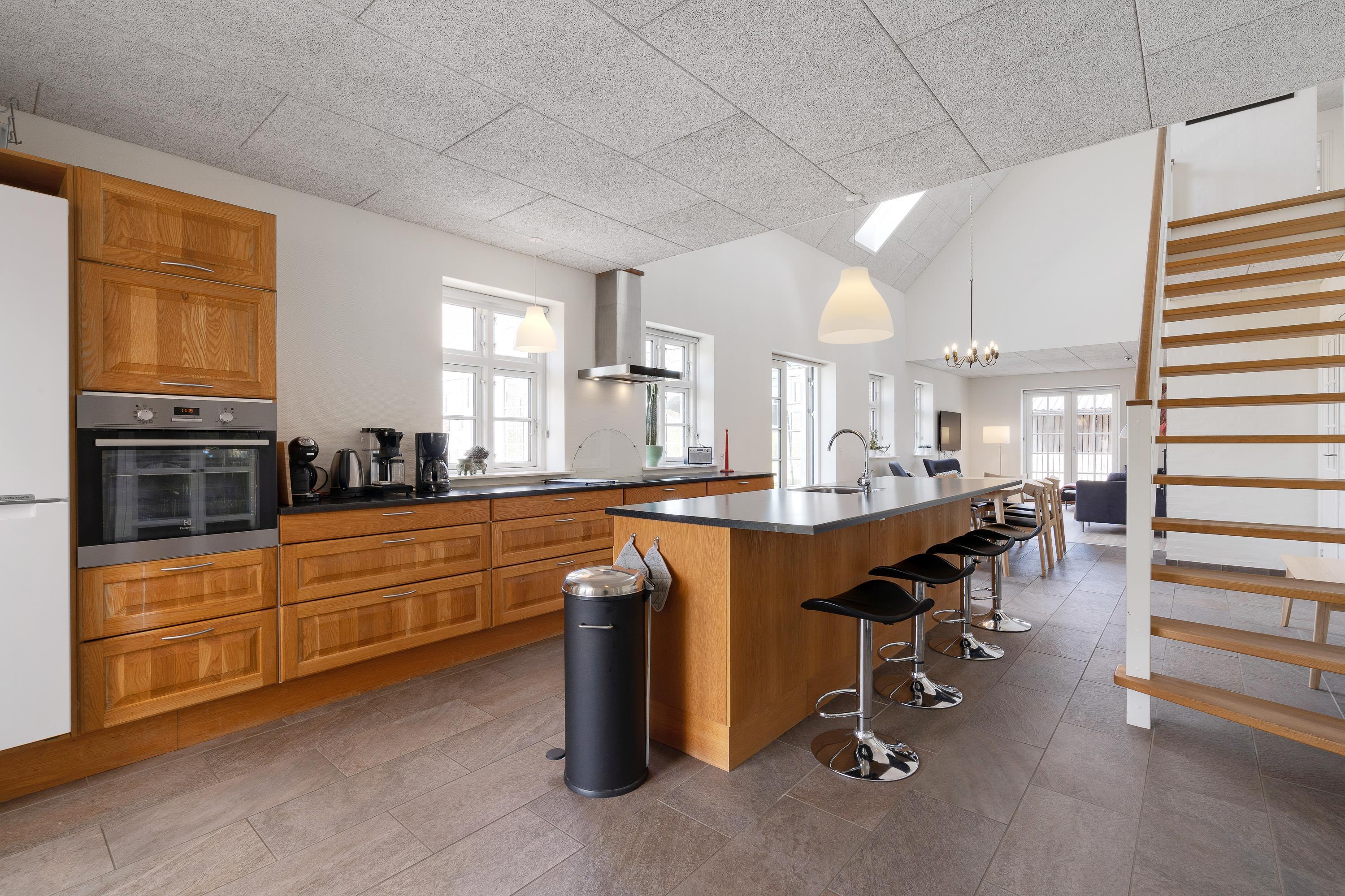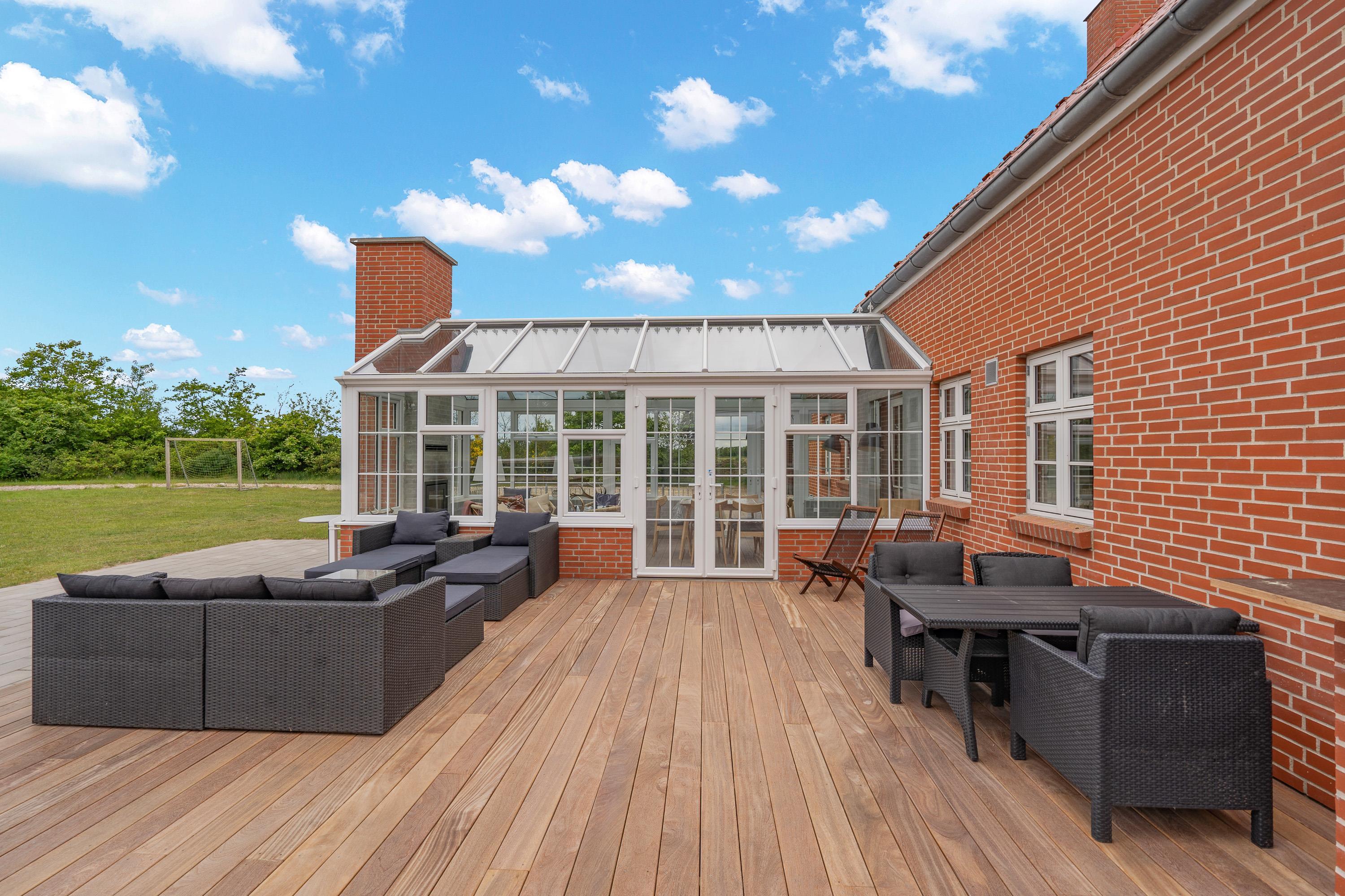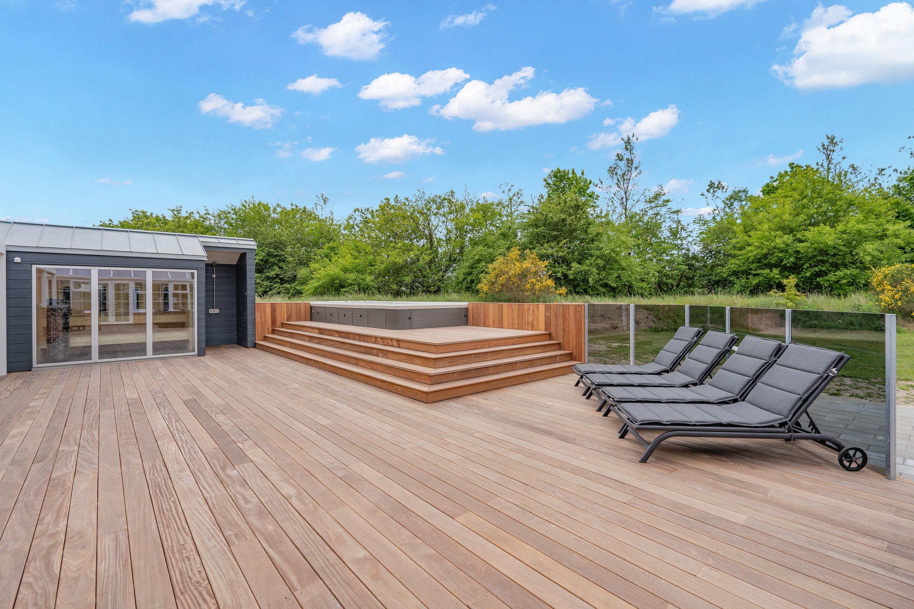I haven er der både rutsjebane og en stor gynge til børnene, der ikke ligger langt fra sommerhusets store terrasse på hele 80 kvadratmeter, hvor en del også er overdækket. Her kan I tilberede lækre feriemåltider på gas- eller trækulgrillen og slappe af i ferieboligens havemøbler. I finder også et lækkert udekøkken, som er delvist overdækket og afskærmet. Når det bliver køligt, kan I tænde op i den udendørs pejs og nyde varmen under åben himmel.