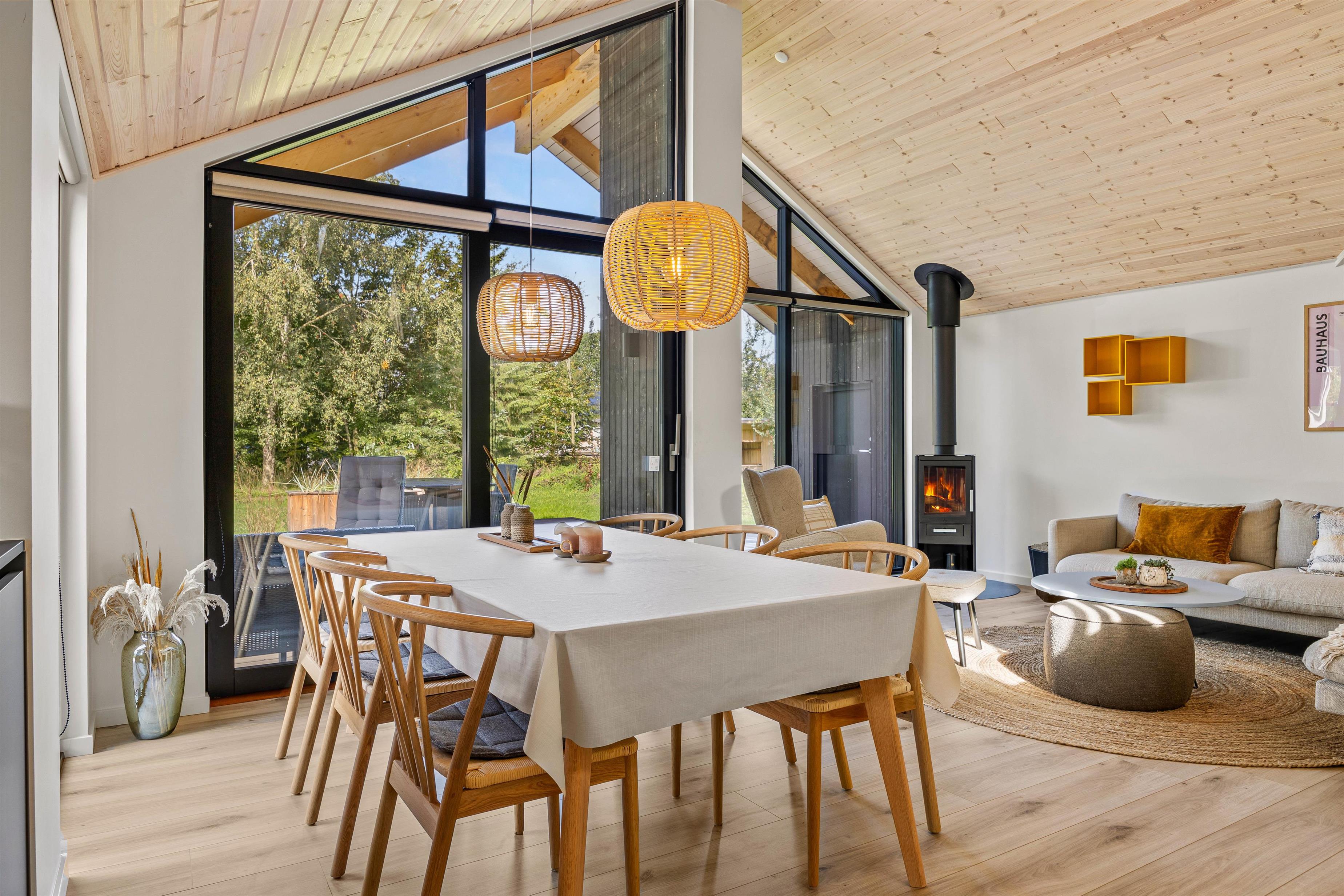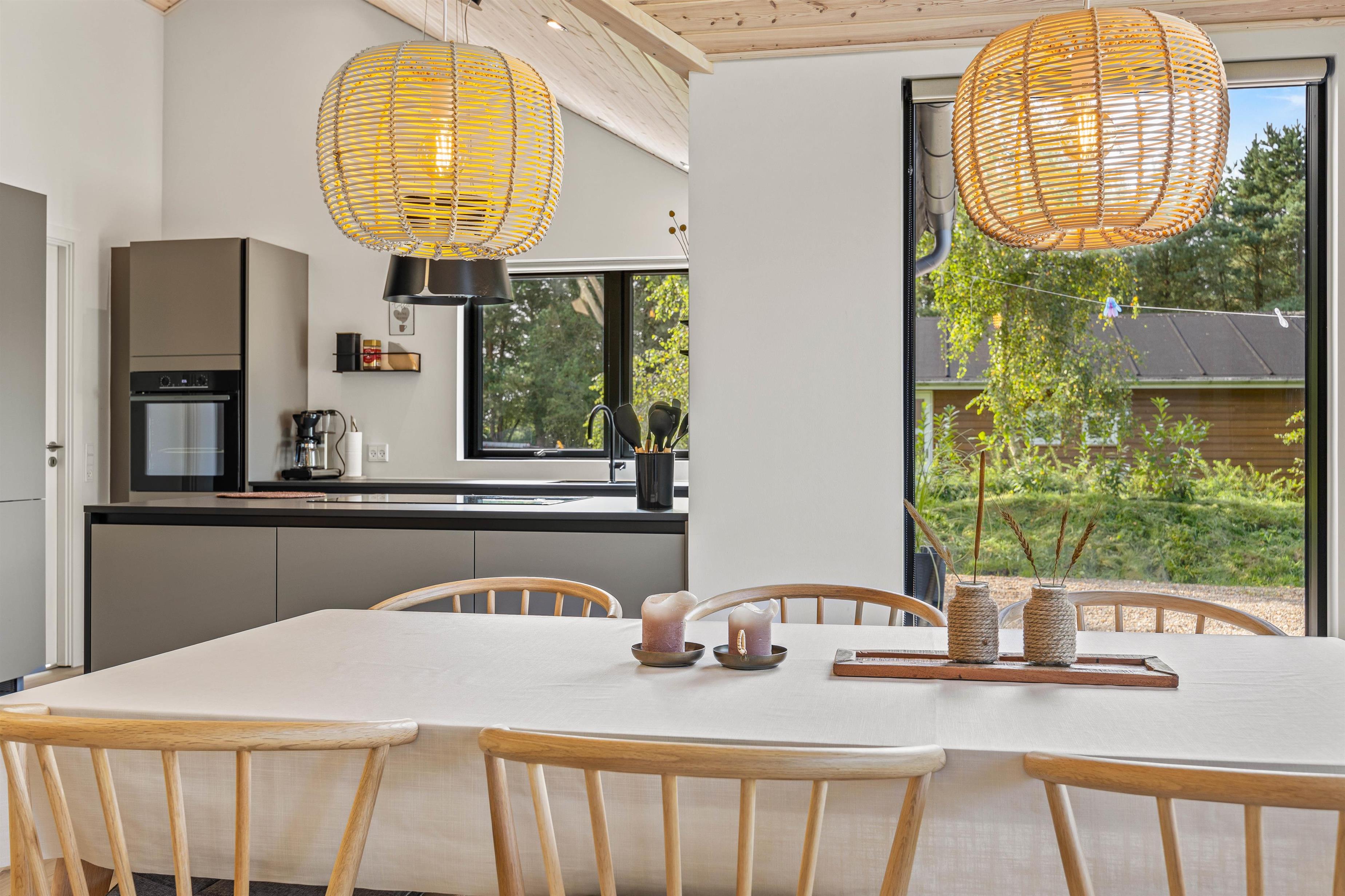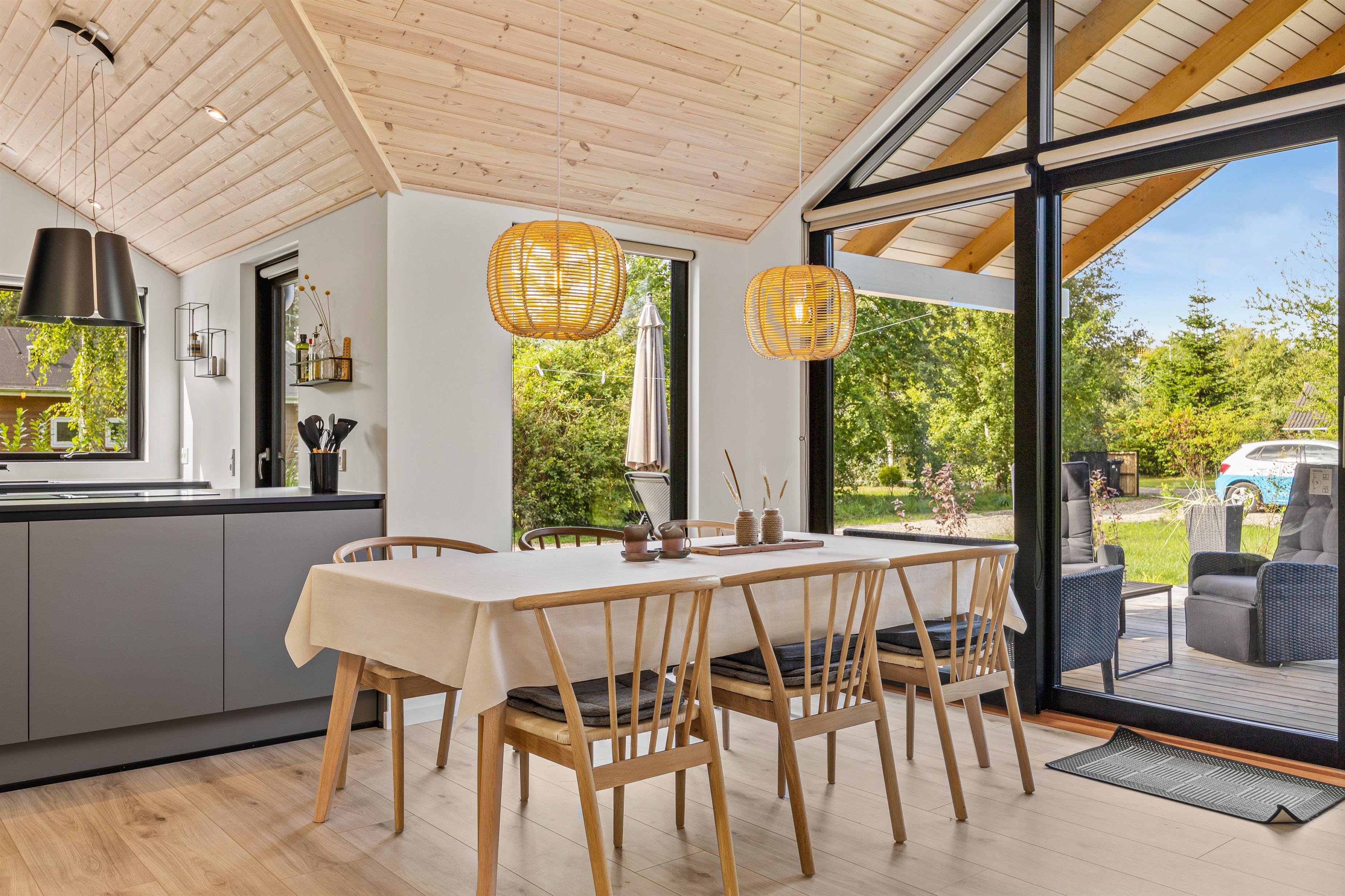I dette sommerhus kan op mod 6 feriegæster og deres hund få en uforglemmelig ferie i skønne omgivelser – uanset årstiden. De enkle farvenuancer, mange store vinduespartier og komfortable møbler skaber en dejlig atmosfære med plads til samvær. I det store køkkenalrum kan I både være sammen hver for sig eller være fælles om mange hyggelig ting. Forbered råvarerne til et lækkert grill-måltid, spil brætspil sammen omkring spisebordet eller slå jer ned i sofaen med jeres yndlingsserie.