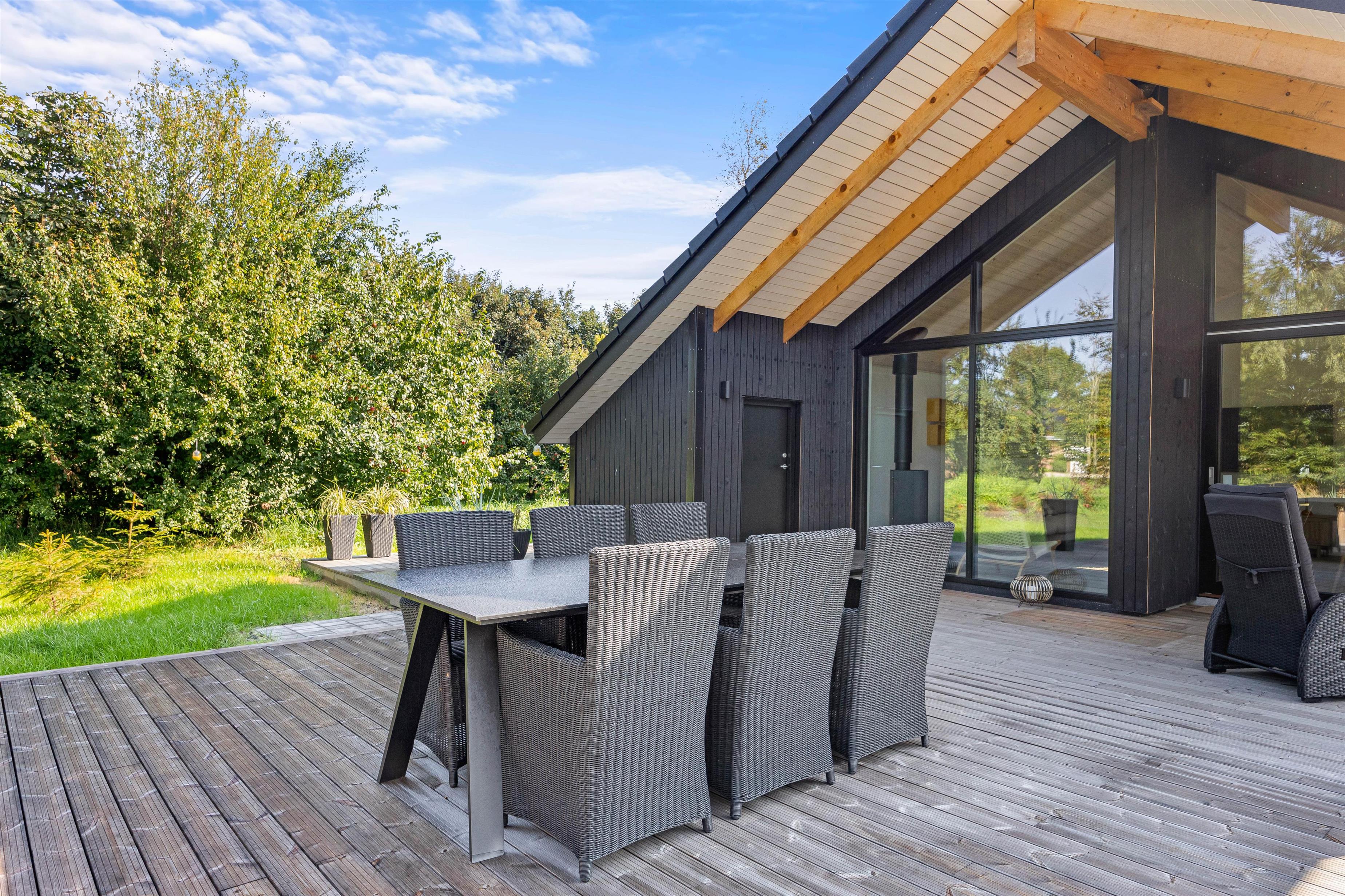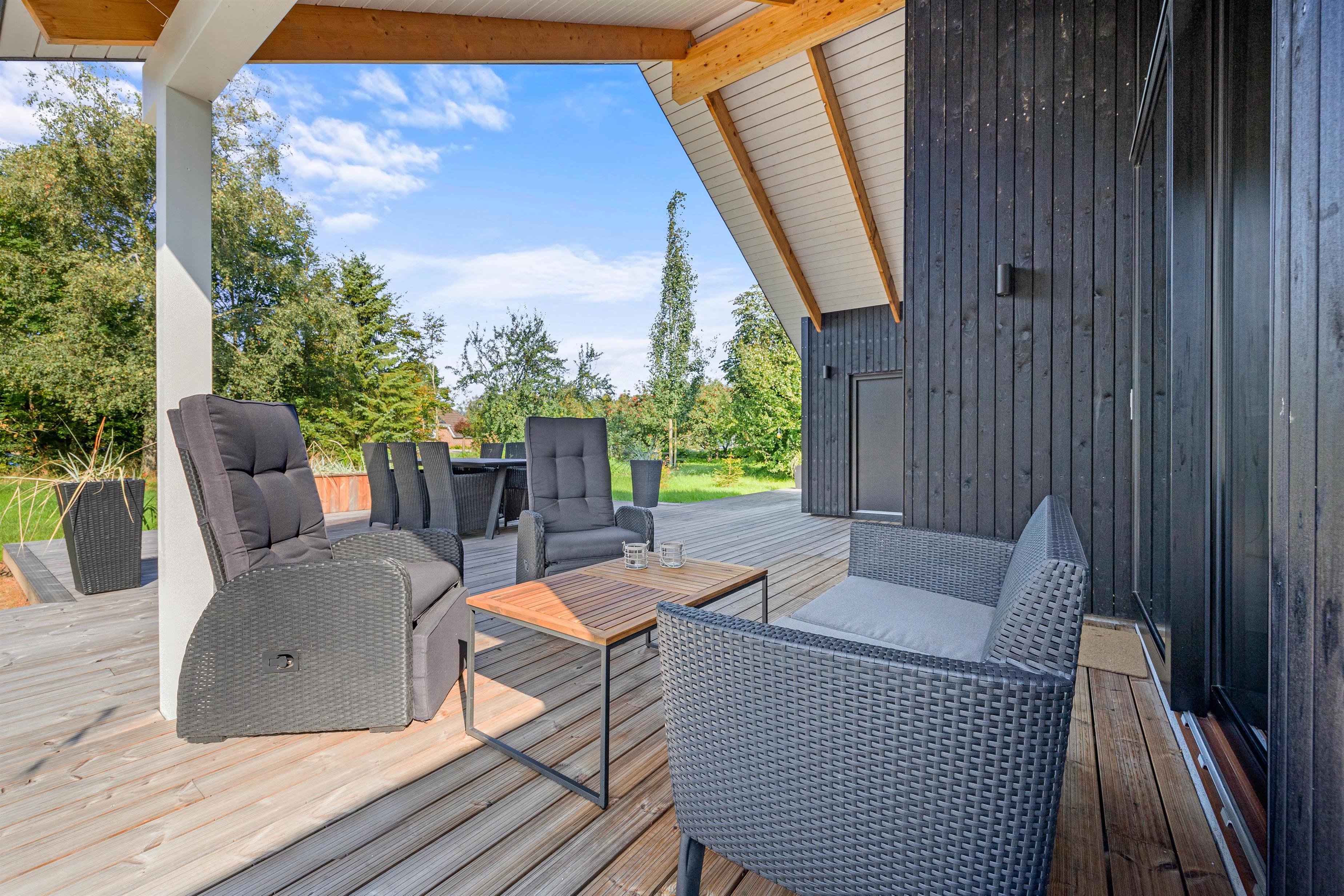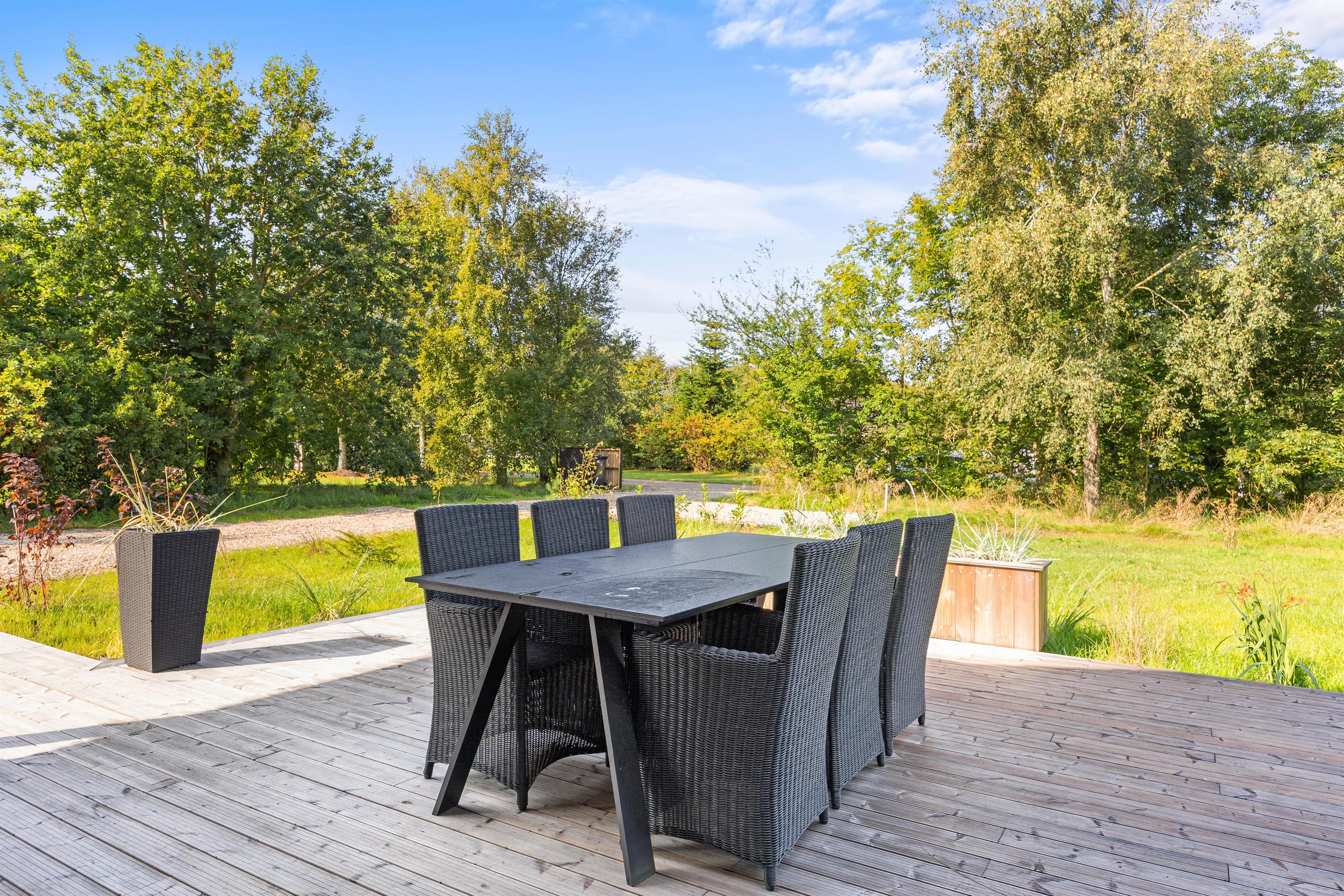 Den store træterrasse er helt fantastisk og indbyder til mange timers hygge i solskinnet. Terrassen er delvist overdækket, hvor I kan søge over i skyggen eller sidde og nyde morgenkaffe en tidlig forårsdag med udsigt over den store naturgrund. Her kan hunden trisse frit rundt.