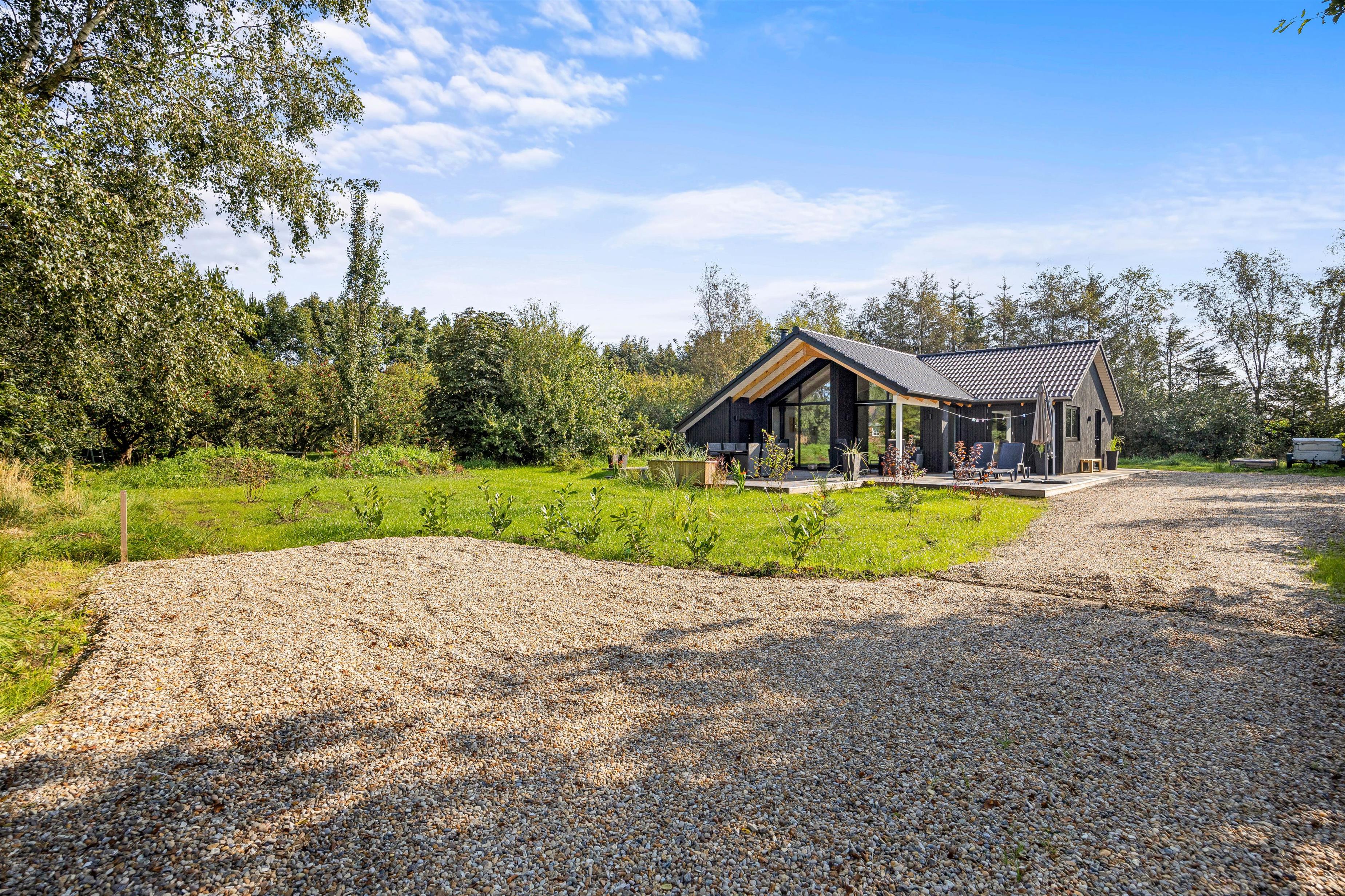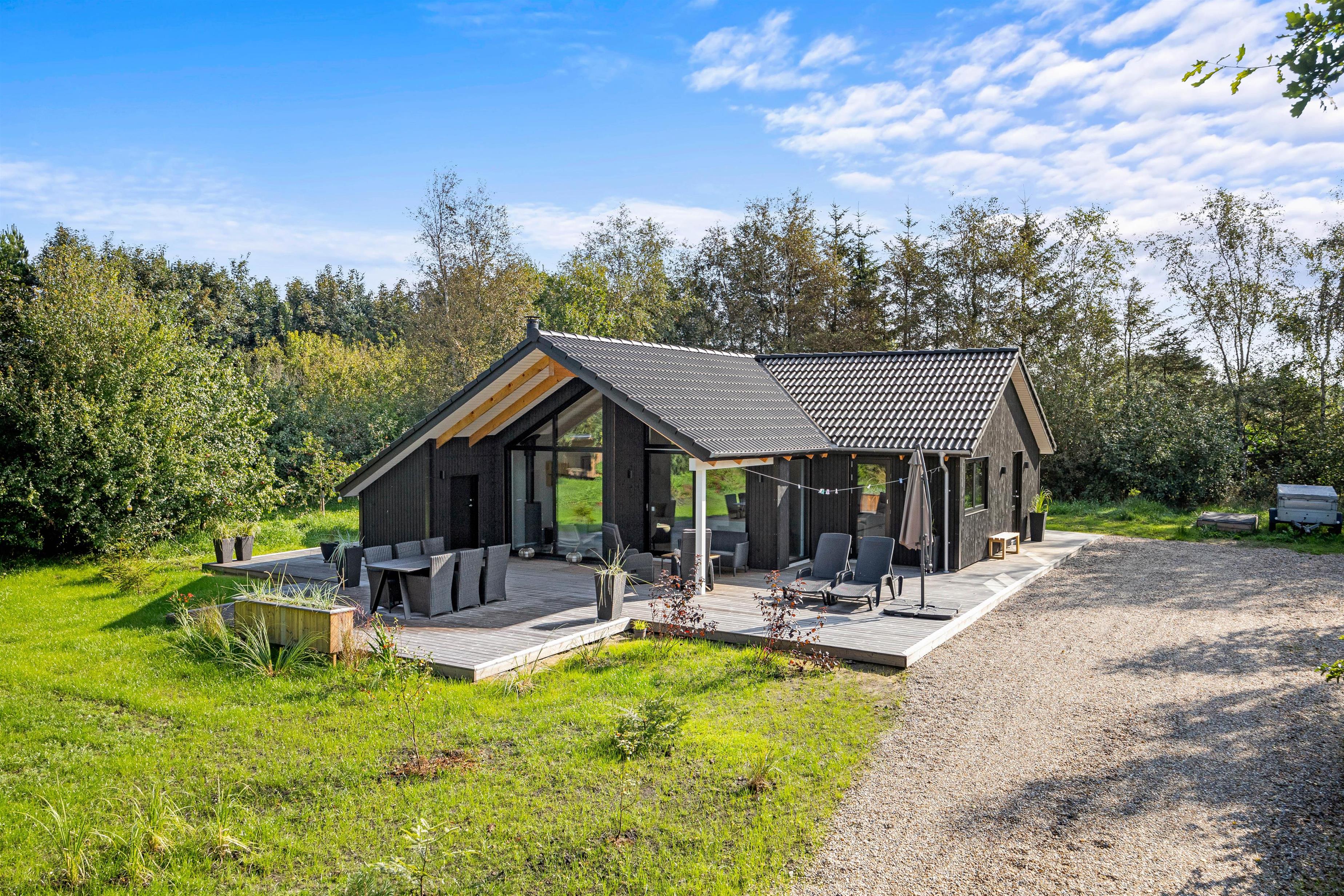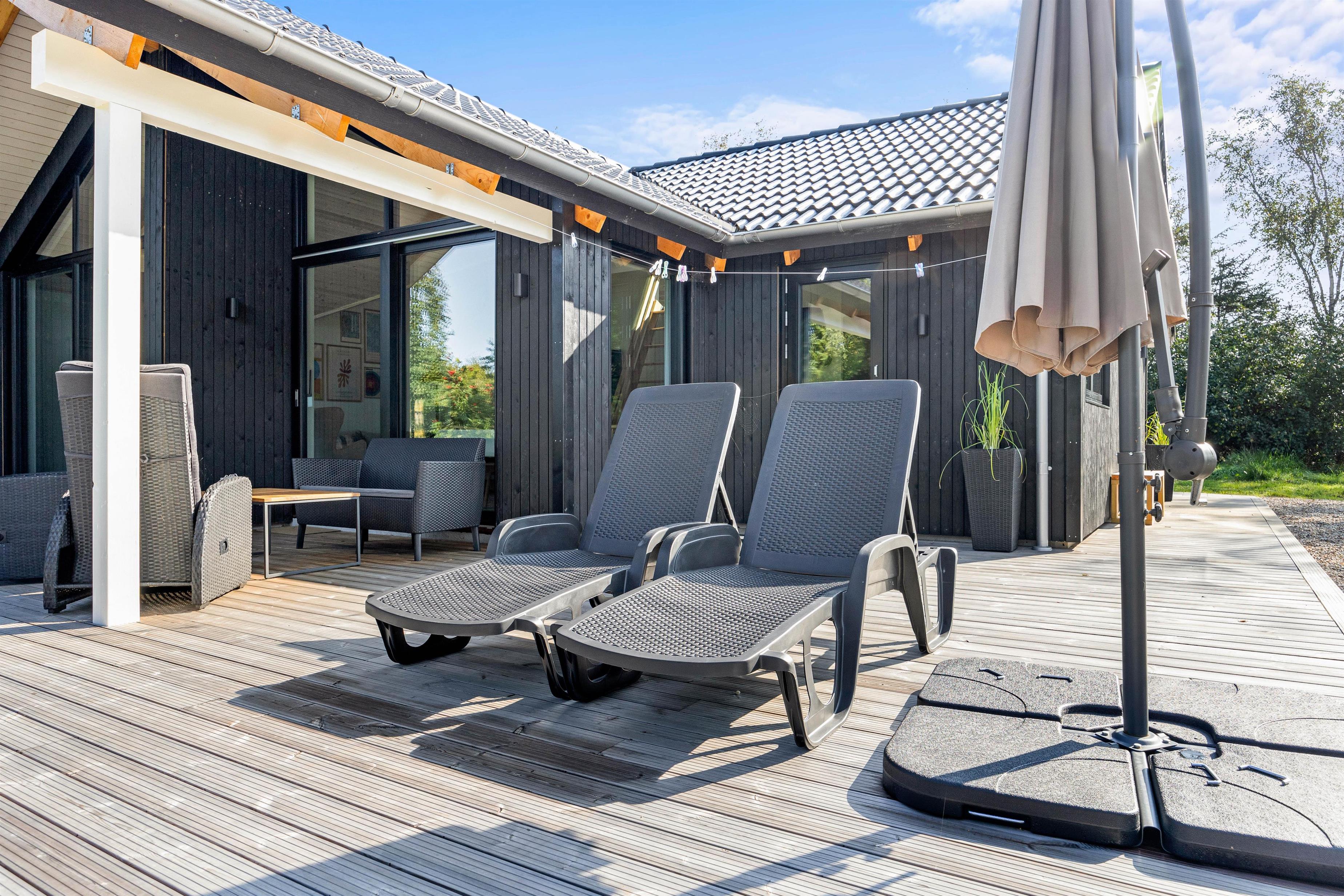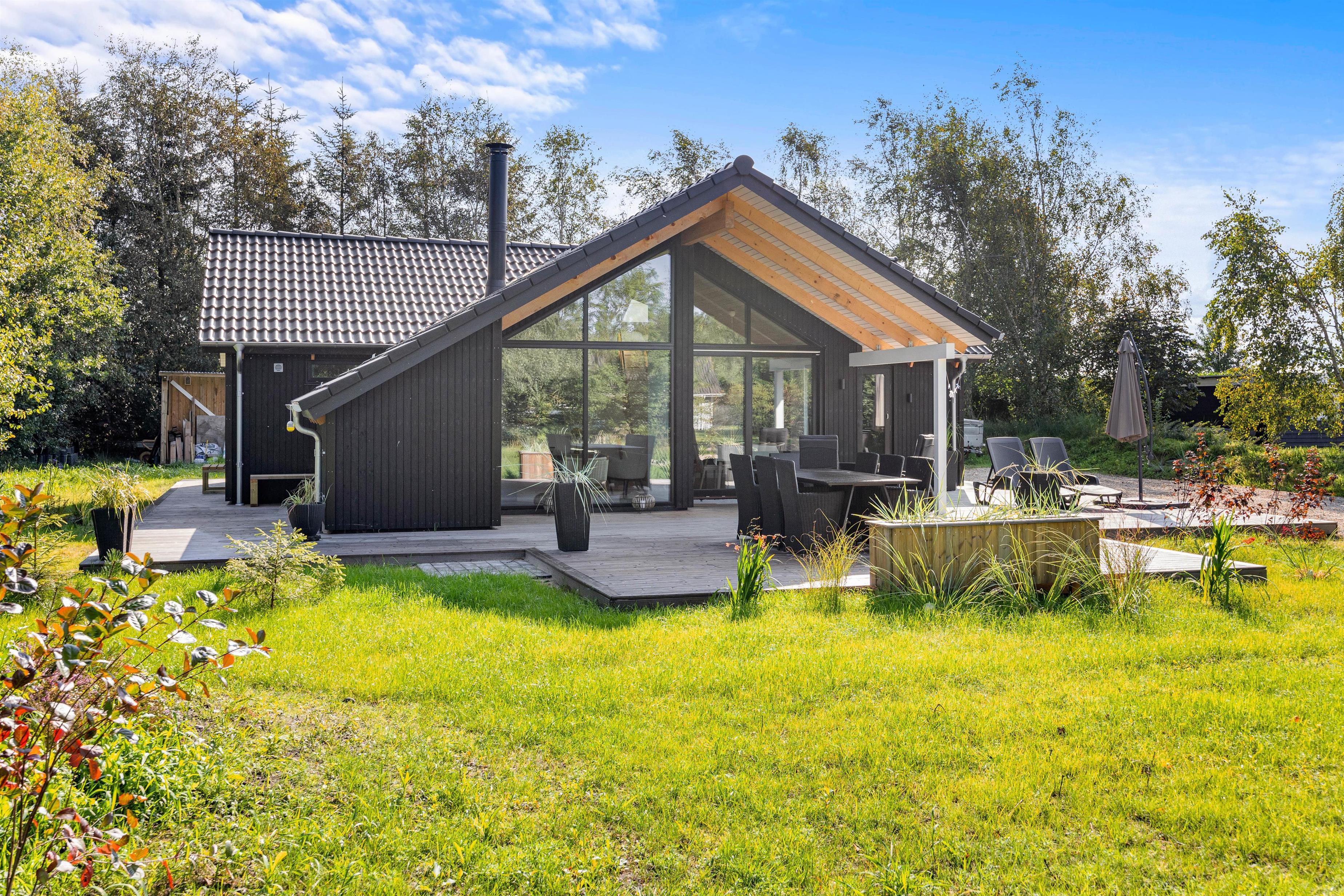 Den store træterrasse er helt fantastisk og indbyder til mange timers hygge i solskinnet. Terrassen er delvist overdækket, hvor I kan søge over i skyggen eller sidde og nyde morgenkaffe en tidlig forårsdag med udsigt over den store naturgrund. Her kan hunden trisse frit rundt.