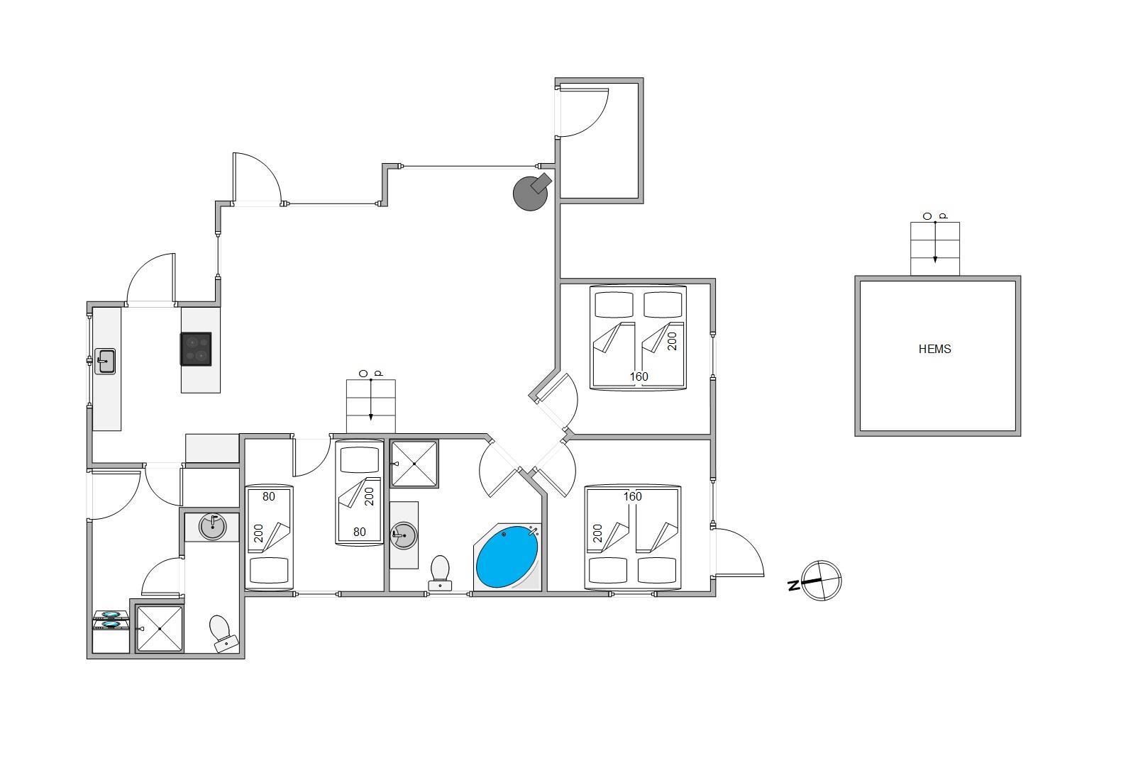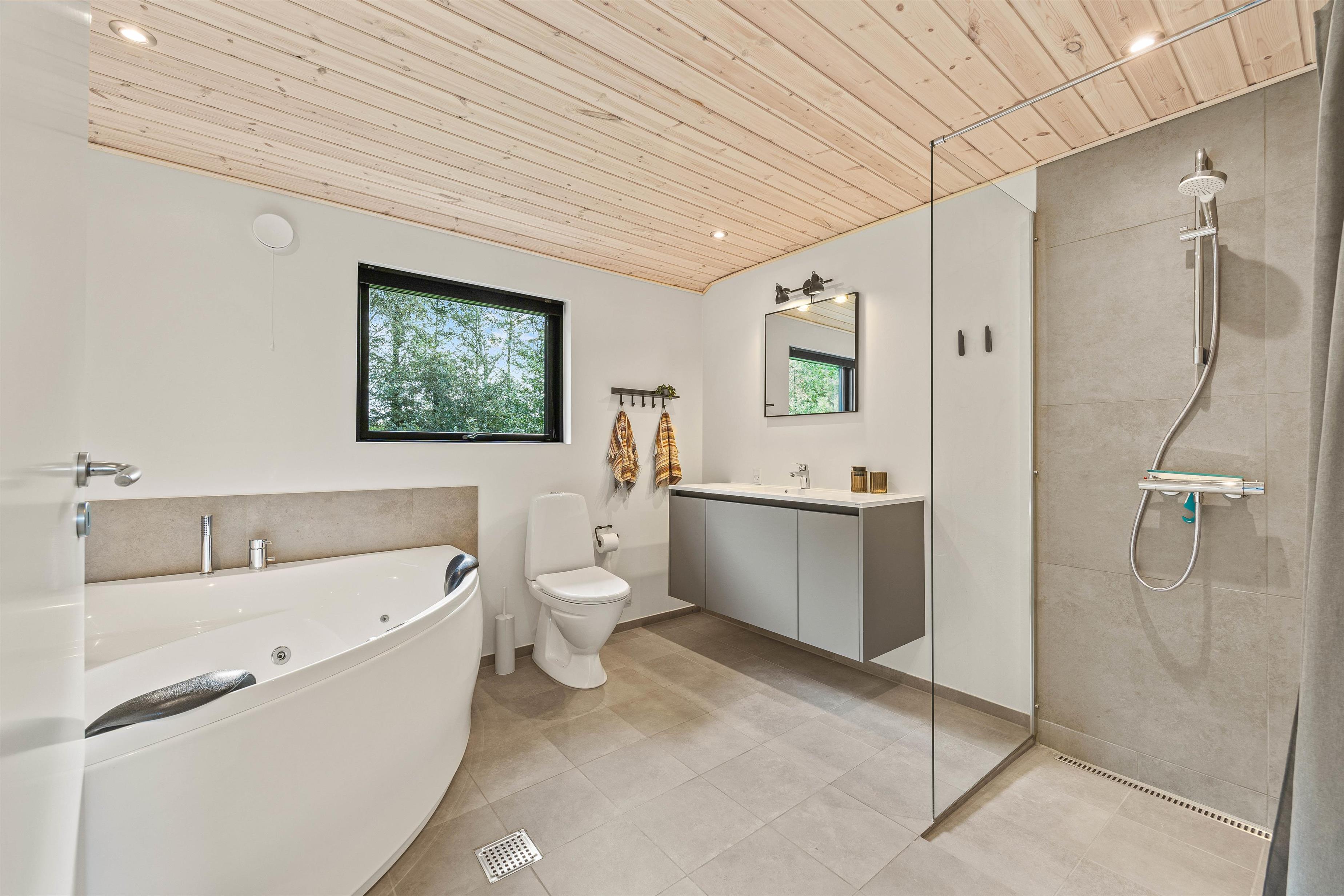 Desuden har sommerhuset to badeværelse, så I undgår at stå i kø om morgenen. Det ene badeværelse er udstyret med vaskemaskine og tørretumbler, som kombi maskine så I kan få ordnet lidt vasketøj undervejs – også superpraktisk, hvis man har småbørn med. På det andet badeværelse indbyder spaens boblende varme vand til afslapning og hvile.