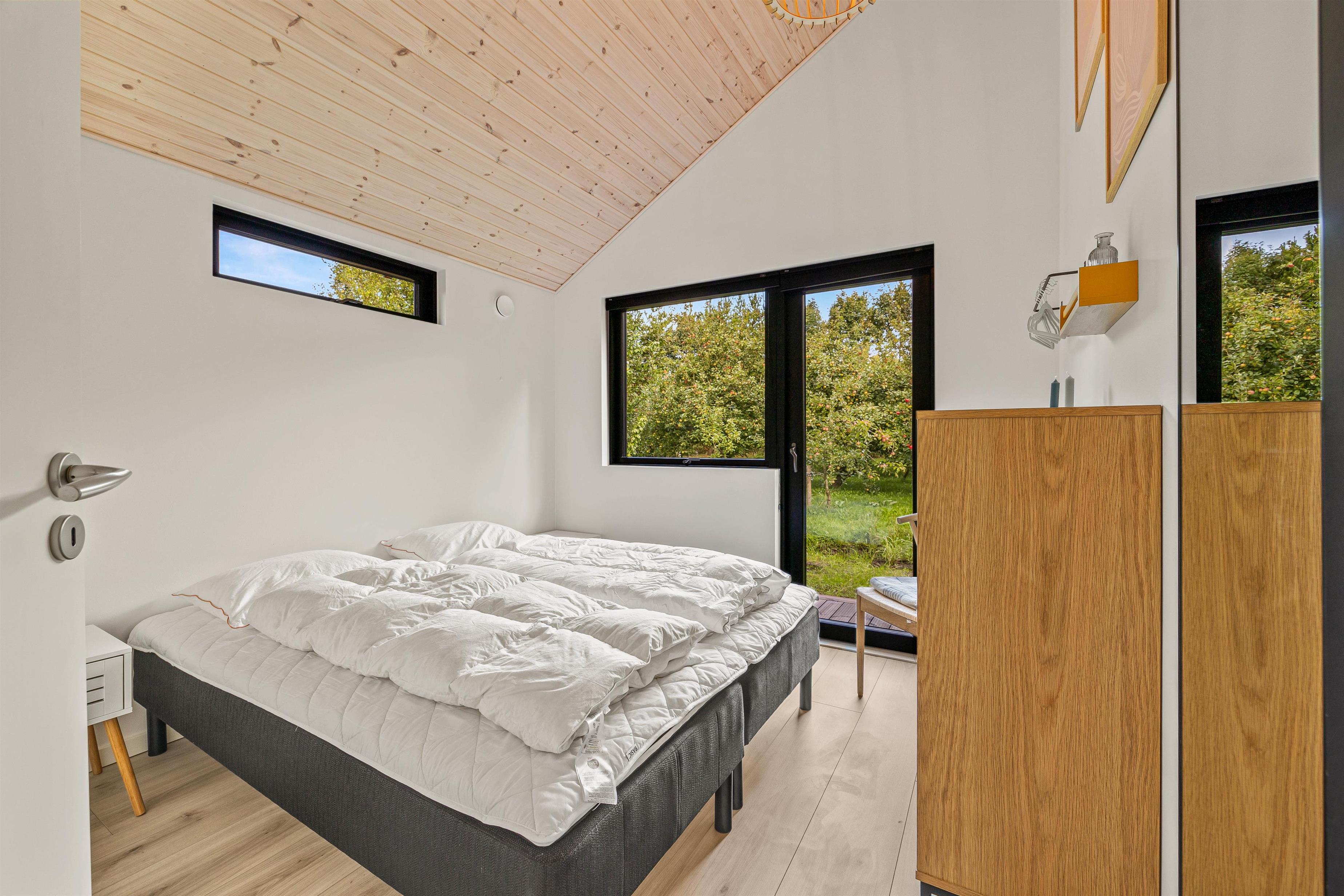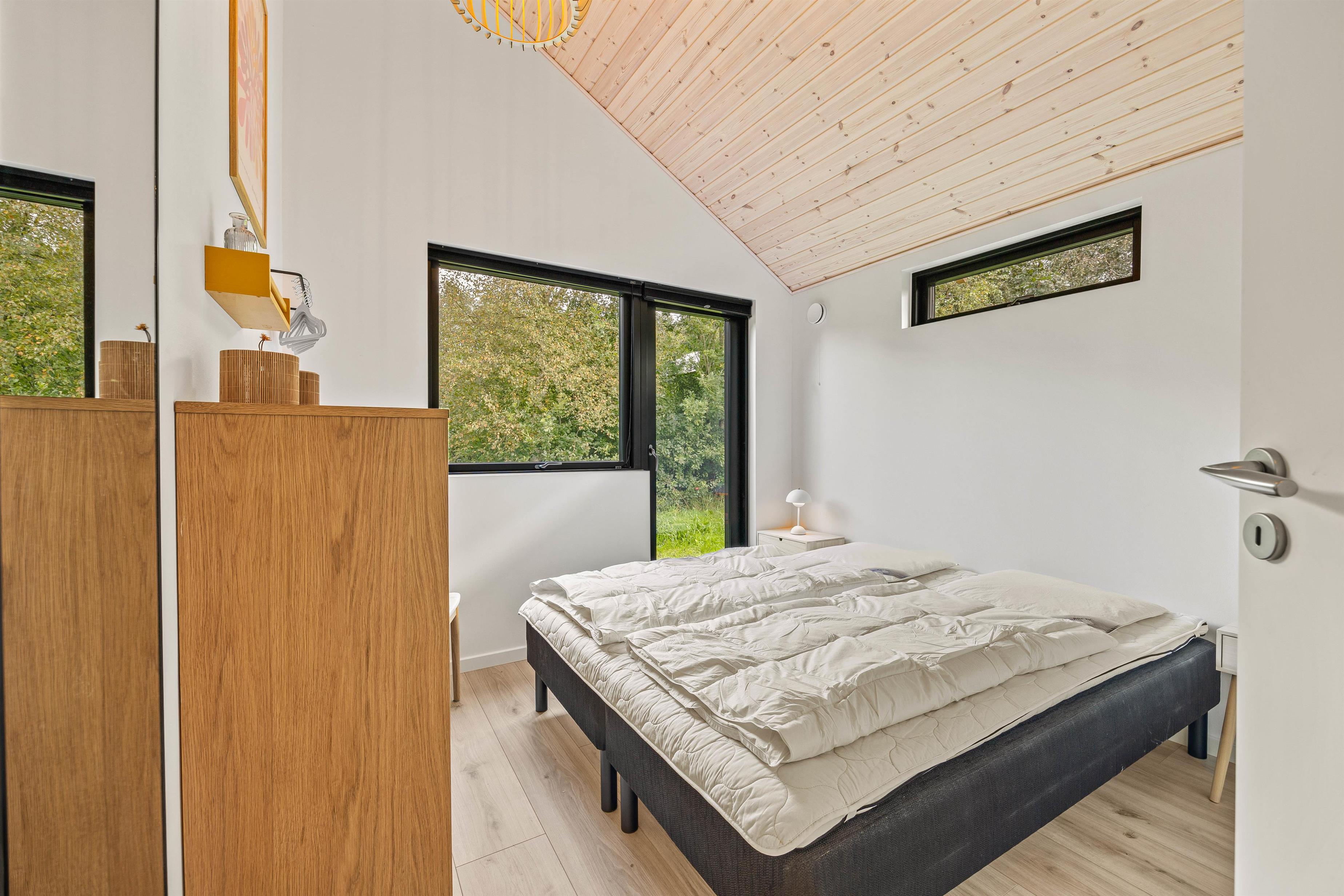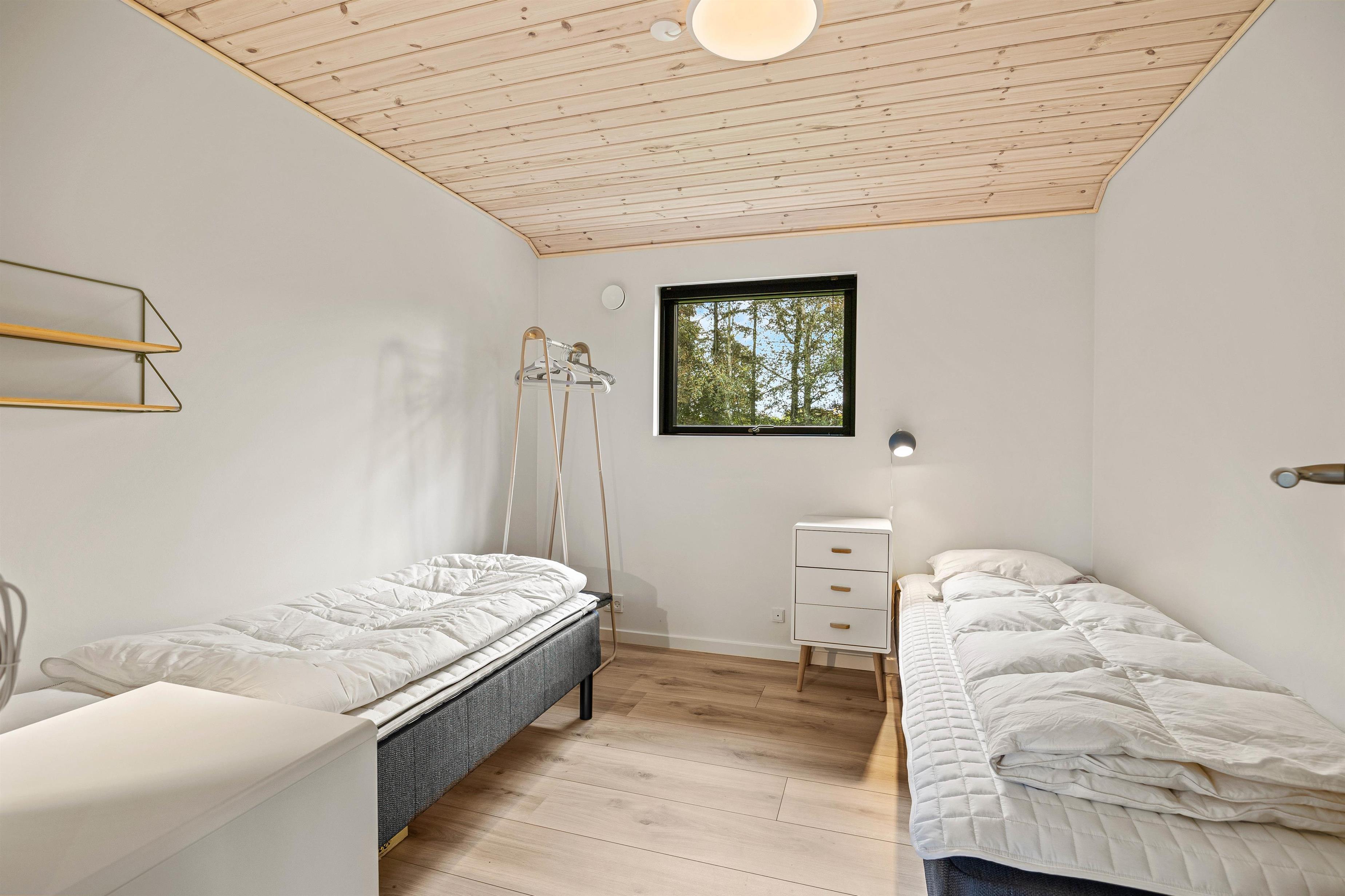 Ligesom i resten af sommerhuset er der på værelserne også højt til loftet. På de tre værelser kan I sprede jer. To af dem er med dobbeltseng og det tredje værelse er med to enkeltsenge.
