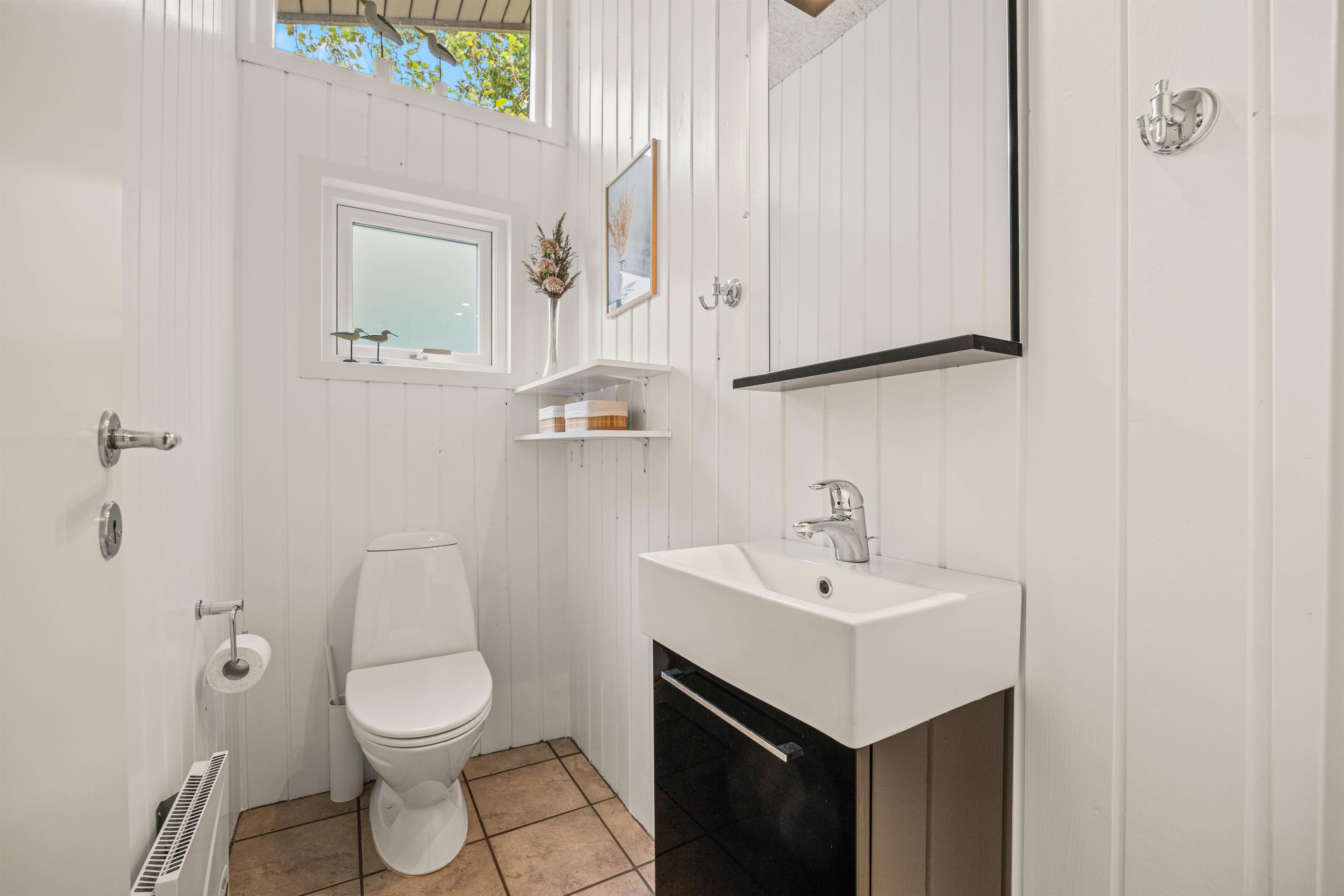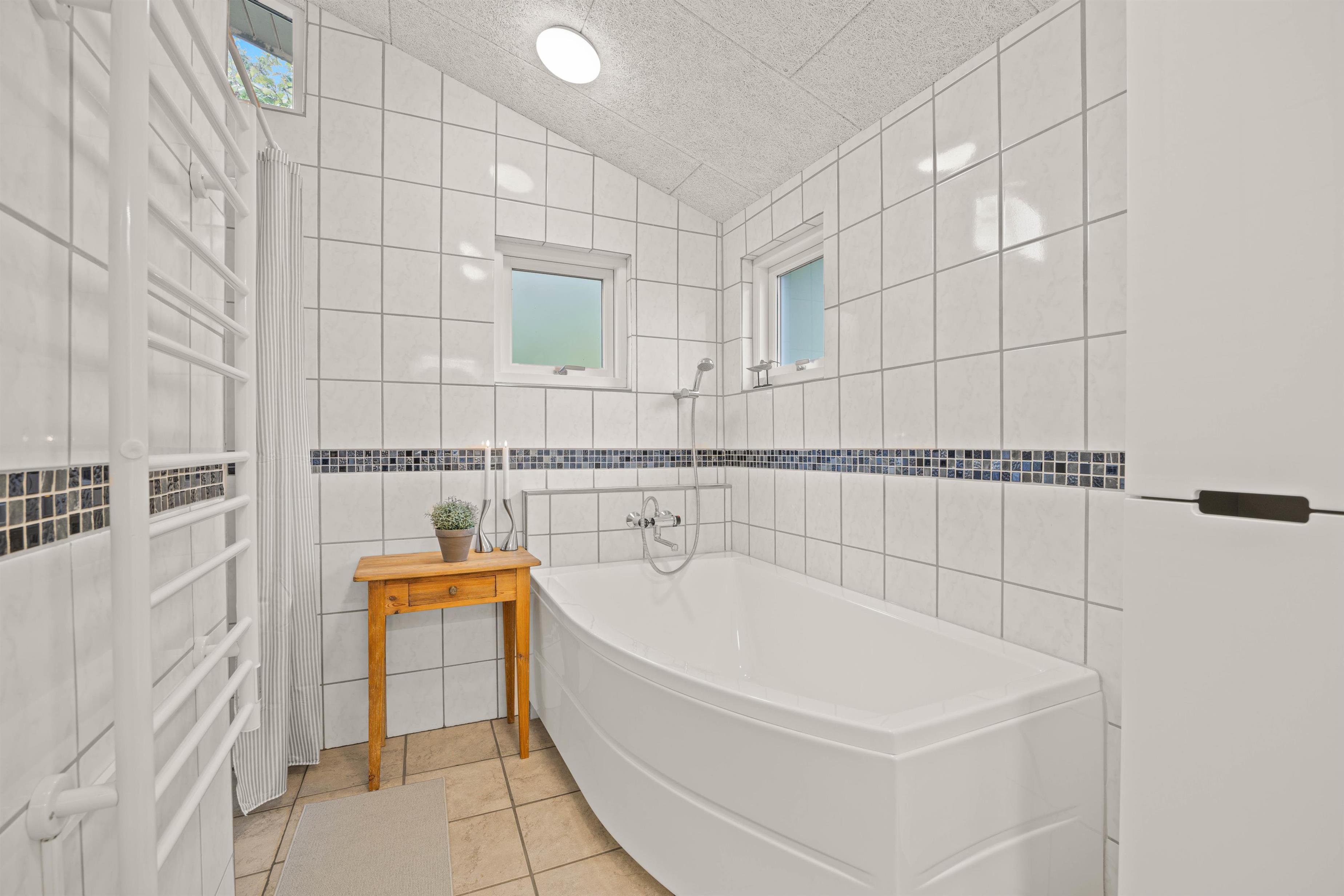 I stuen står den hyggelige brændeovn klar til at sprede varme og skaber en indbydende stemning på kølige aftener – træpillerne kan nemt købes direkte ved sommerhuset. Badeværelset med badekar indbyder til lange, afslappende bade, mens gæstetoilettet sørger for praktisk komfort, når alle skal bruge faciliteterne samtidig.
