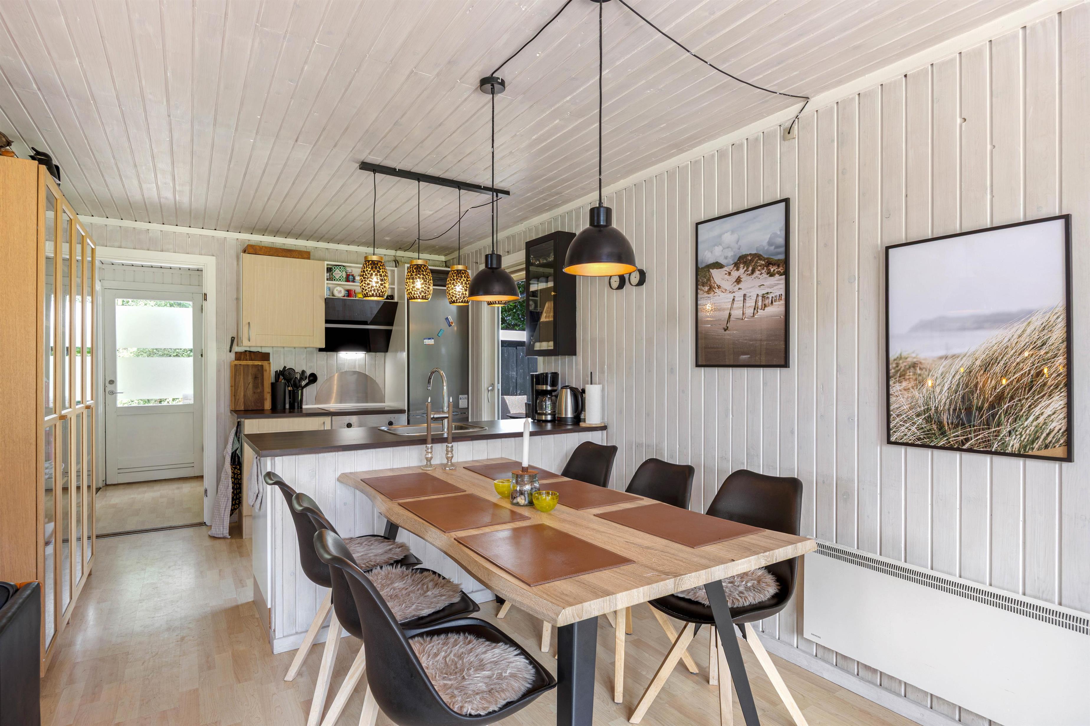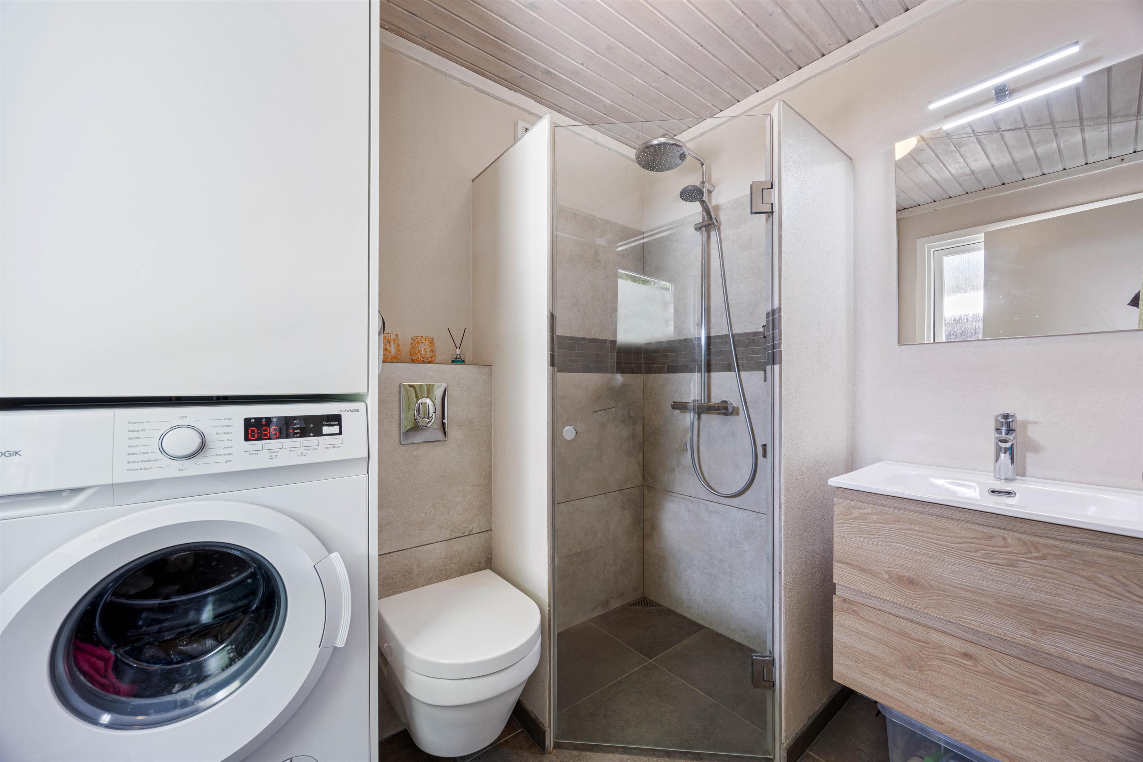 Sommerhuset er udstyret med alt, I har brug for, når I vil holde en afslappende ferie. I finder her både en opvaskemaskine og en vaskemaskine, der gør den daglige drift let som en leg. Varmepumpen, kombineret med brændeovnen, sikrer en behagelig temperatur året rundt. Badeværelset er ikke kun funktionelt, men også lækkert indrettet med gulvvarme, som er en sand fornøjelse for fødderne. Efter en lang dag kan I slappe af i det dejlige vildmarksbad eller tage et forfriskende bad under udebruseren.