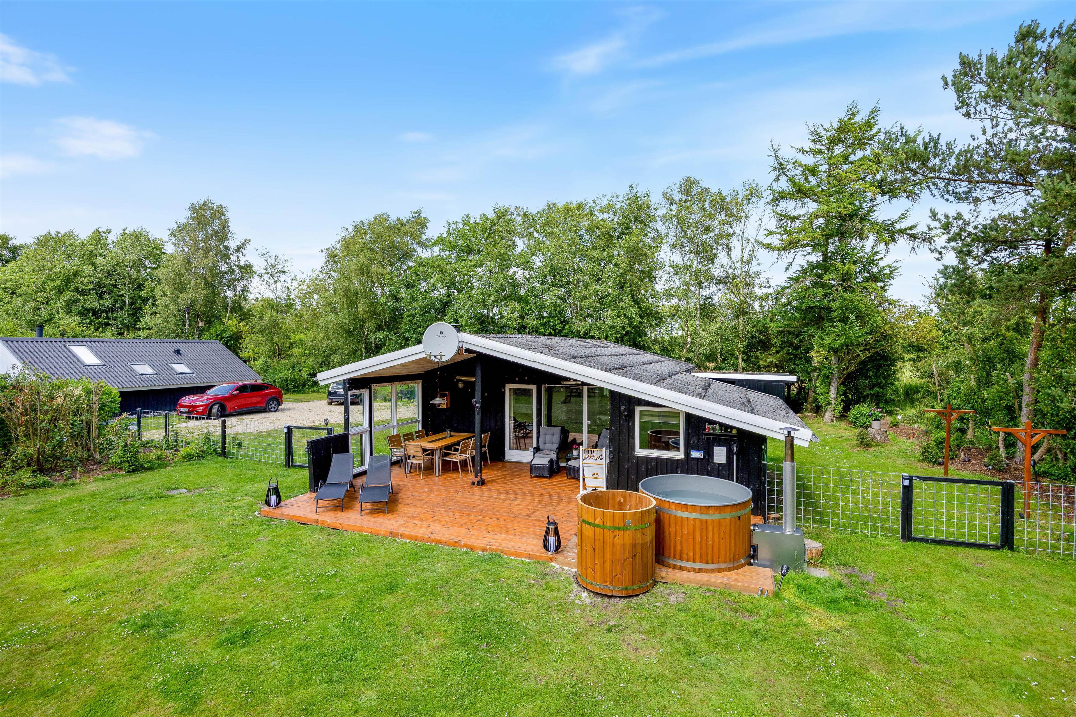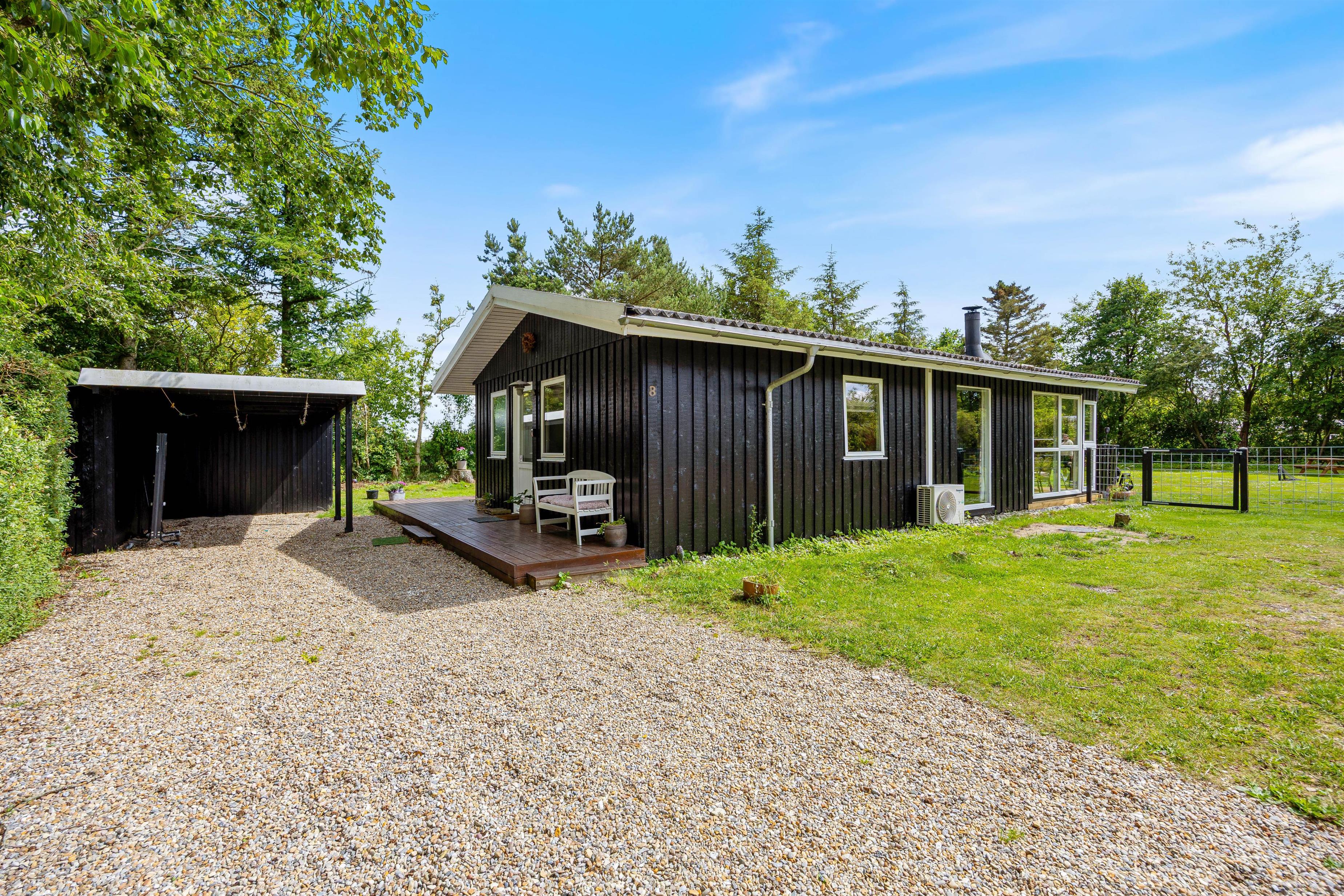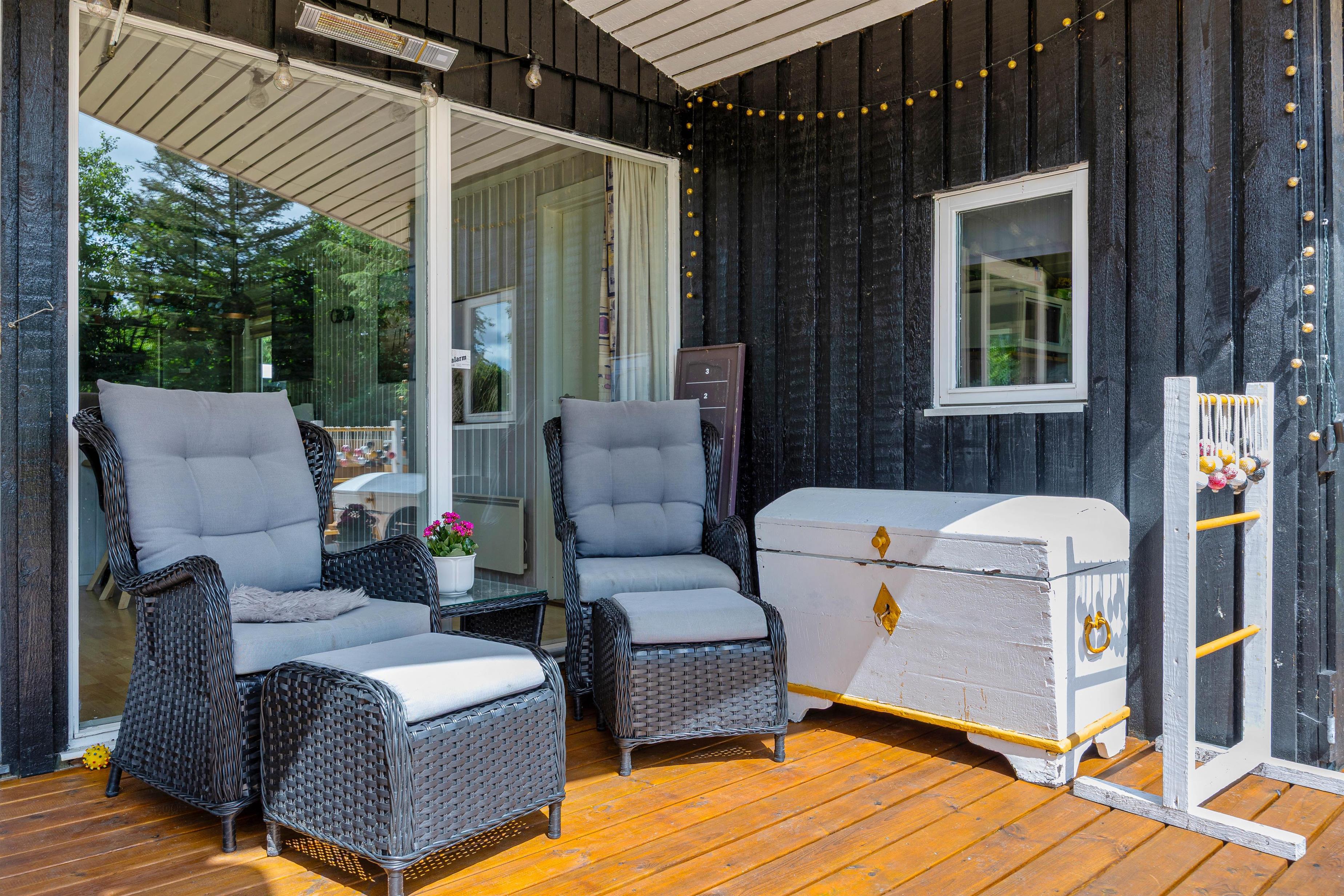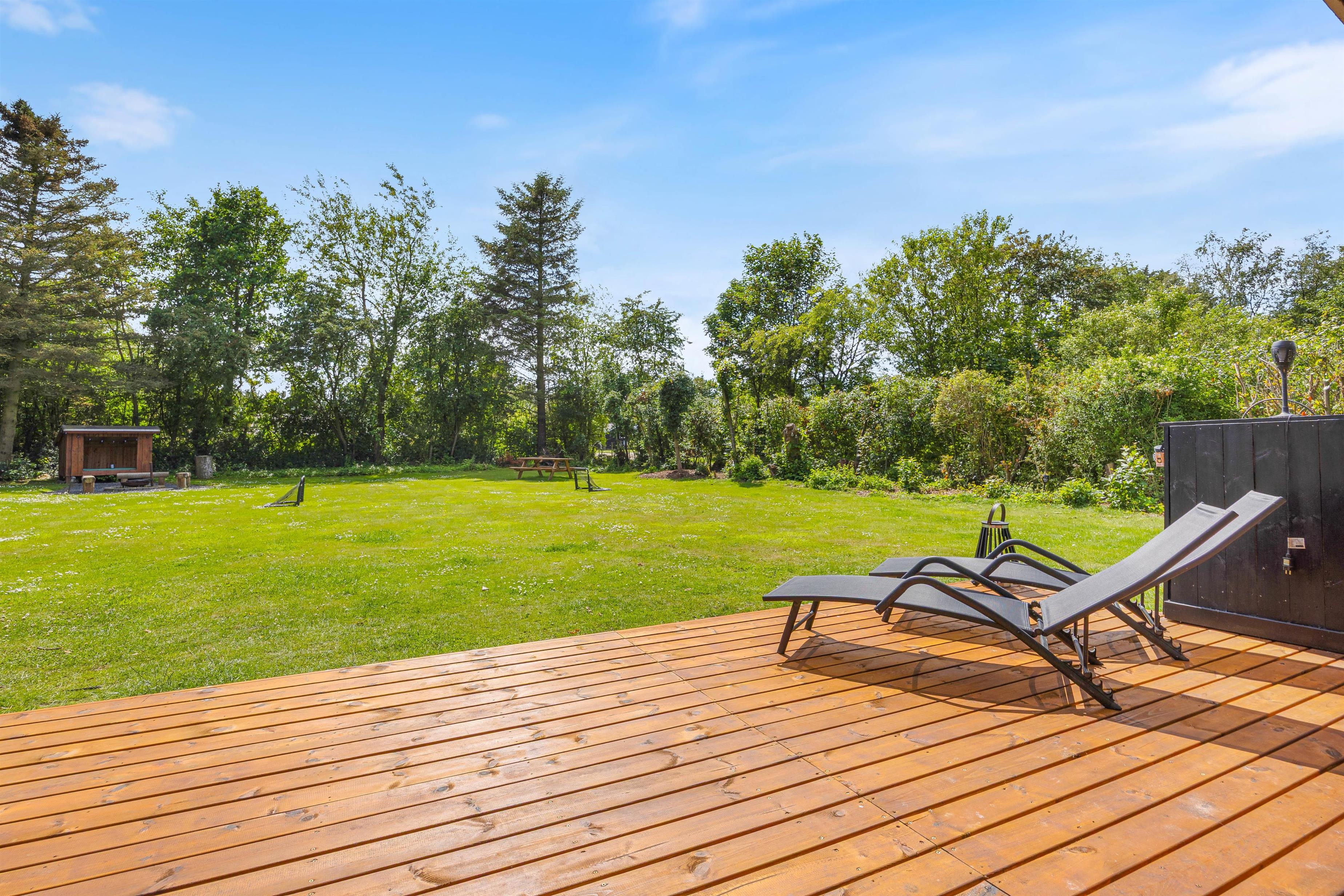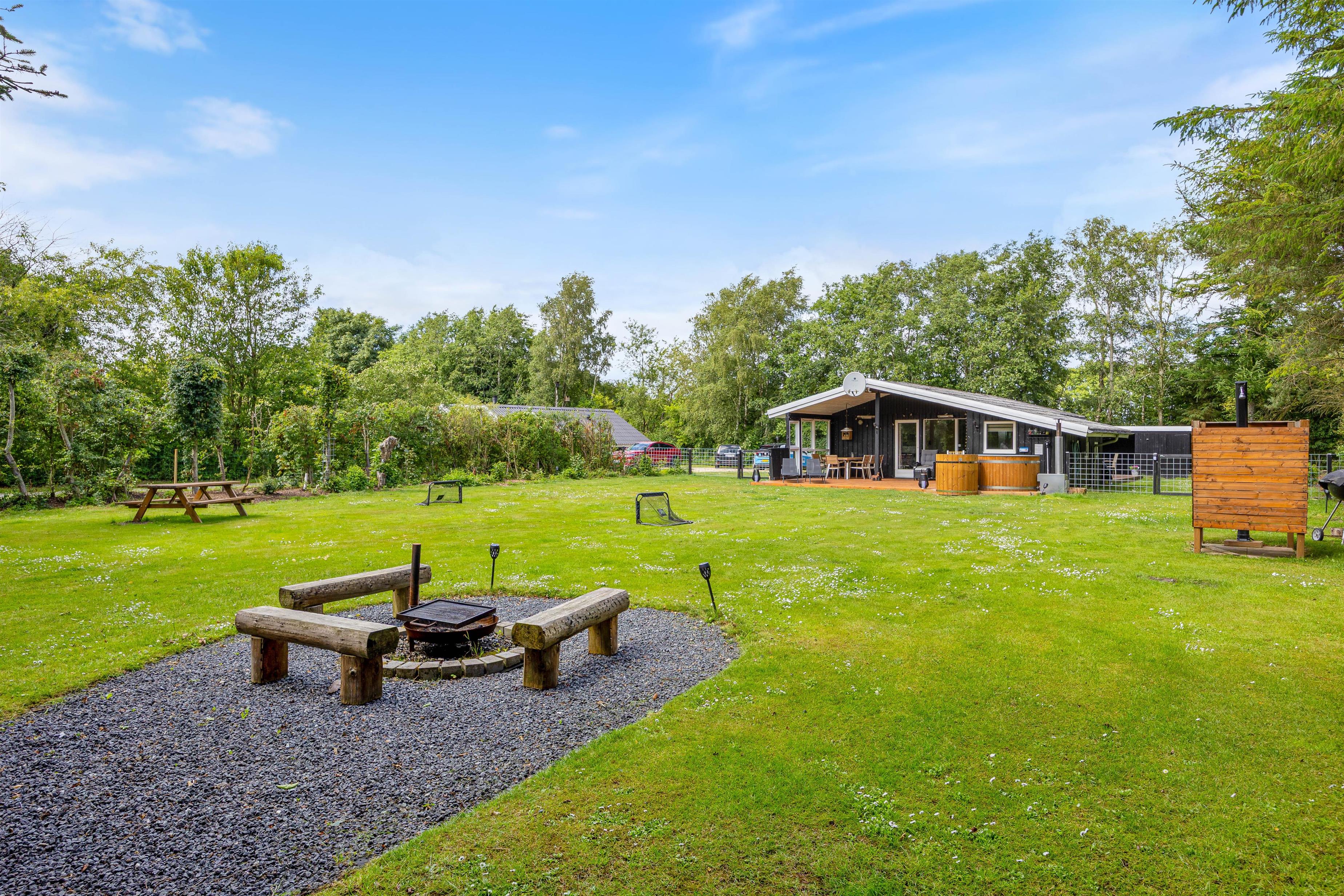 På den store 1527m2 indhegnede grund kan I nyde de udendørs muligheder til fulde. Sommerhuset tilbyder en overdækket terrasse, der er perfekt til hyggelige sommeraftener. Tænd op i grillen, sæt jer i havemøblerne, og nyd en lækker middag med jeres kære. Der er rigeligt med plads til leg og afslapning, så børn og hunde kan boltre sig frit og sikkert. Skal I en tur til stranden, ligger havet kun 10 km væk, hvilket gør det nemt at inkludere en strandtur i jeres dagsprogram.