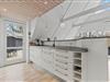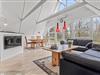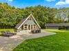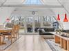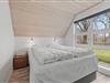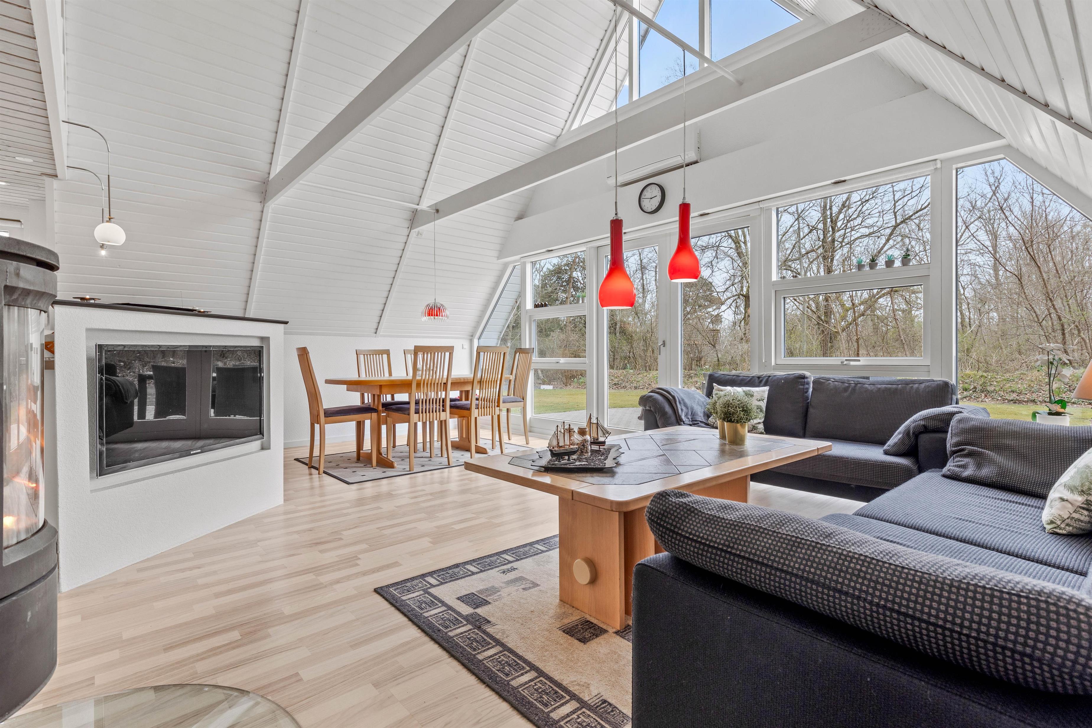 De lyse gulve og vægge samt et loft til kip med synlige bjælker er kendetegnene ved dette sommerhus - dertil en stor vinduesfront med udsigt til det grønne udenfor, der lader naturligt lys strømme ind og bringer naturen helt tæt på.