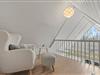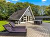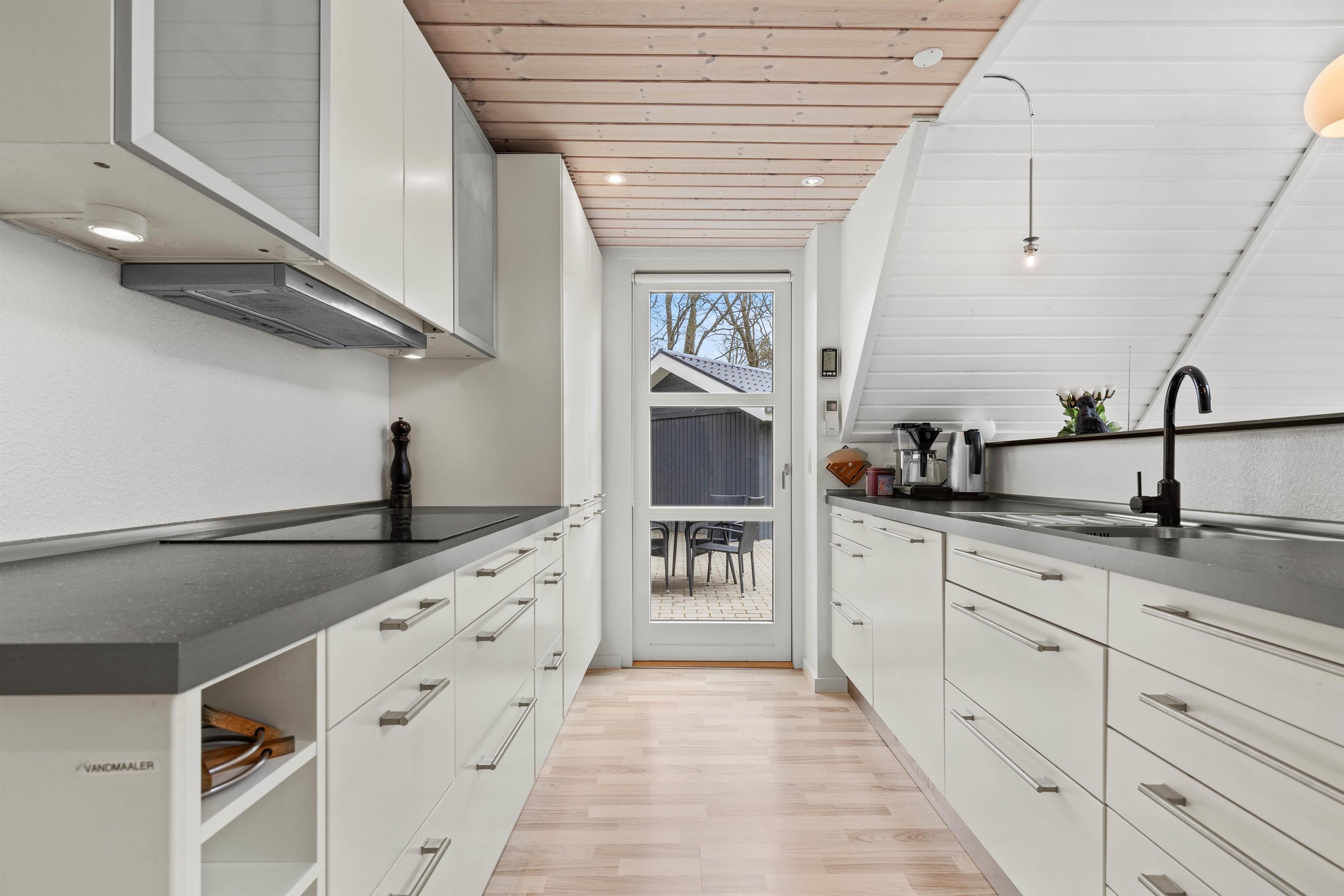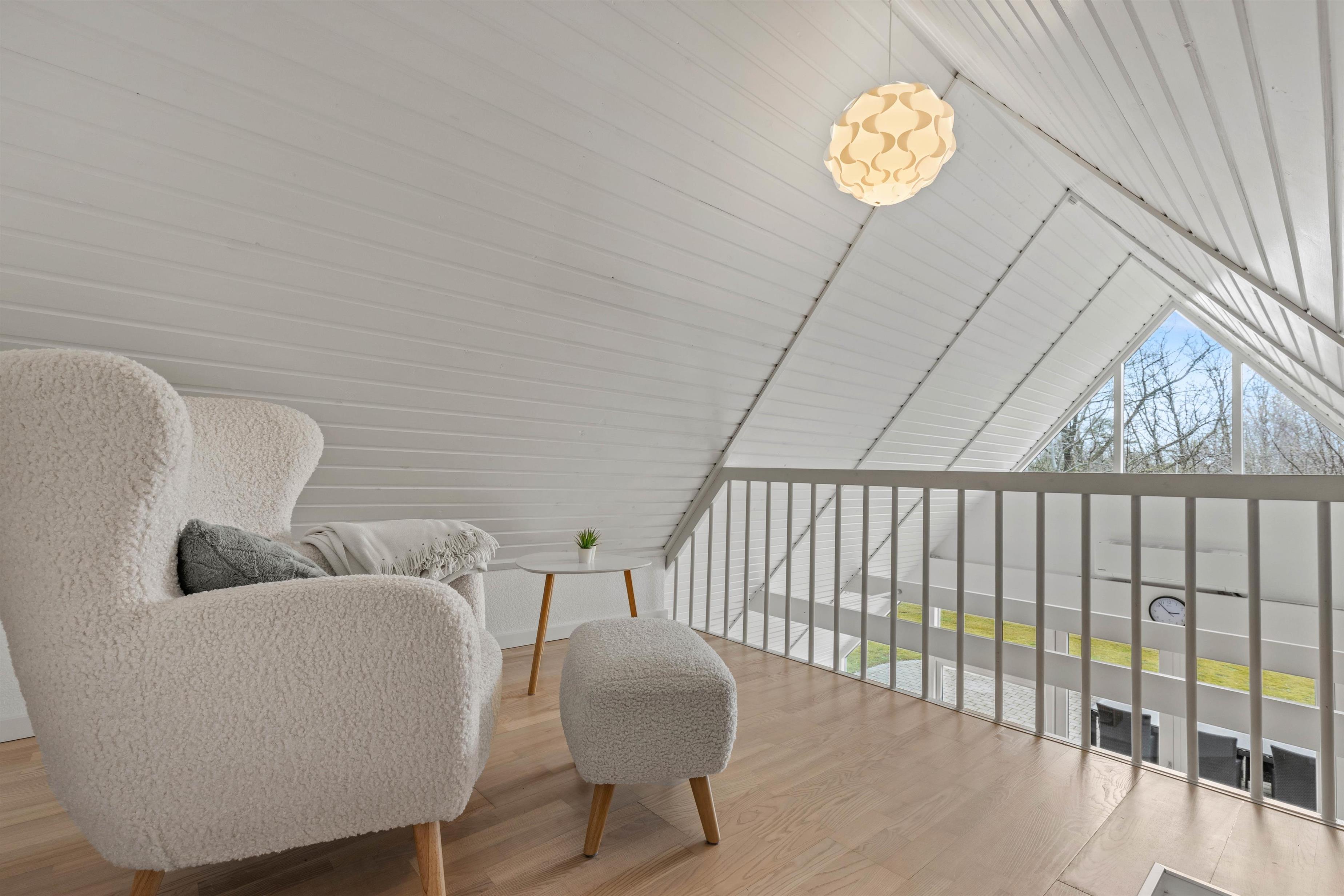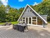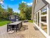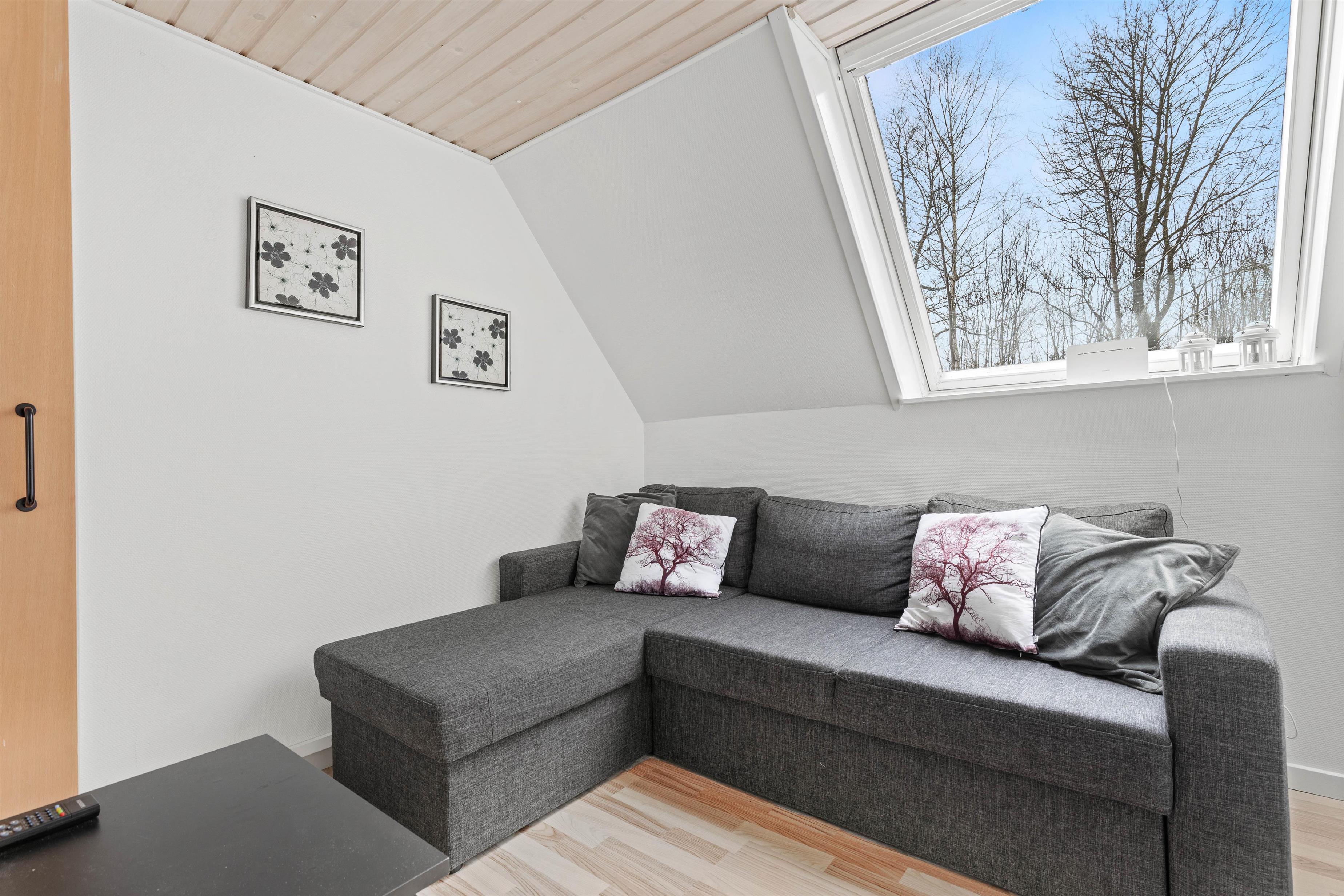 Udenfor finder I en skøn åben terrasse, der er tilgængelig direkte fra stuen. Her kan I slå jer ned i liggestolene og nyde sommerhusets afslappende atmosfære. De omkringliggende høje træer skaber en naturlig afskærmning, der sikrer jer privatliv og giver jer mulighed for at nyde naturens fred og ro.