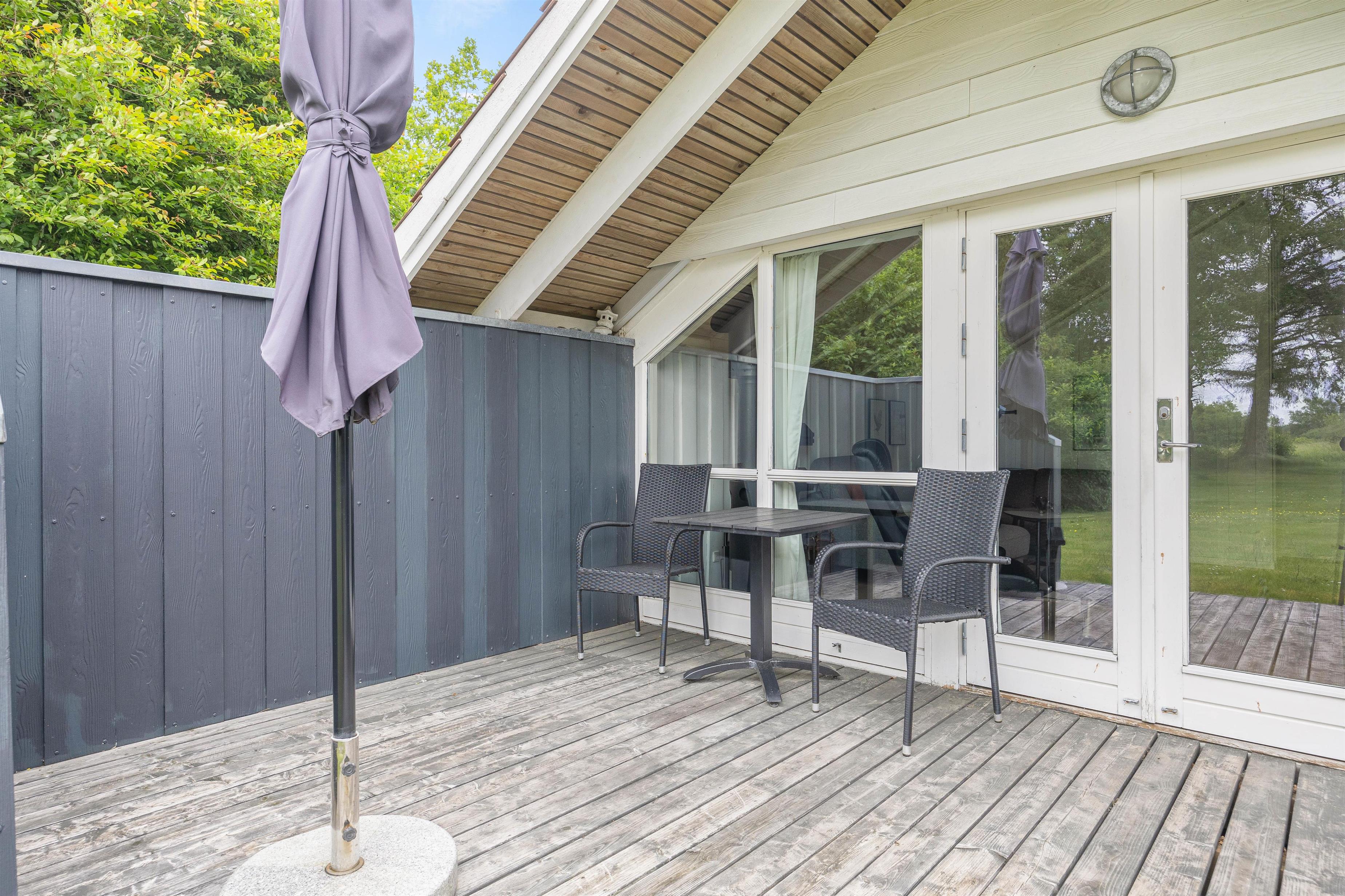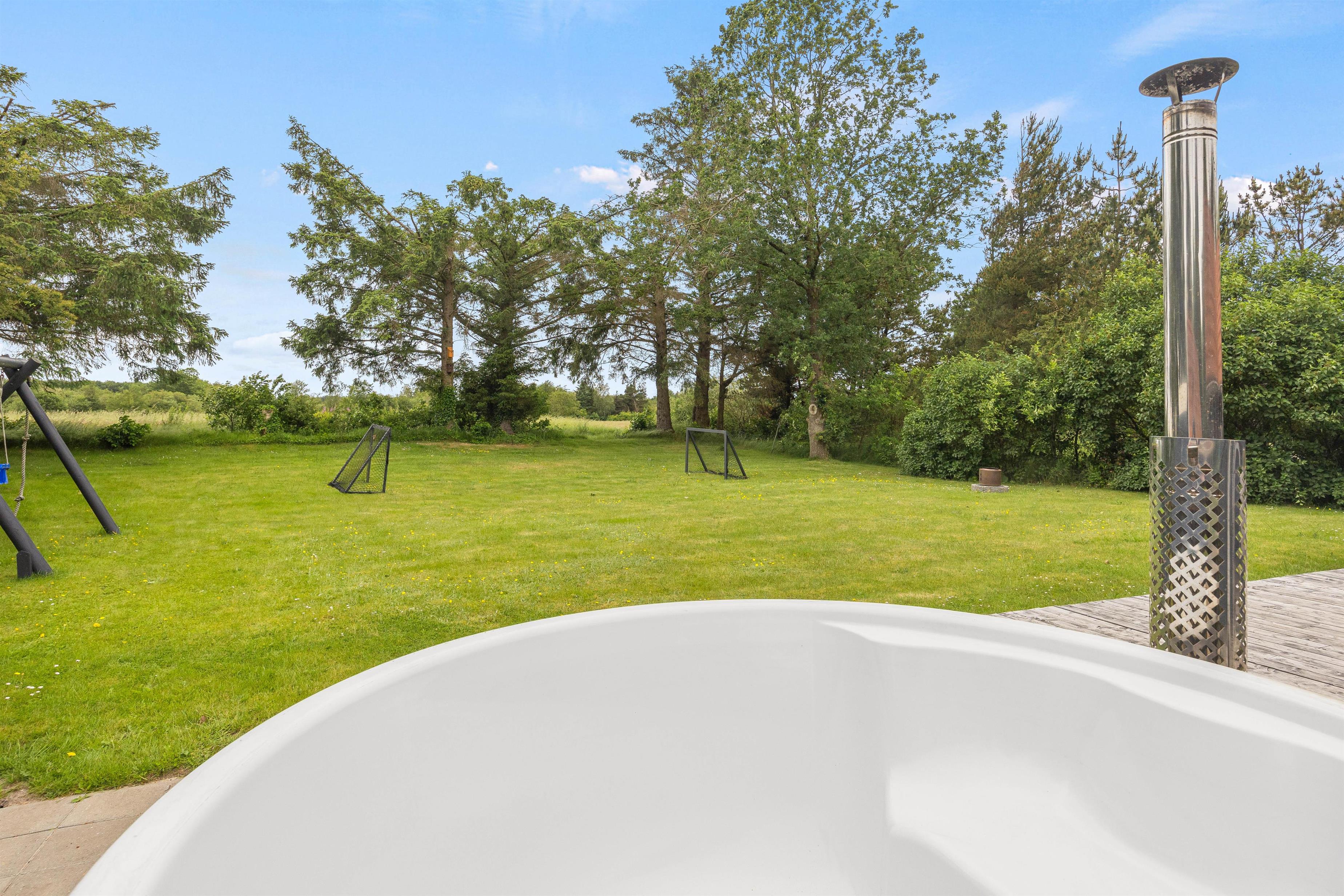 Fra stuen træder I ud på den store træterrasse i syd, som i modsatte hjørne er forbundet med en fliseterrasse på feriehusets østlige side. Mellem de 2 terrasser finder I et af højdepunkterne her; nemlig vildmarksbadet, hvor I kan sidde i det varme vand og se stjernerne glimte på himlen – hvilken perfekt afslutning på dagen.
