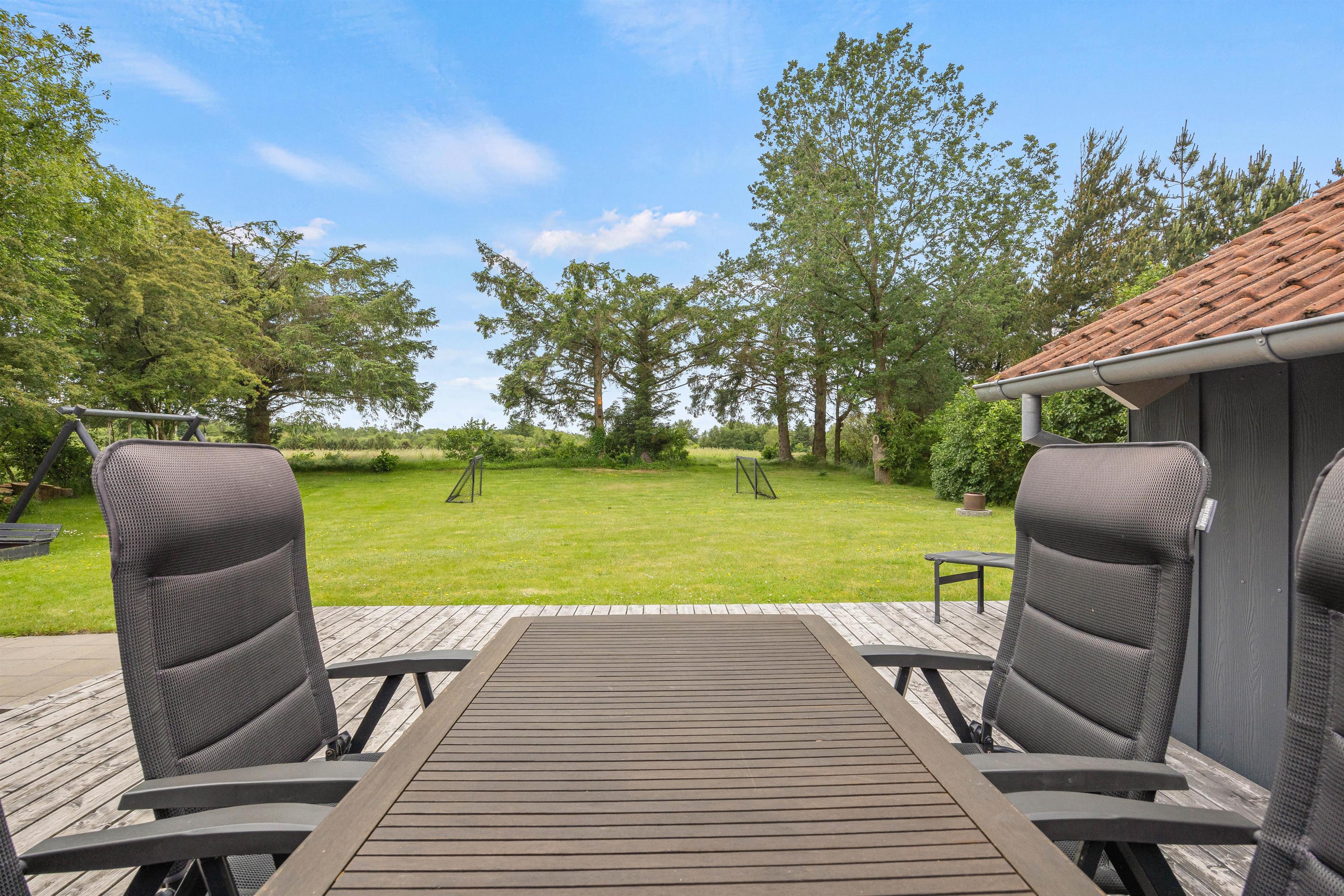 Mens det knitrer i brændeovnen og hyggen spreder sig, kan øjet hvile med udsigten over de smukke marker, der strækker sig så langt øjet rækker. Temperaturen kan I holde behagelig ved hjælp af den energibesparende varmepumpe, mens I fra stuen også har direkte adgang til den store træterrasse og have.