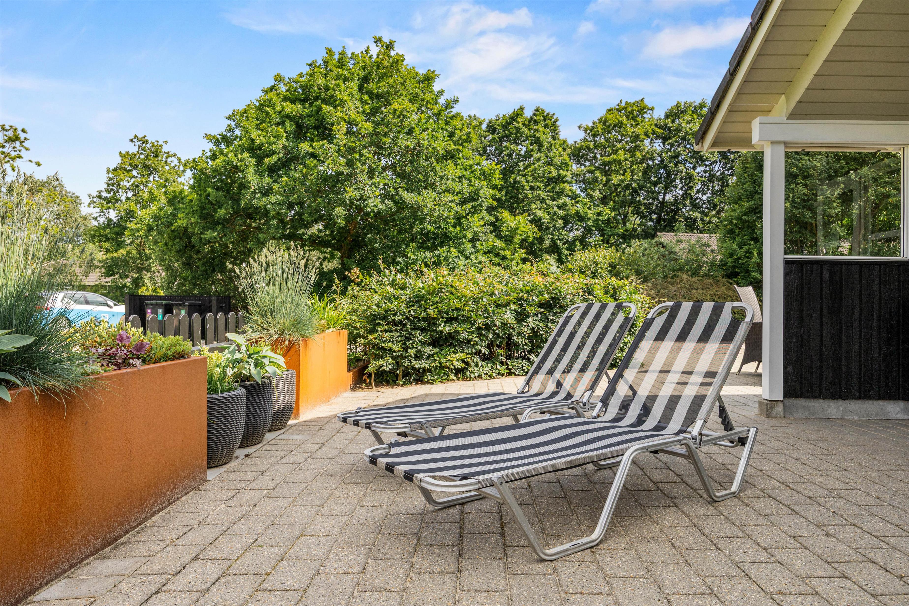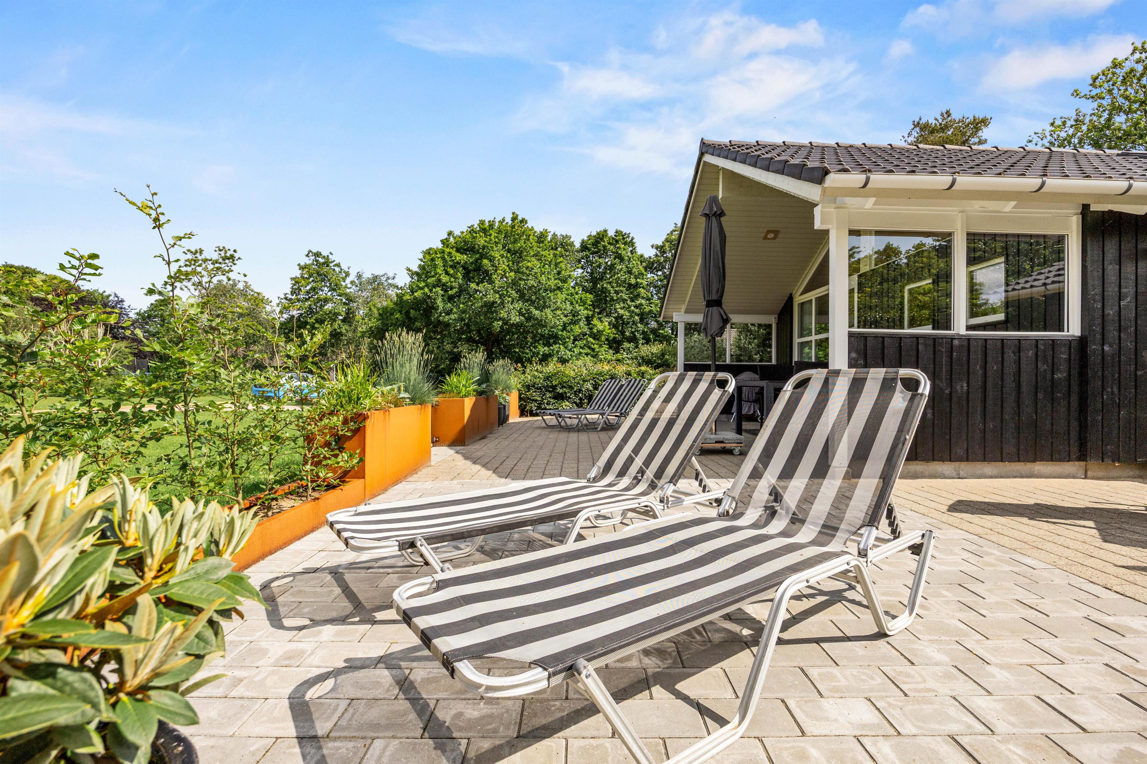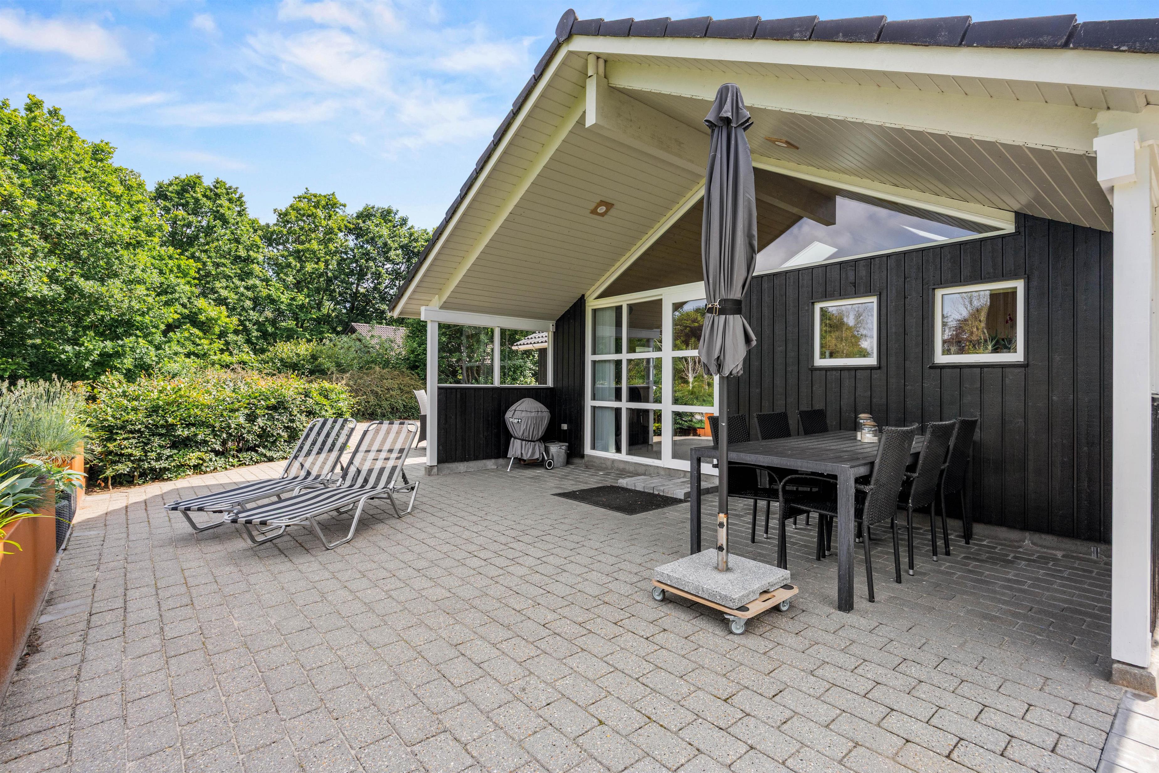 Fra stuen kan I træde ud på den delvist overdækkede terrasse, hvor morgenens første solstråler kan nydes med en lækker brunch. Om aftenen kan I tænde op i grillen og nyde et BBQ-måltid under åben himmel. Når solen står højt på himlen, indbyder solvognene til afslapning, mens parasollen tilbyder en behagelig skyggeplads til dem, der foretrækker at læse en god bog.