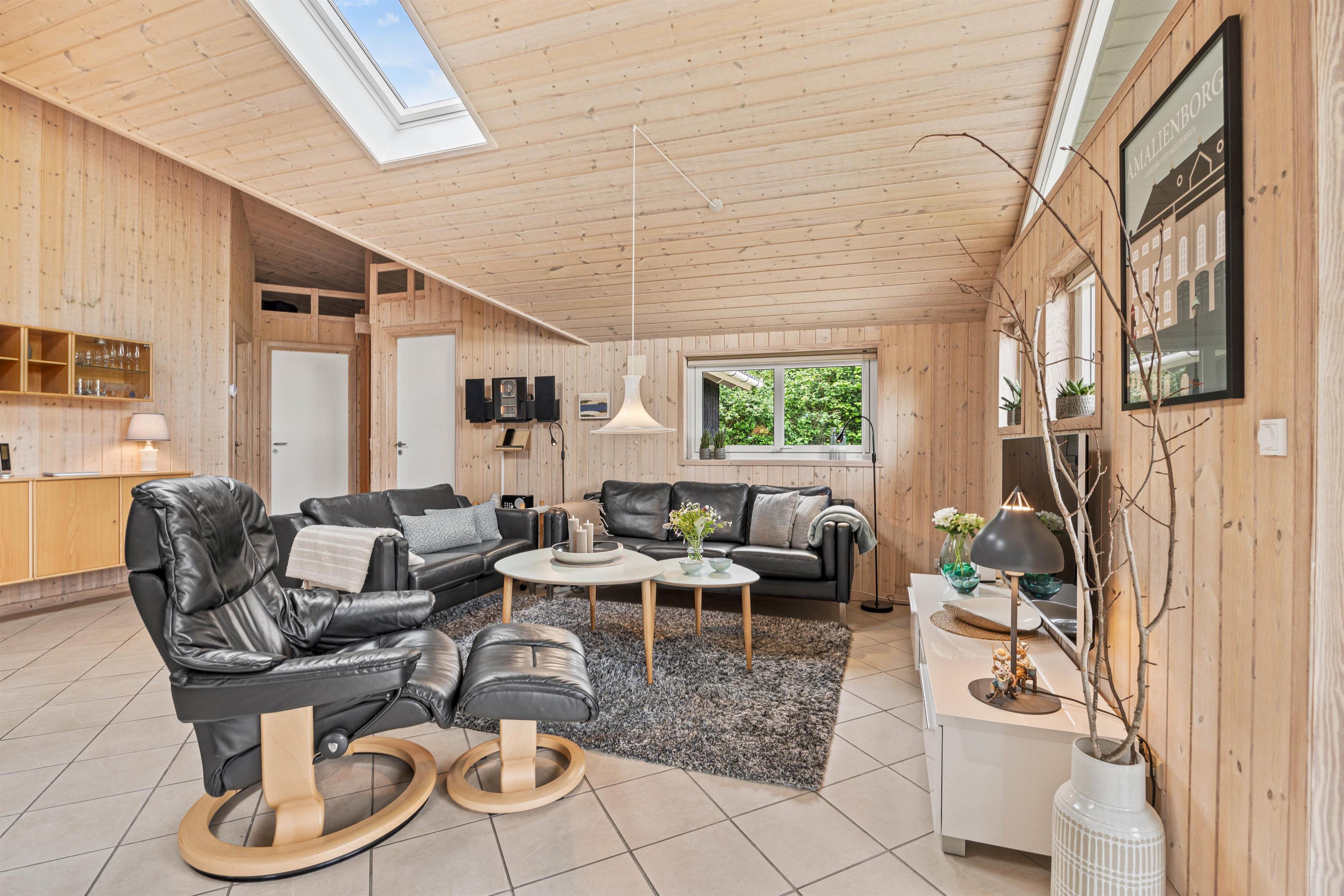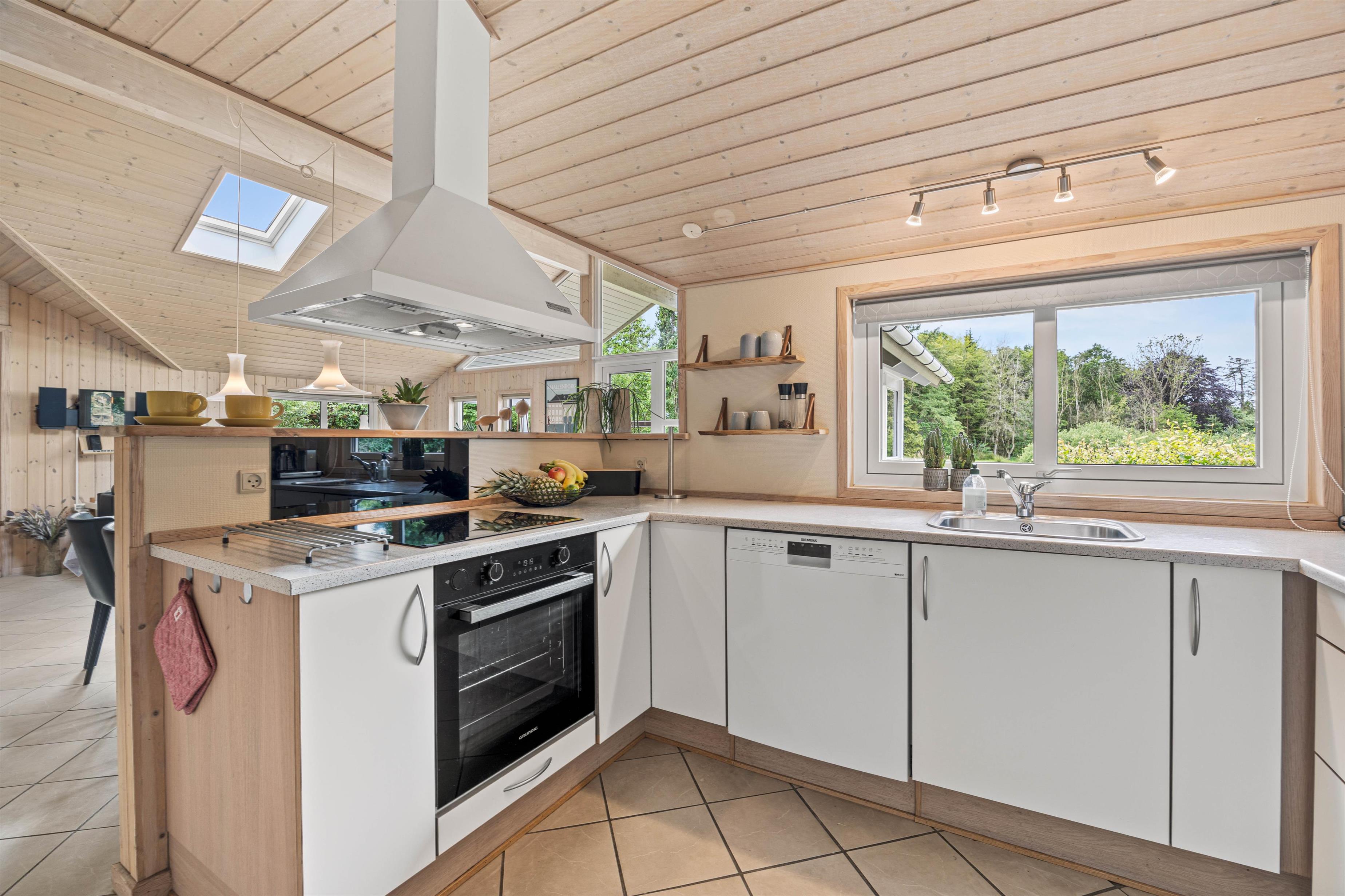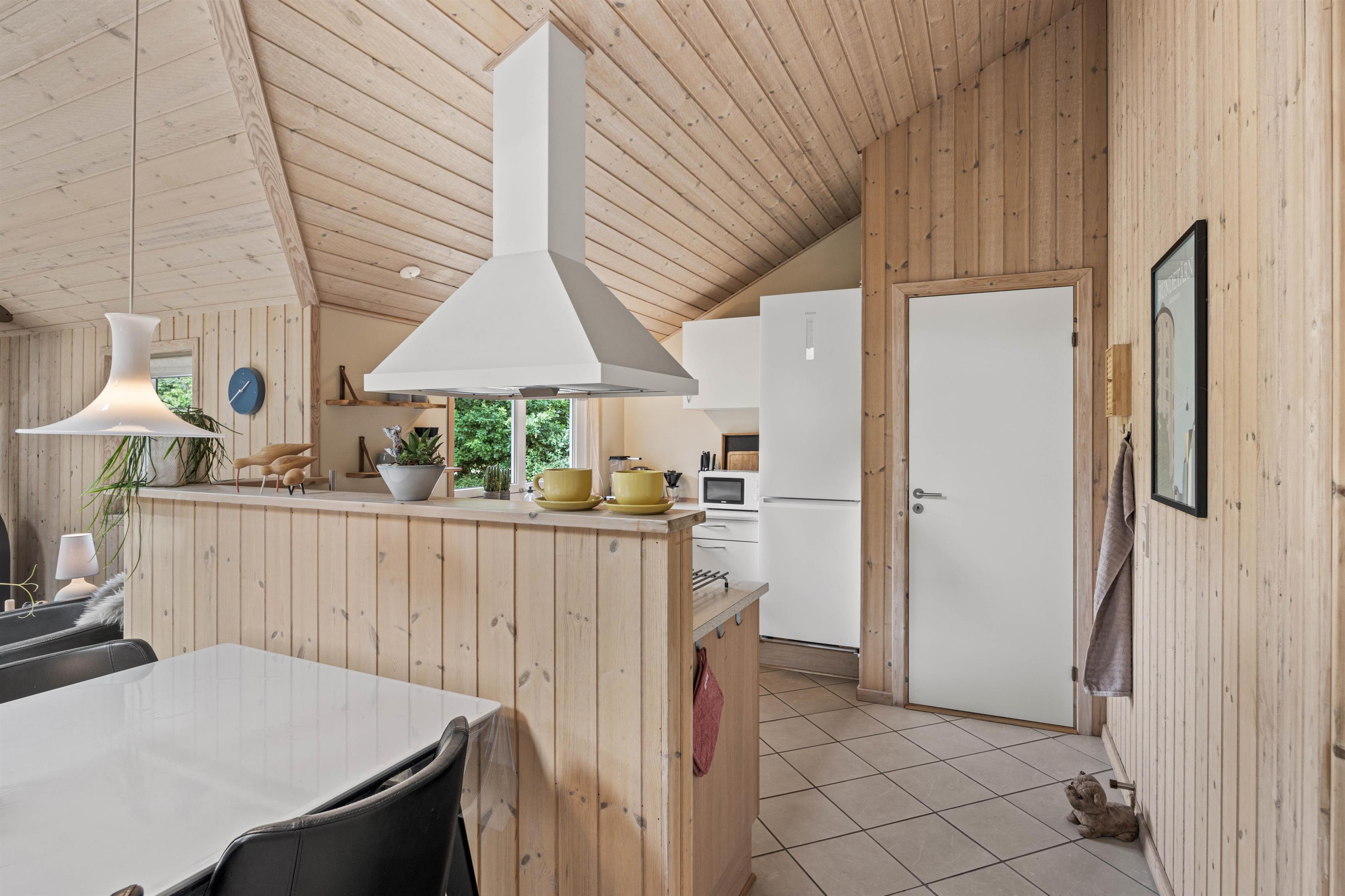 Indenfor venter et åbent køkkenalrum, som skaber en rummelig og indbydende atmosfære. I køkkenet finder I en praktisk opvaskemaskine, der gør oprydningen nem, så I hurtigt kan vende tilbage til feriehyggen. Stuen er udstyret med en hyggelig brændeovn, der virkelig fremhæver den klassiske sommerhuscharme. Her kan I læne jer tilbage og nyde varmen, mens I streamer jeres yndlingsfilm og serier via sommerhusets Chromecast.