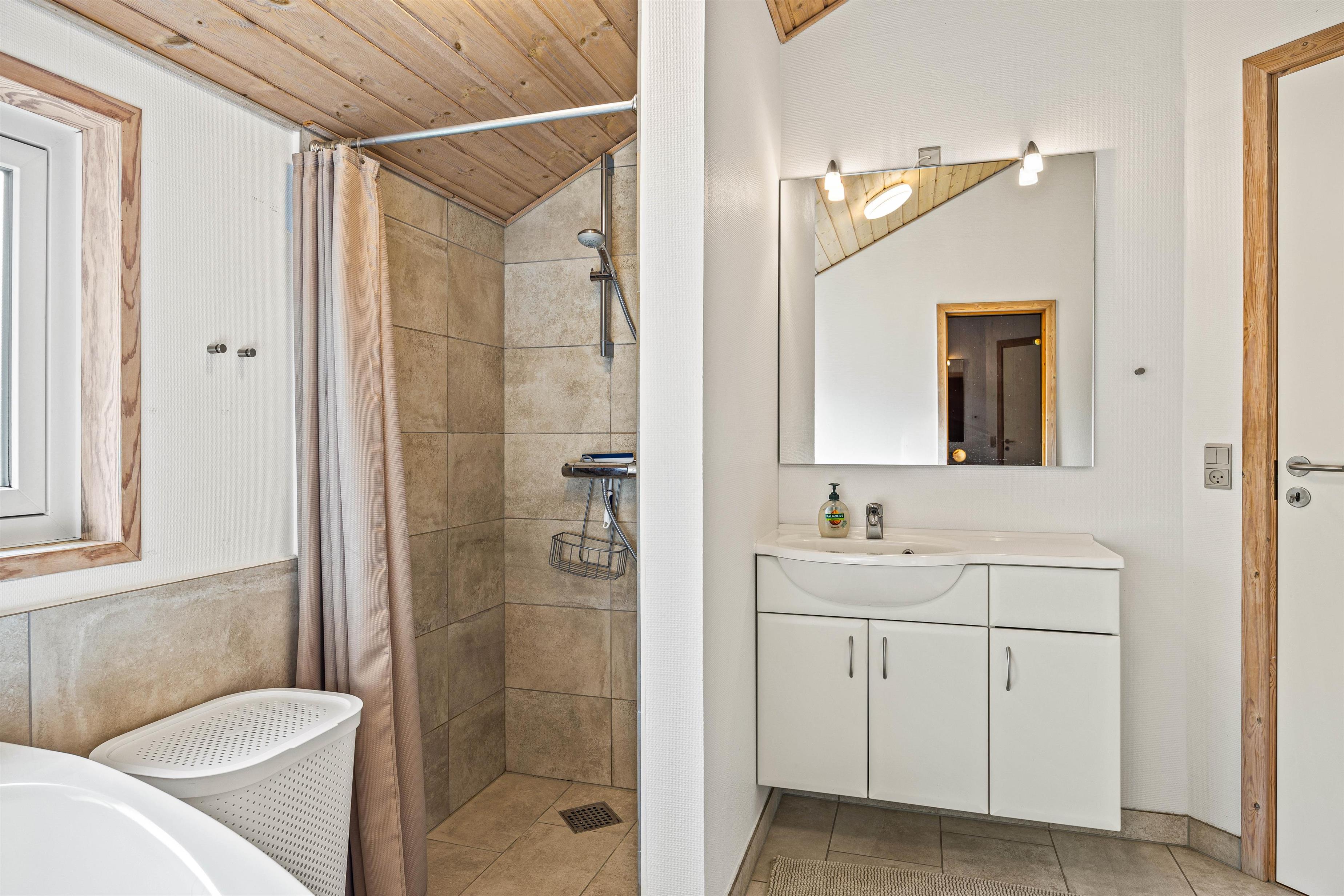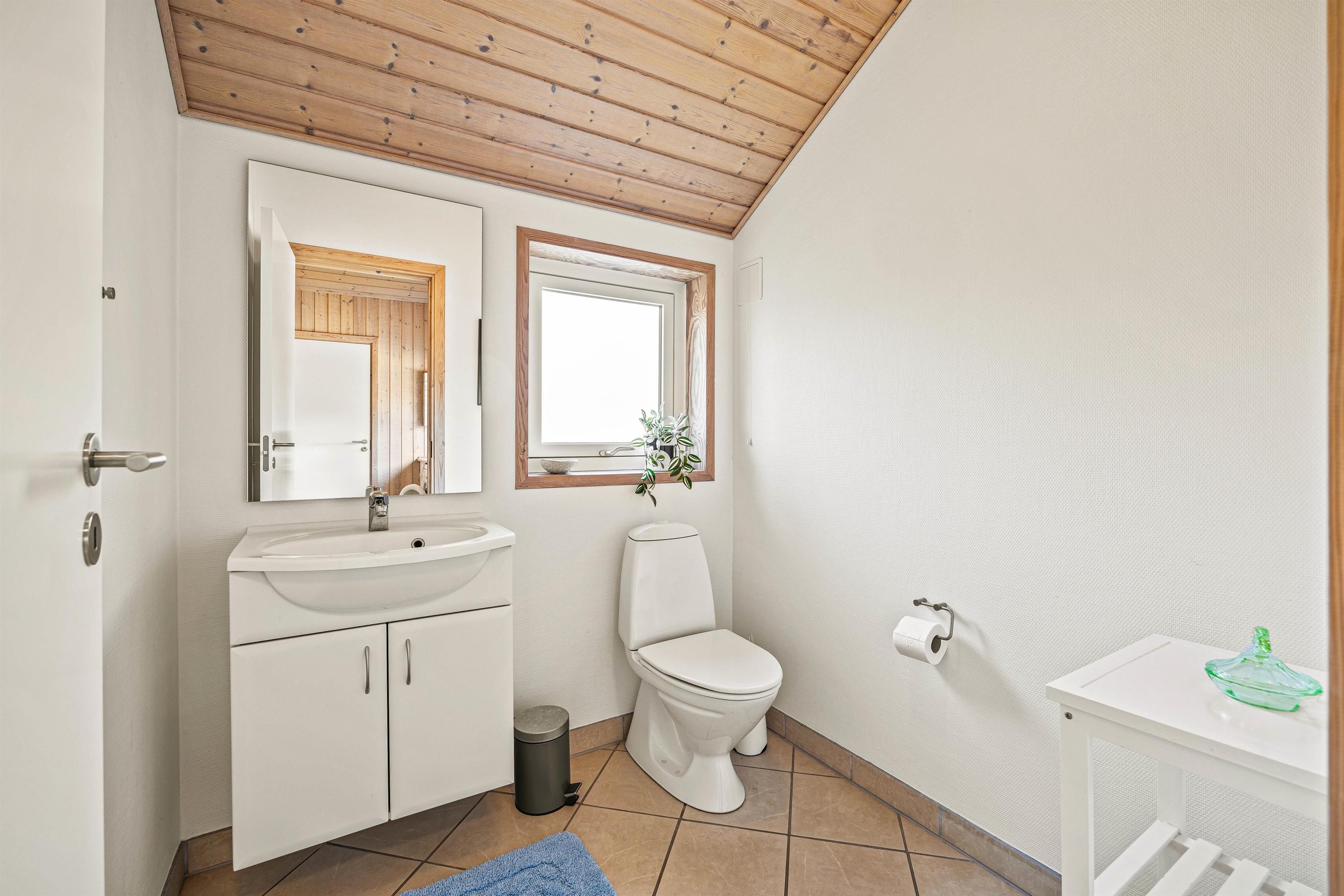 Badeværelset tilbyder en skøn tømmespa, perfekt til ren afslapning og velvære. Dertil findes der også et gæstetoilet, så I undgår kø og kan nyde en mere ubesværet feriedagligdag. Dette sommerhus er således klar til at levere både hyggelig charme og praktisk komfort under hele jeres ophold.