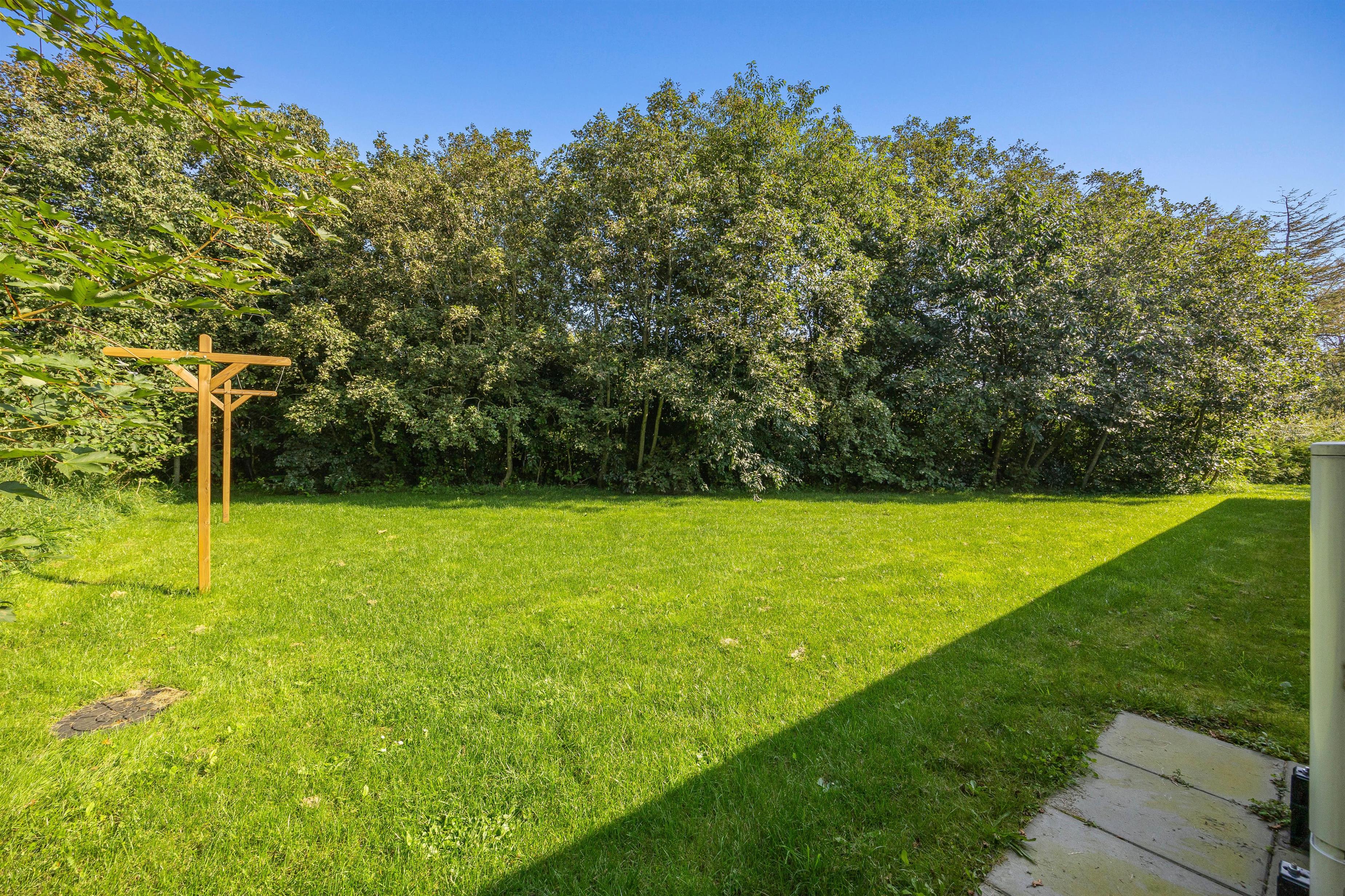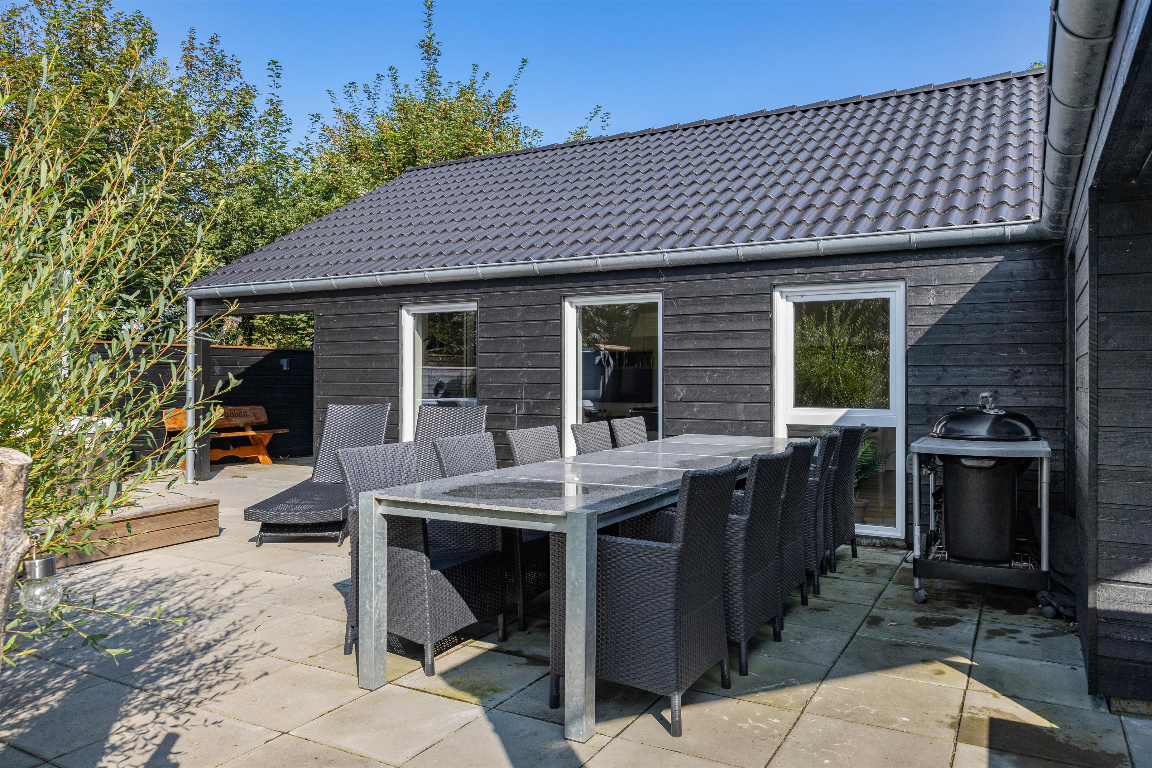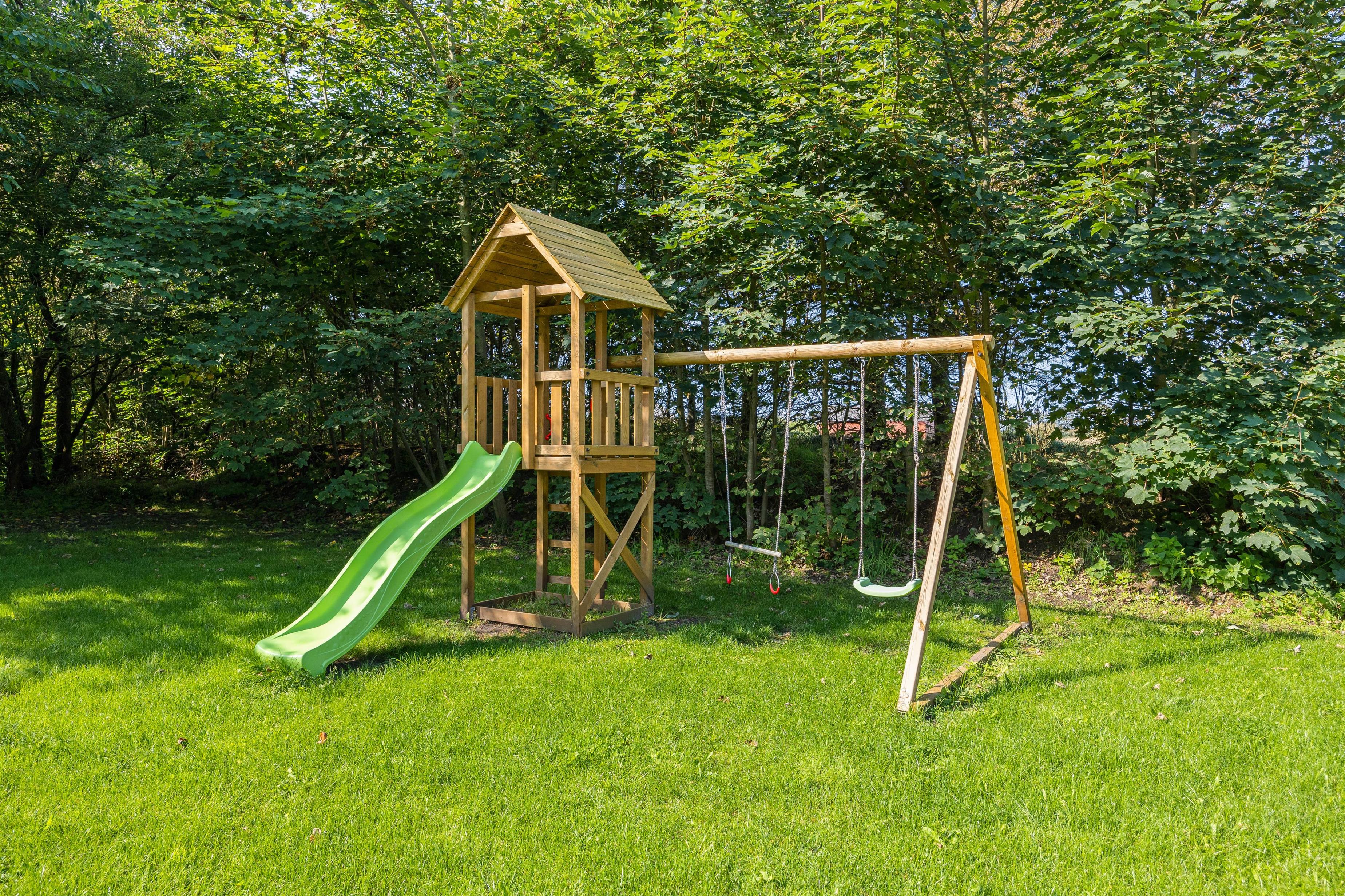 Der er plads til både spisning og afslapning på terrassen samt leg og sjov på de udendørs aktiviteter som rutsjebane og gynger. Den lækre grund på 1505 m2 indbyder også til leg og hygge på den store græsplæne, med træer hele vejen rundt.