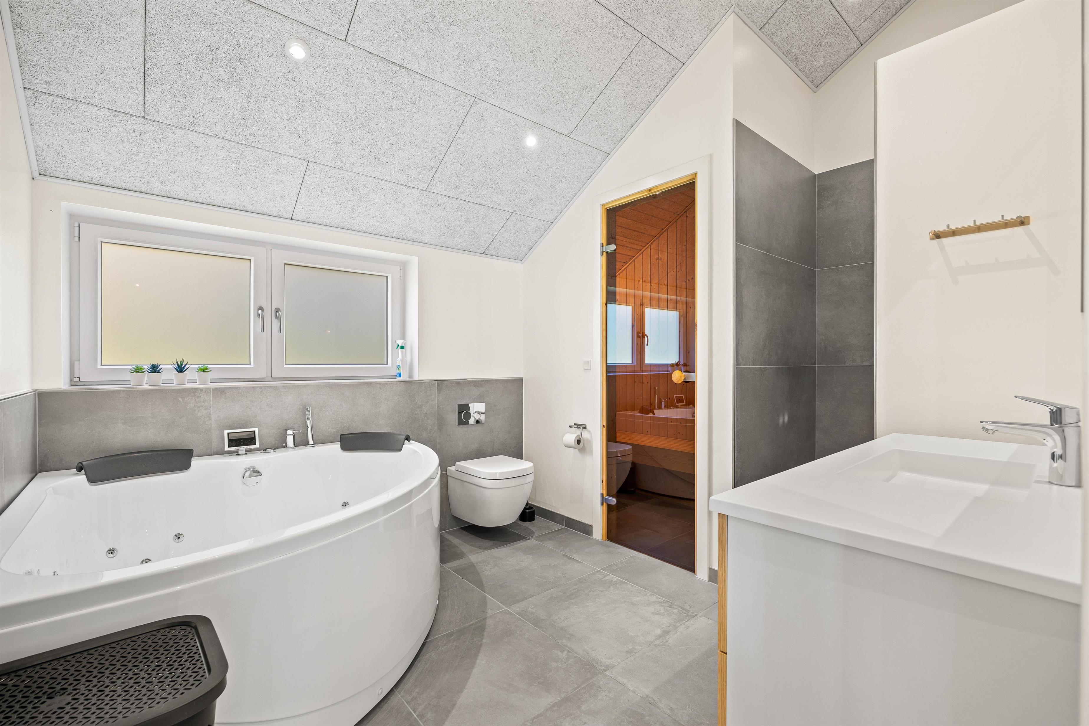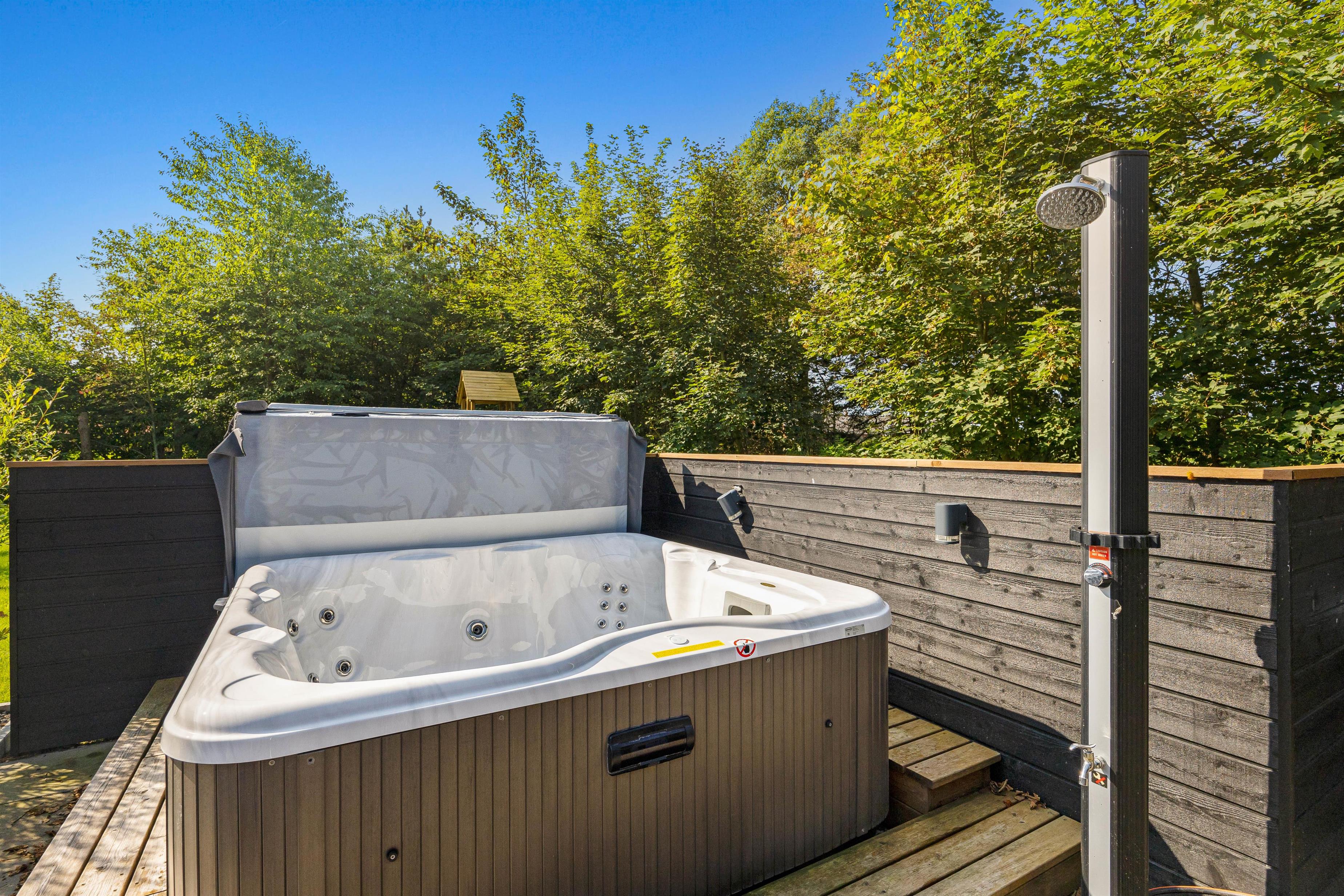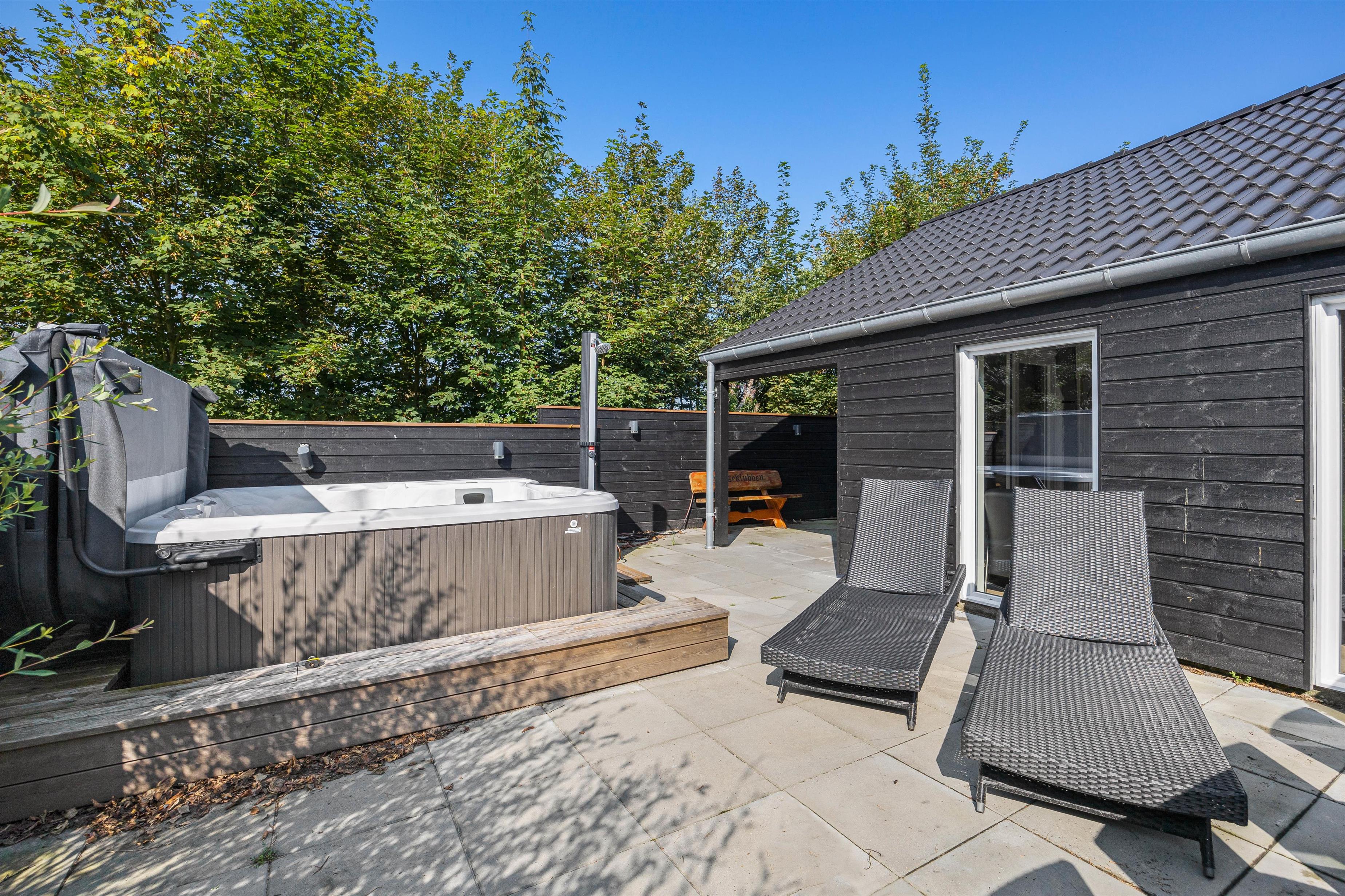 På den store, indbydende terrasse står et stort, udendørs spabad, hvor I rolig kan synke ned i de varme bobler og læne hovedet tilbage. Dertil kommer en lækker udendørs sauna, som fuldender den luksuriøse ferieoplevelse.