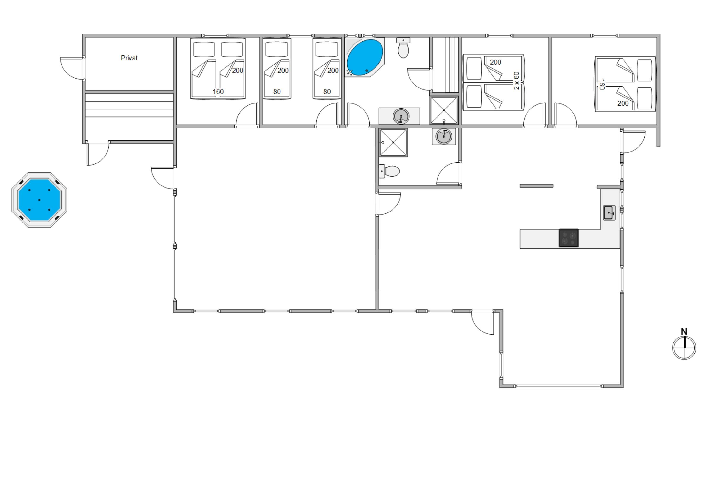 Her er samværet i centrum, og den åbne planløsning mellem køkken og stue sikrer, at hyggen altid er nærværende, uanset om I tilbereder snacks sammen eller nyder et spil kort i sofaområdet. Huset indeholder 2 lækre badeværelser, hvor det ene har en ekstra luksus i form af et indendørs spabad, hvor roen kan sænke sig efter en aktiv dag.