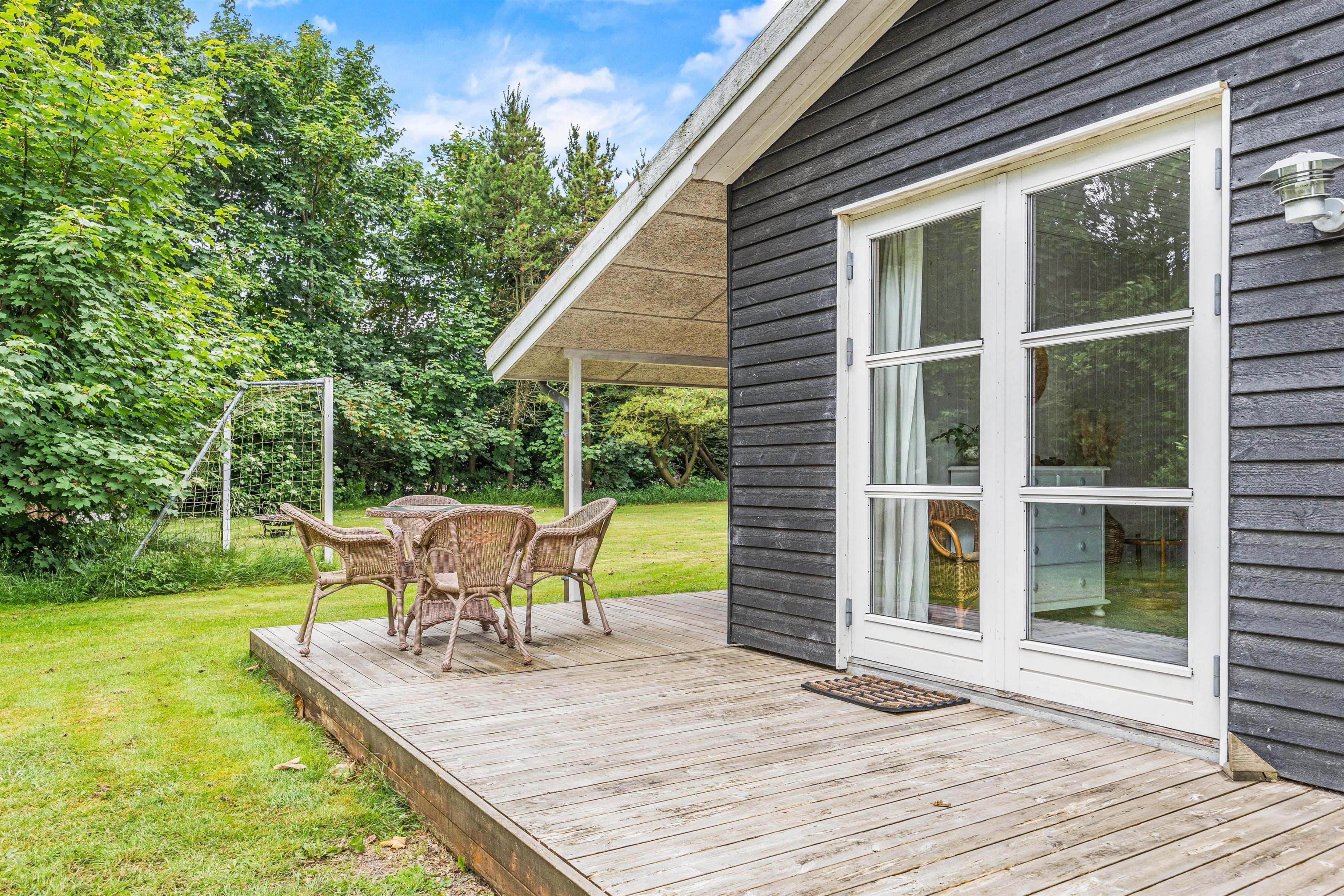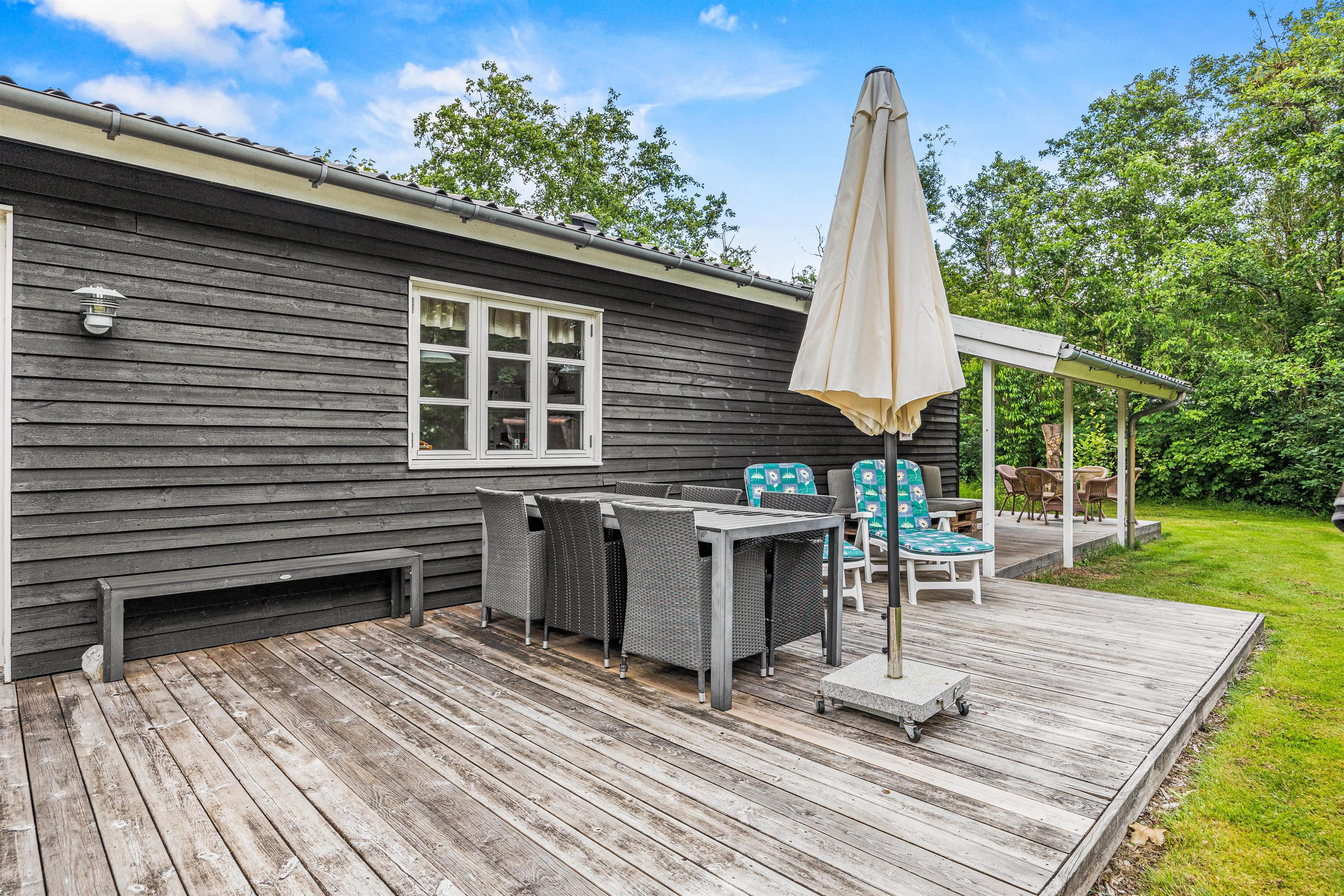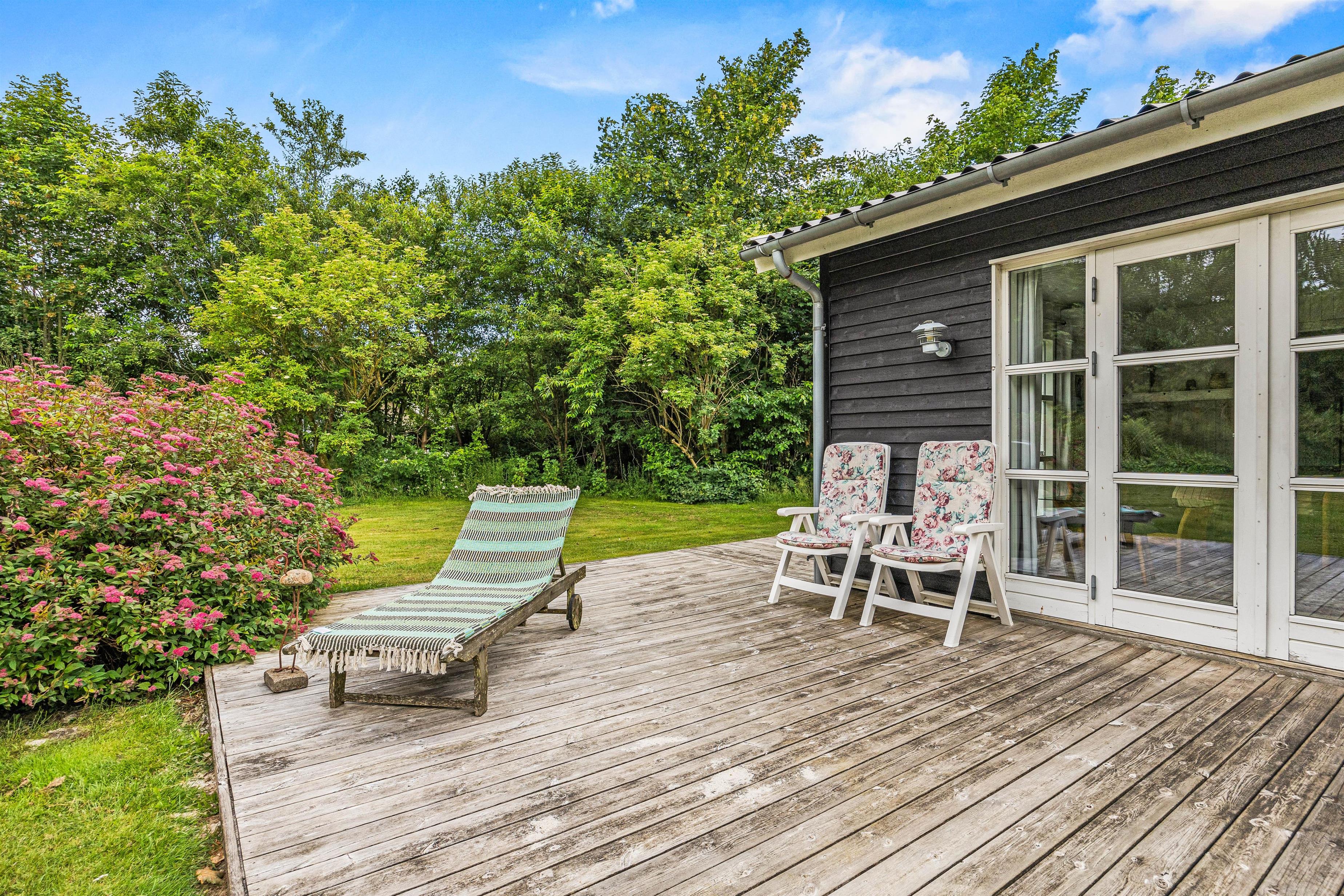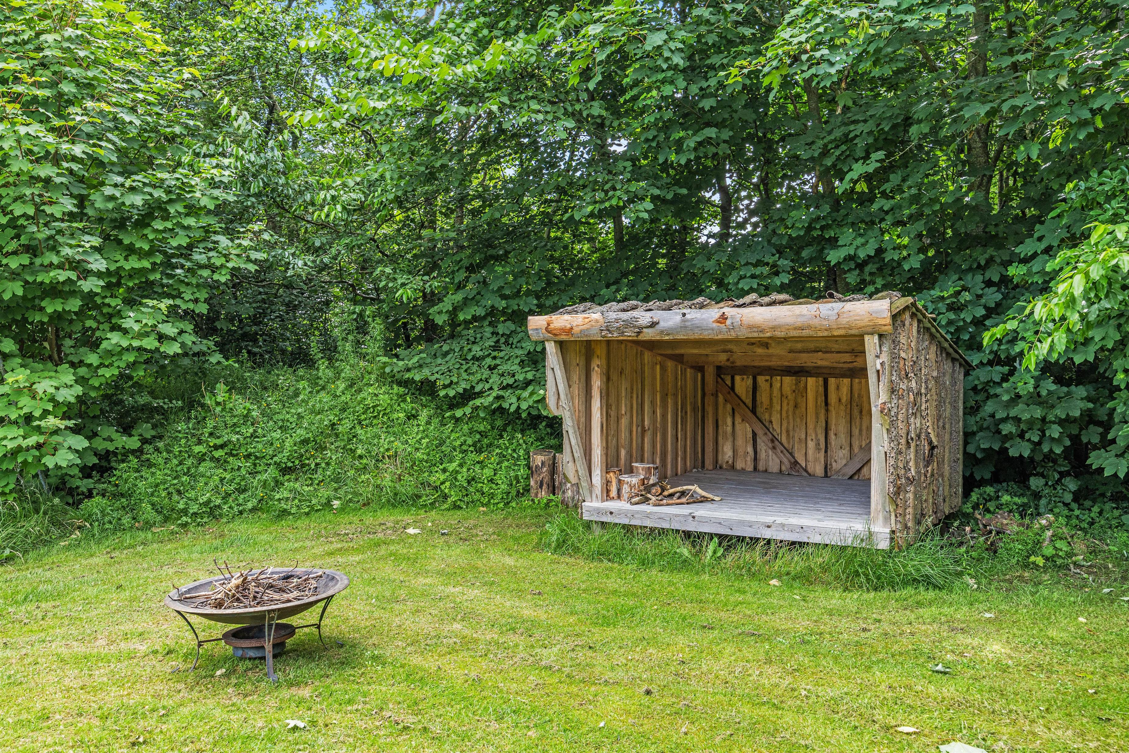 Grunden omkring sommerhuset er en sand oase af muligheder og komfort, omringet af masser af grønne træer og buske. Den åbne terrasse inviterer til hyggelige stunder under åben himmel, hvor I kan samles om grillen og nyde lækre måltider i det fri.