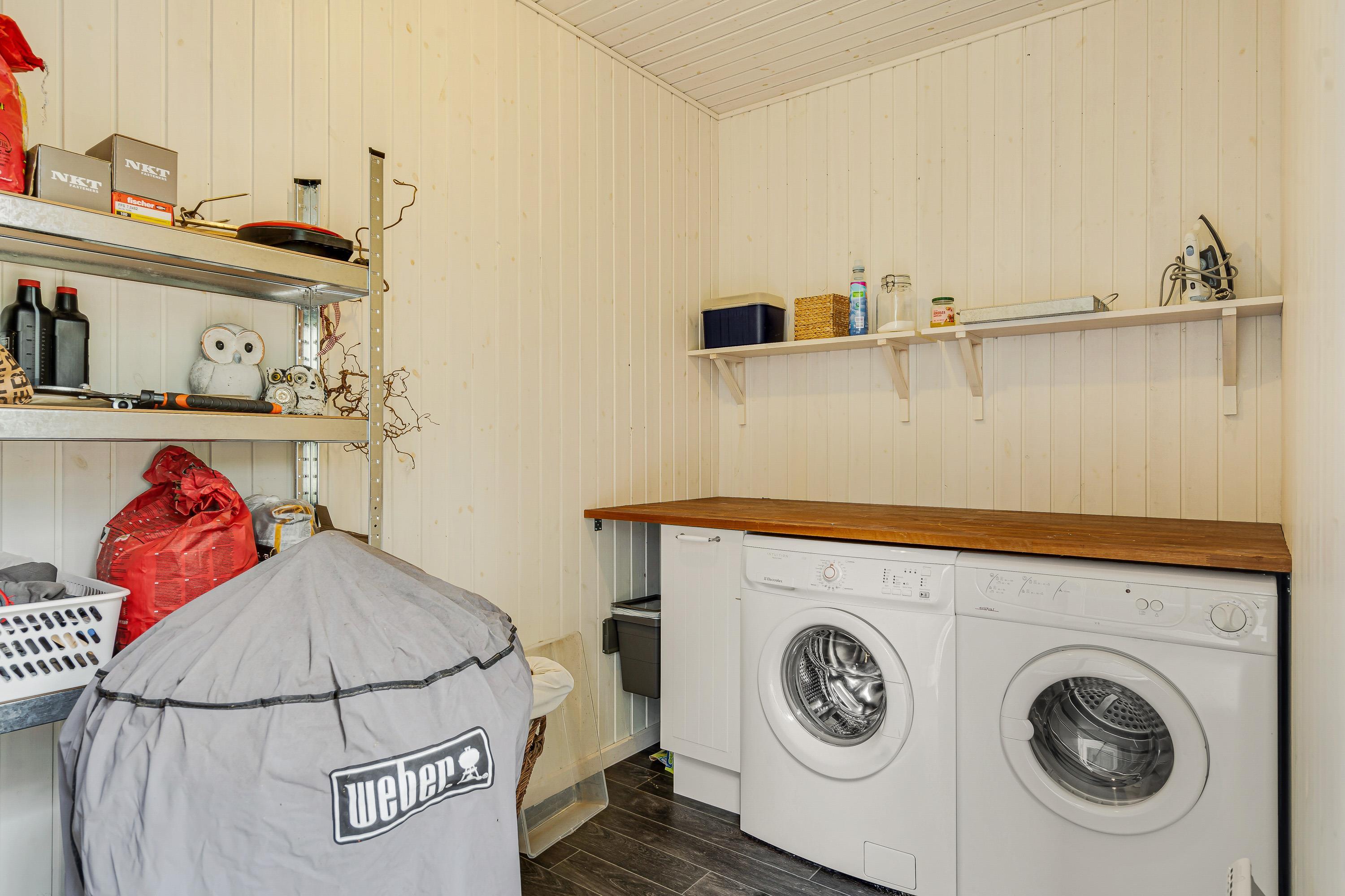 Badeværelset er hyggeligt indrettet med en dejlig sauna, hvor I kan nyde en afslappende stund. Når dagens eventyr har sat sit præg, sørger både vaskemaskinen og tørretumbleren for, at det er enkelt at håndtere dagligdagens opgaver, mens I fokuserer på at nyde hvert øjeblik af jeres ophold.