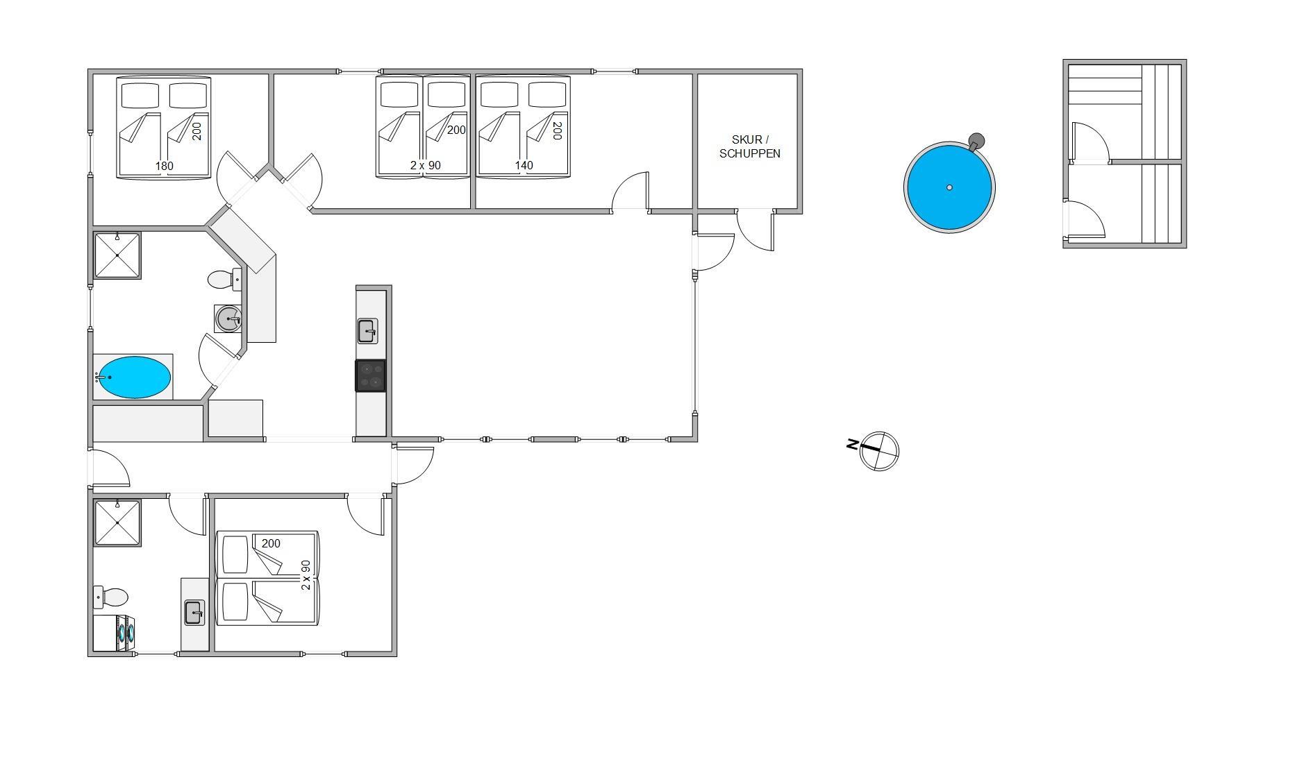 Indendørs i sommerhuset venter jer en lys indretning, som I helt sikkert vil føle jer godt tilpas i. Sommerhuset er indrettet med 4 gode soveværelser med super lækre kvalitets madrasser fra Dunlopillo i 3 af værelserne og en 140x200cm seng i det fjerde værelse. Derudover er der også sovepladser på hemsen. Med 2 badeværelser i sommerhuset, der har gulvvarme, slipper I for kø fra morgenstunden.