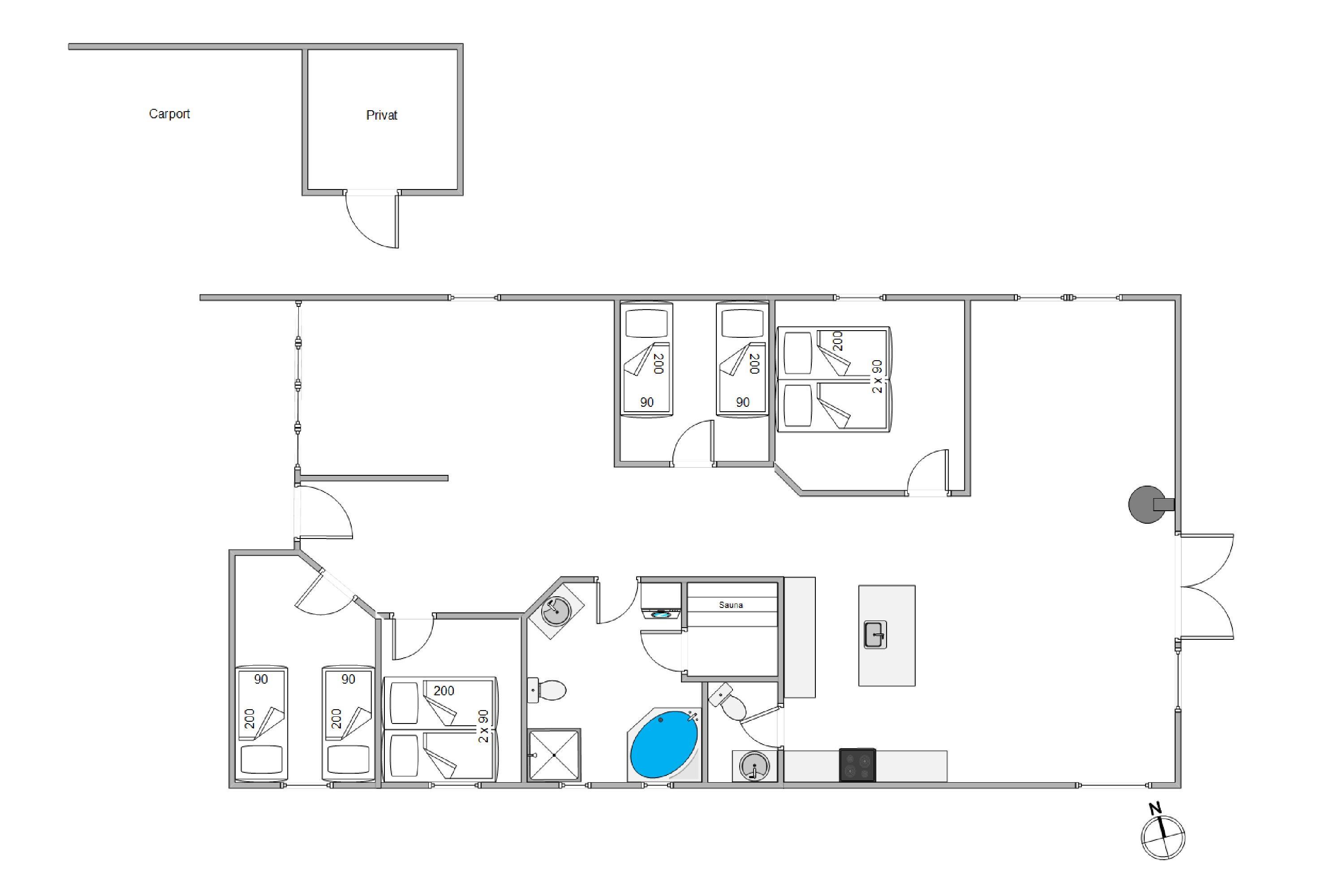 Feriehuset byder på fire komfortable soveværelser, hvoraf to har dobbeltsenge og de resterende to har to enkeltsenge hver. Denne indretning er ideel til flere familier eller vennegrupper, der rejser sammen.