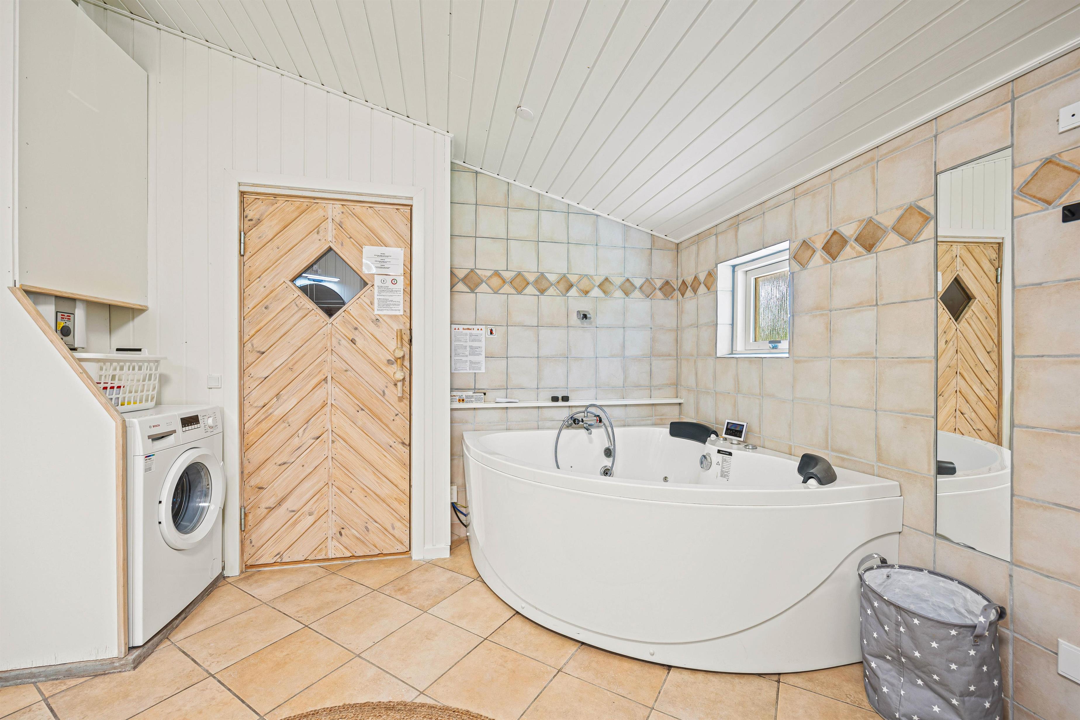 I huset er der et badeværelse udstyret med både sauna og tømmespa, som giver jer mulighed for at slappe af og forkæle jer selv efter en dag med eventyr i området. Der er også et ekstra toilet med vaskemaskine til rådighed, så I kan holde garderoben frisk og ren, uanset hvad jeres eventyr langs vestkysten bringer.