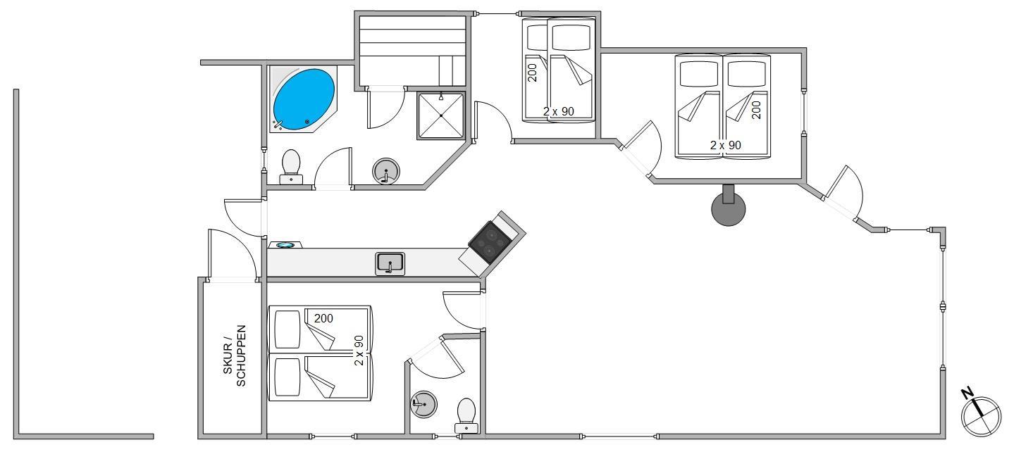 Feriehuset har tre soveværelser; to med dobbeltsenge og et med en køjeseng, hvilket er ideelt for familier eller venner, der rejser sammen. Badeværelset giver jer mulighed for at forkæle jer selv med en tømmespa til 2 personer samt en sauna, perfekt til at slappe af i. Der er også et ekstra toilet, der giver ekstra bekvemmelighed. I huset findes et praktisk vasketårn, så I let kan holde styr på garderoben under hele opholdet.