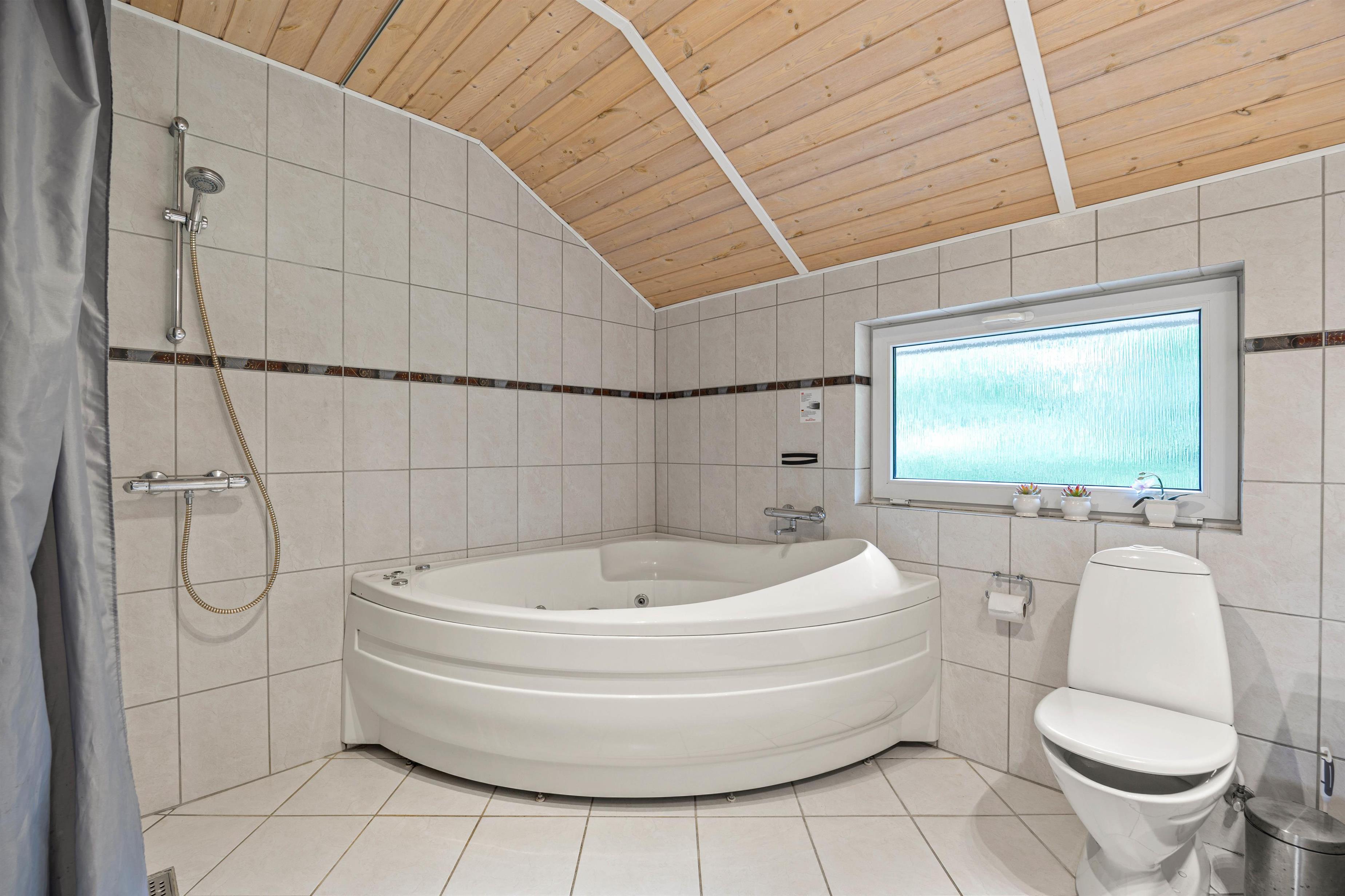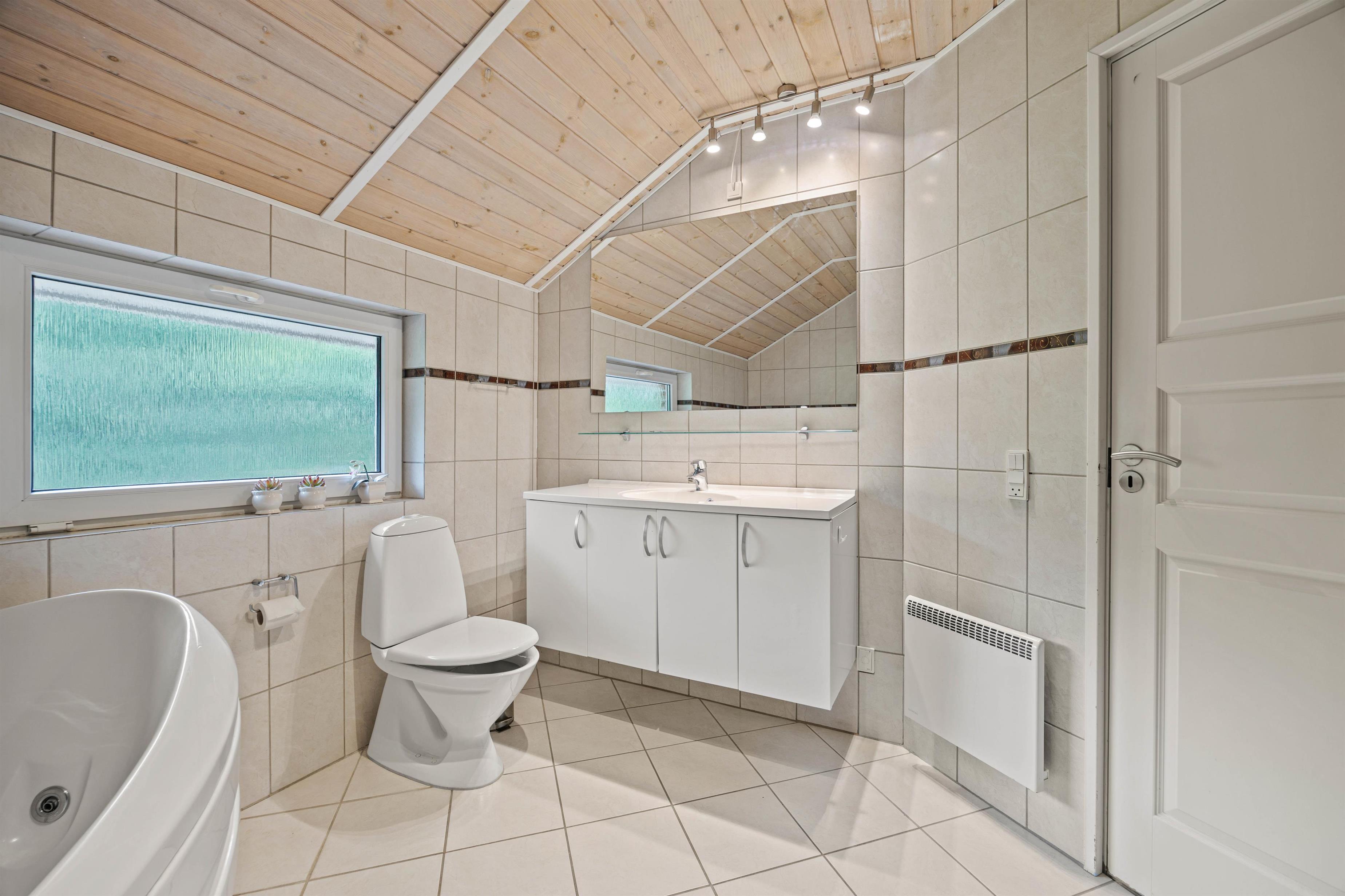 I finder derudover også 1 badeværelse og 1 gæstetoilet, hvor I, i begge rum kan nyde godt at gulvvarmen. Efter gode lange dage, er det derfor også oplagt at nyde godt af badeværelsets tømmespa og sauna. I kan lade jer synke ned i tømmespaen, eller nyde varmen fra saunaen, og slippe alle bekymringer angående vasketøjet, da vaskemaskinen og tørretumbleren sikrer en ren garderobe.