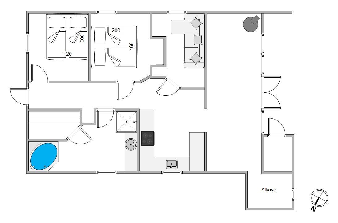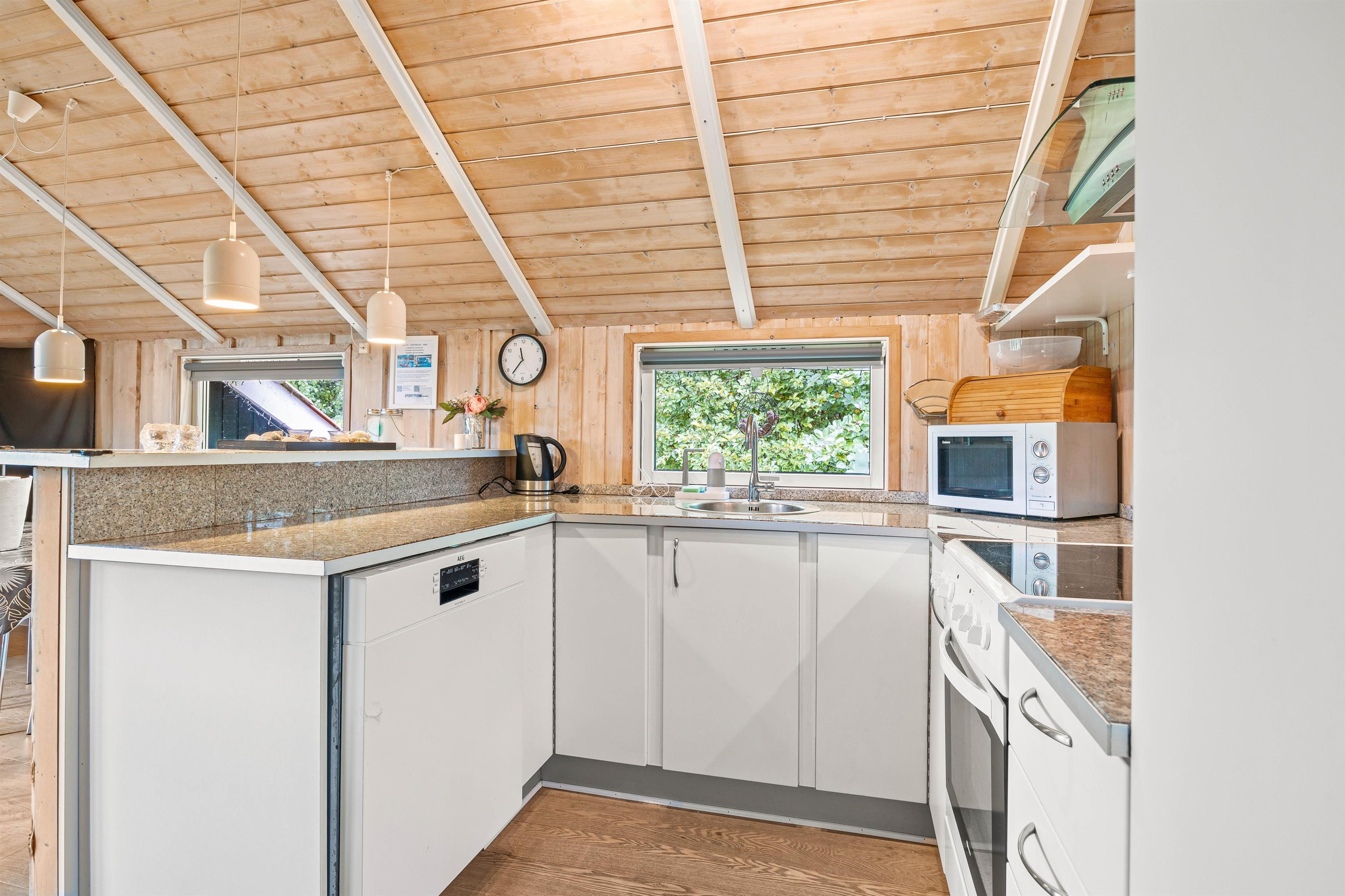I det klassiske træbeklædte sommerhus kan der bo 6 gæster fordelt på tre soveværelser, hvoraf det ene soveværelse har en sovesofa og stuens alkove kan omdannes til en hyggelig hule. Sommerhusets samlingspunkt og hjerterum er det hyggelige køkken-opholdsrum, hvor loftet i kip skaber en rummelig atmosfære. I stuen venter hjørnesofaen med plads til hele familien. Her kan I samles om et spil ved sofabordet, læse den medbragte ferielæsning eller se en film sammen på stuens TV, hvor det er muligt at streame via Chromecast. Skal feriehuset varmes op eller stemningen være ekstra hyggelig, kan I tænde op i brændeovnen.
