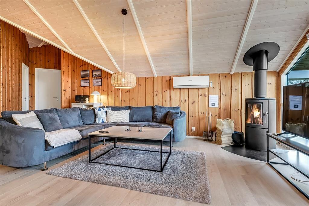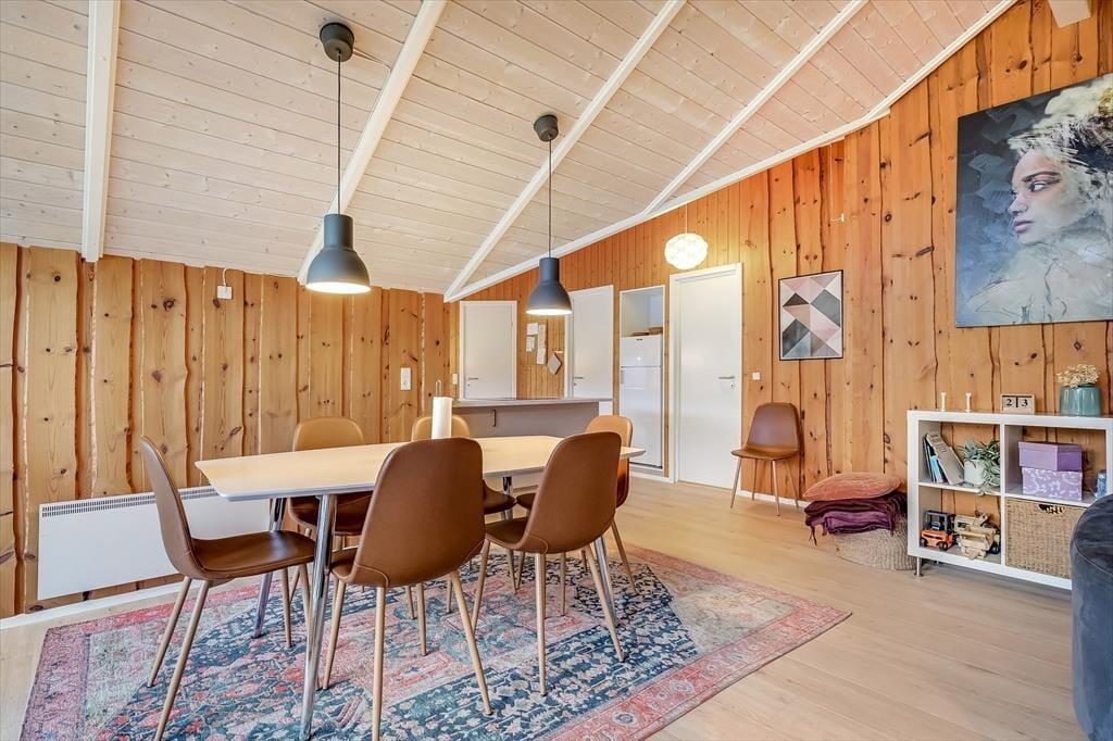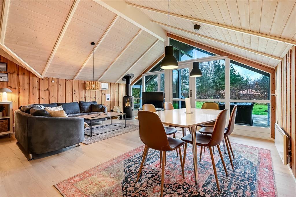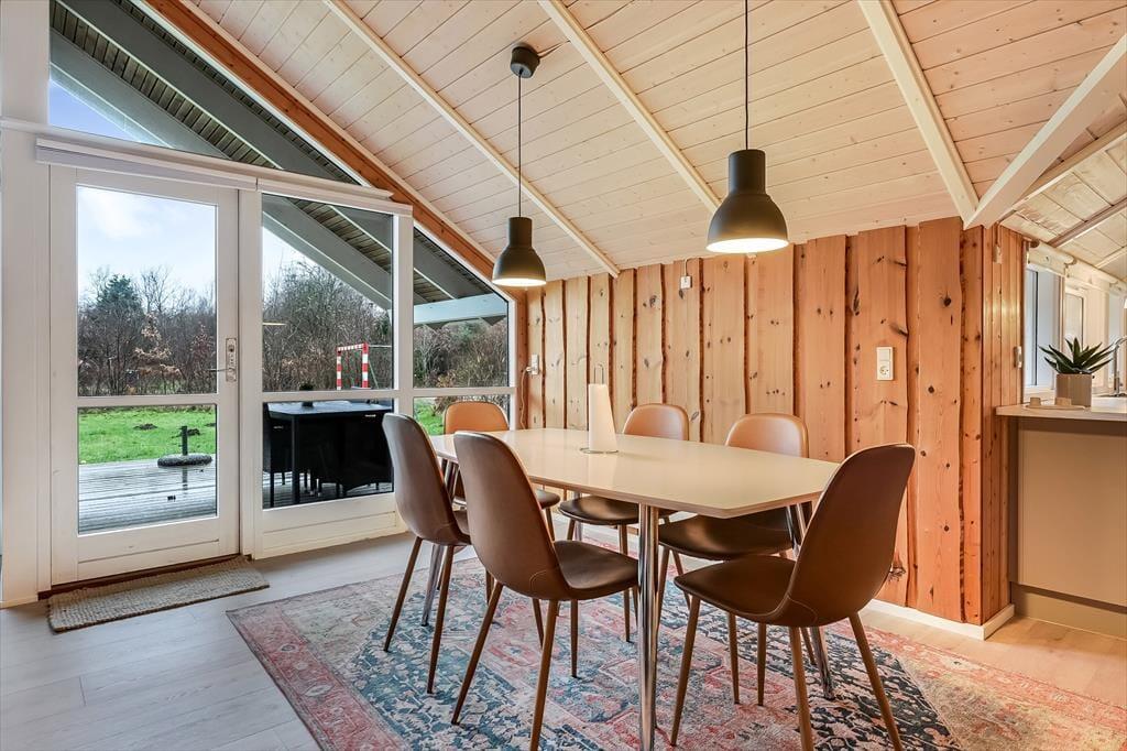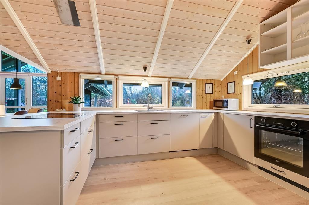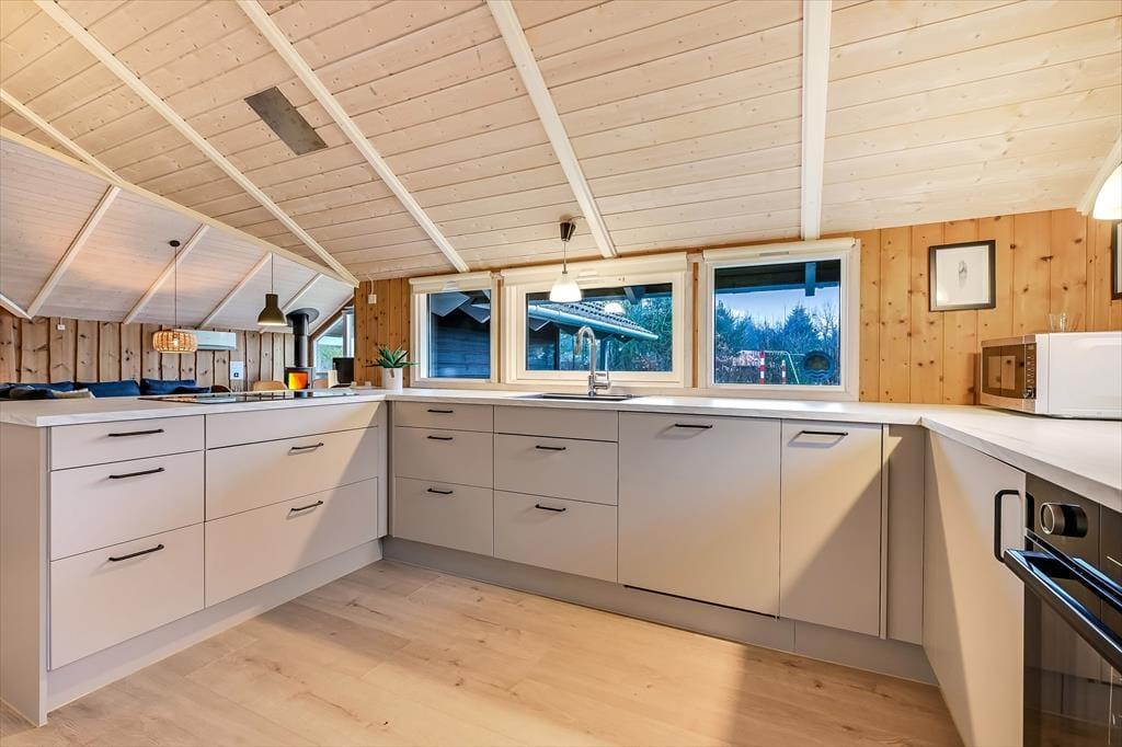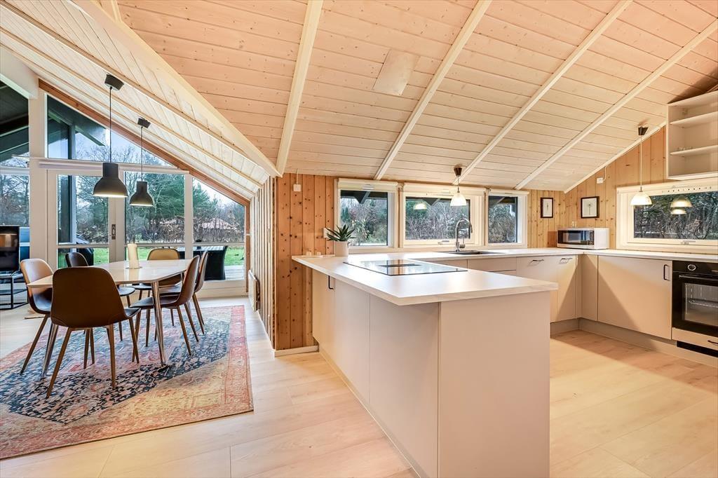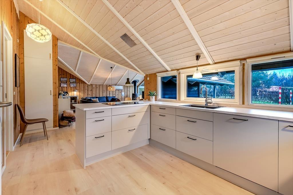 Når du træder indenfor i sommerhuset, mærker du straks den afslappede feriestemning. Indretningen er lys og indbydende, og her er god plads til at samles og være sammen. Det nyere køkken ligger som en naturlig del af opholdsområdet, så samtalerne kan flyde frit, mens dagens måltider tilberedes. Her kan du starte dagen med duften af friskbrygget kaffe og afslutte aftenen med et godt glas vin efter en lang dag i det fri.