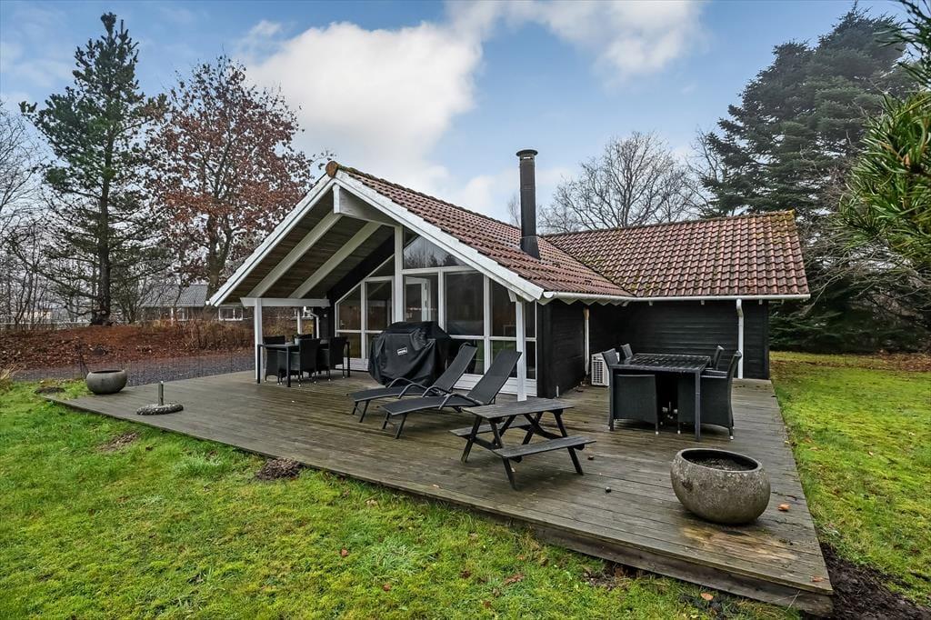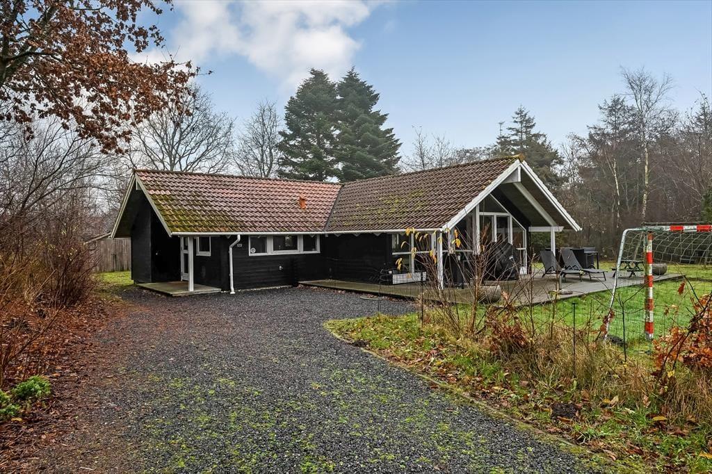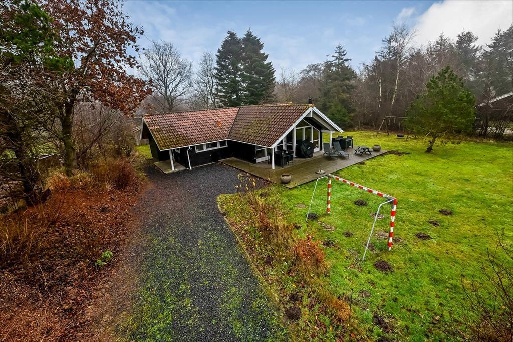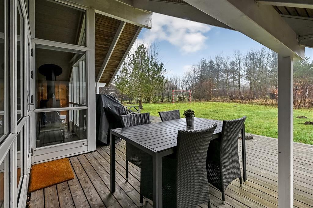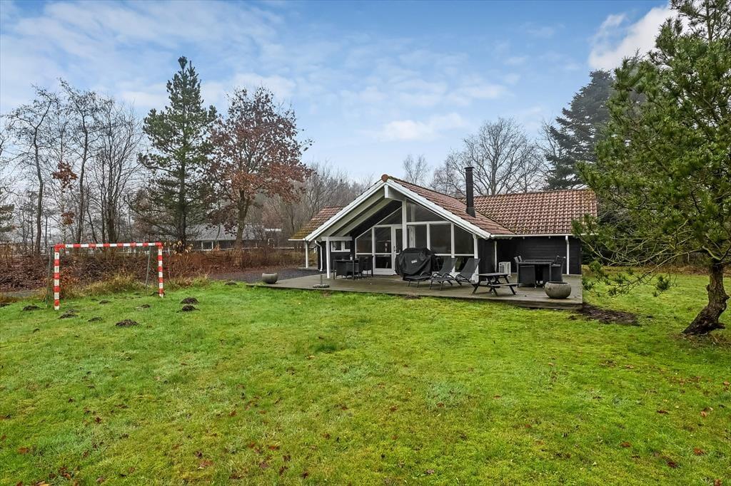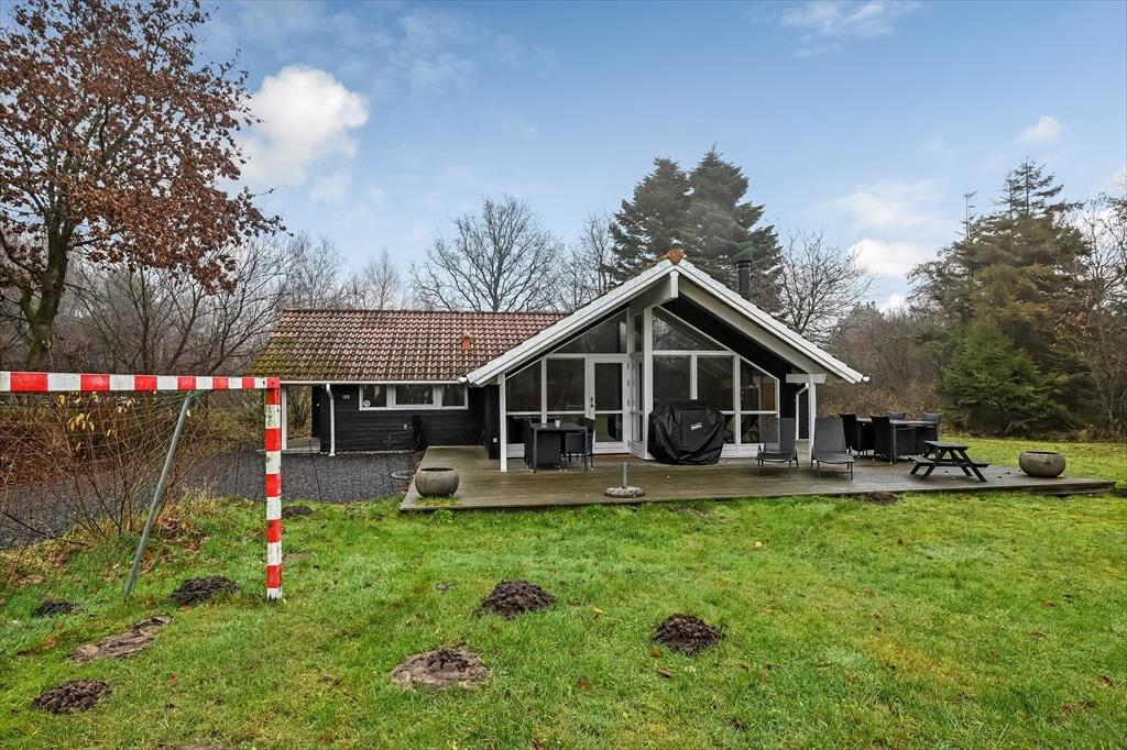 Udenfor fortsætter ferien på bedste vis. Sommerhuset ligger på en dejlig stor grund, hvor der er plads til leg, boldspil og afslapning. Fodboldmålet indbyder til små turneringer, mens de mindste kan lege frit og trygt i haven. Terrassen bliver hurtigt et naturligt samlingspunkt, uanset om solen skinner fra en skyfri himmel, eller du søger læ under den delvist overdækkede del.
