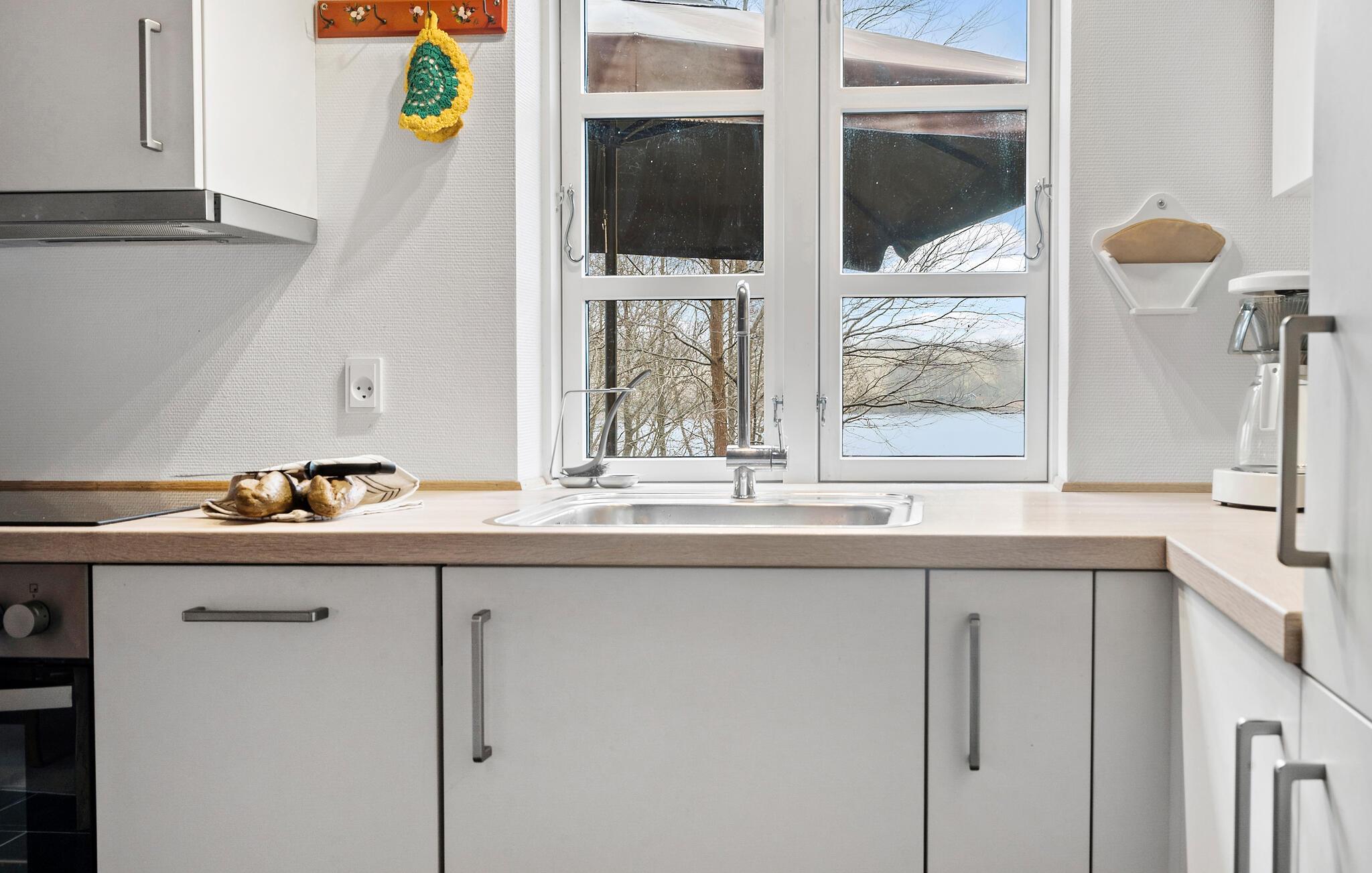 Den hyggeligt indrettede stue inviterer med sin varme indretning og en knitrende brændeovn til afslappende aftener. Fordyb jer i en god bog eller se en film her. Det åbne køkken er fuldt udstyret med alt, hvad I har brug for til at tilberede jeres daglige måltider. Lav mad med udsigt til det grønne og søen og føl jer hjemme.