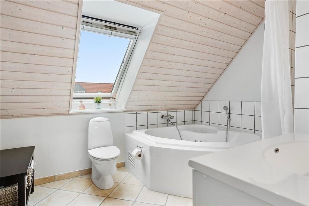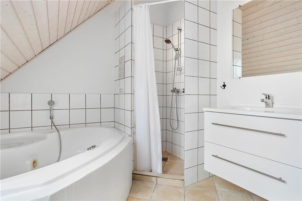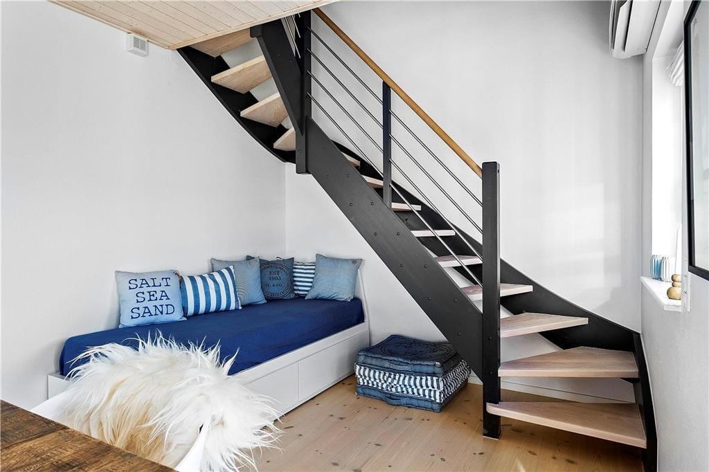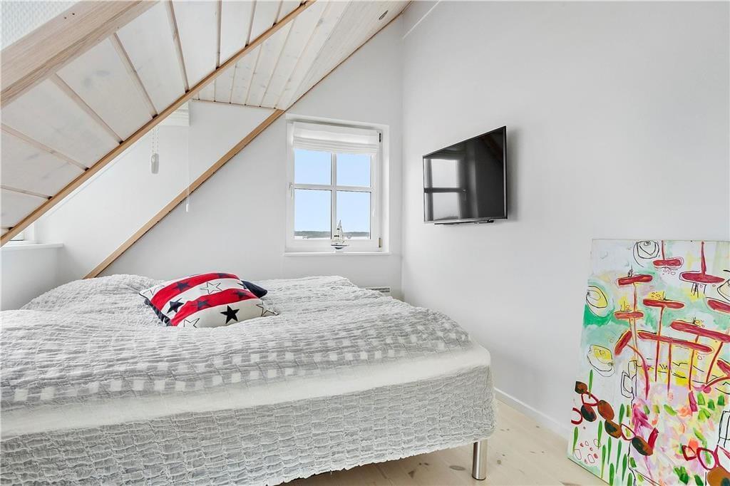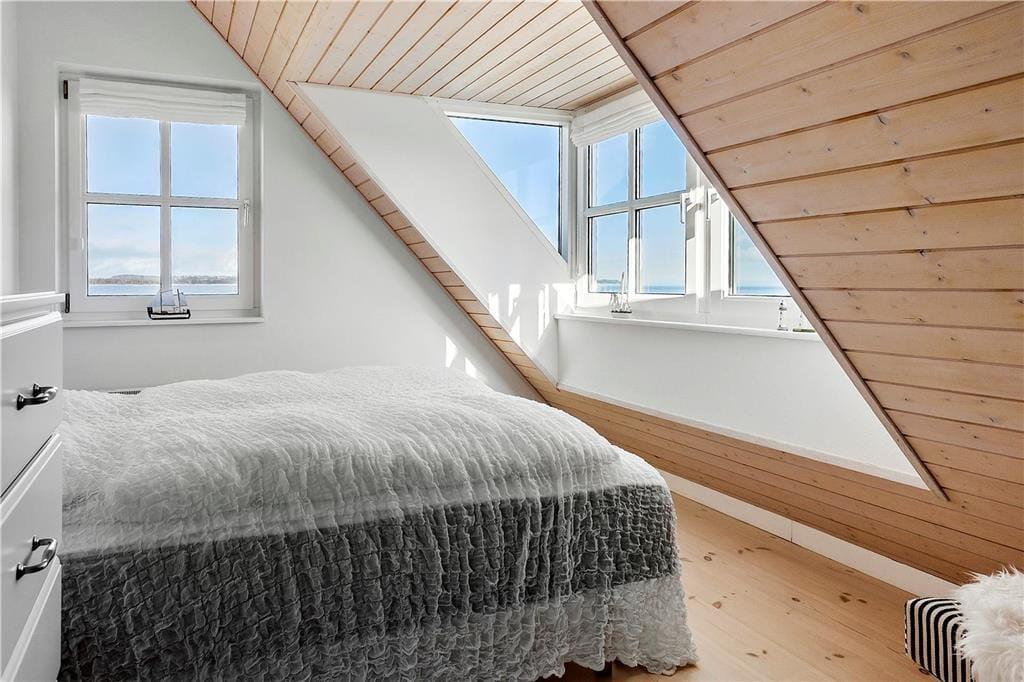 I soveværelset på første sal åbnes vinduerne og lader den friske havluft fylde rummet med energi og livsglæde. Lad dig synke ned i den indendørs spa og lad nydelse og ro fylde din sjæl.