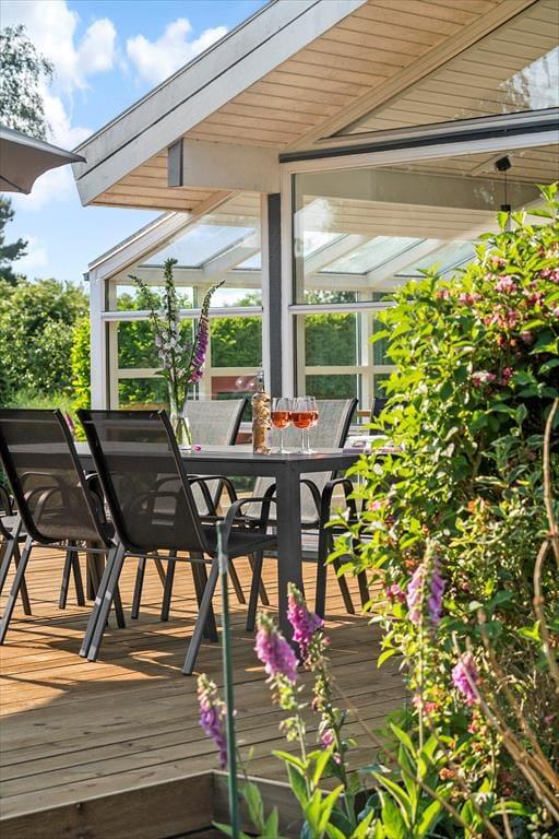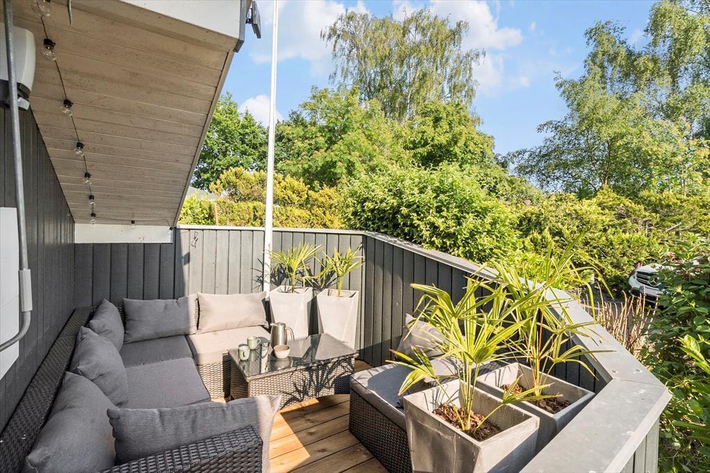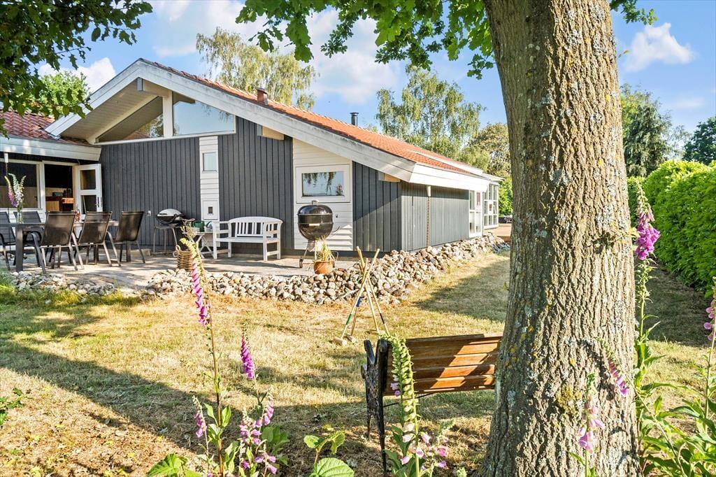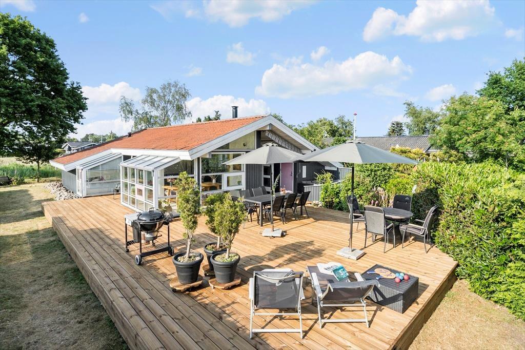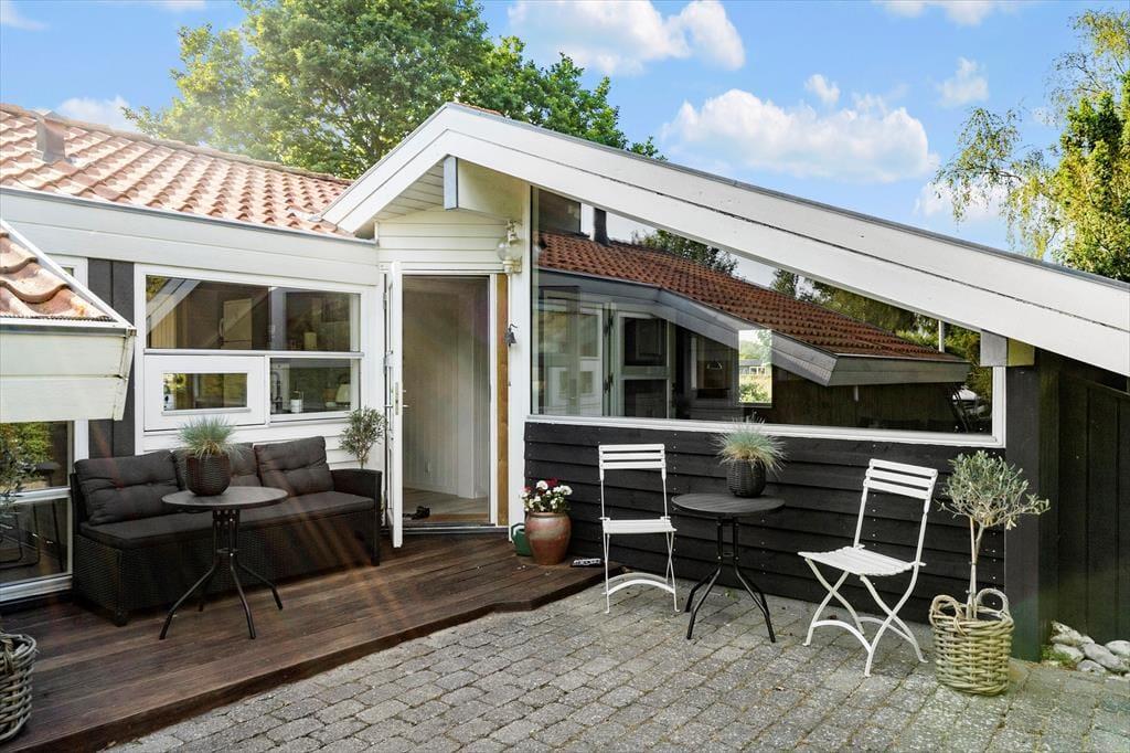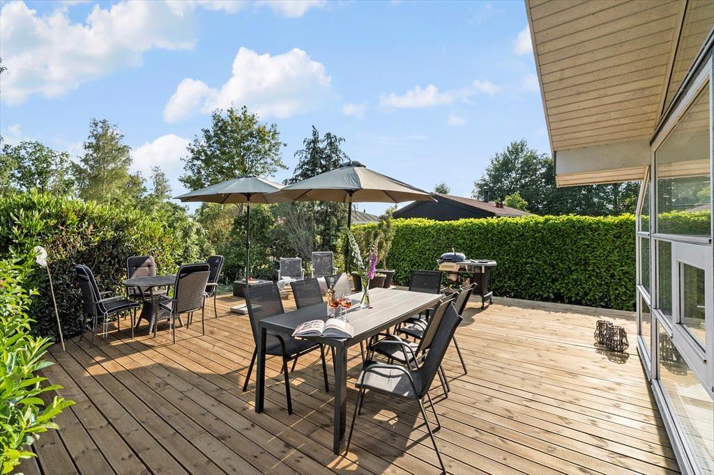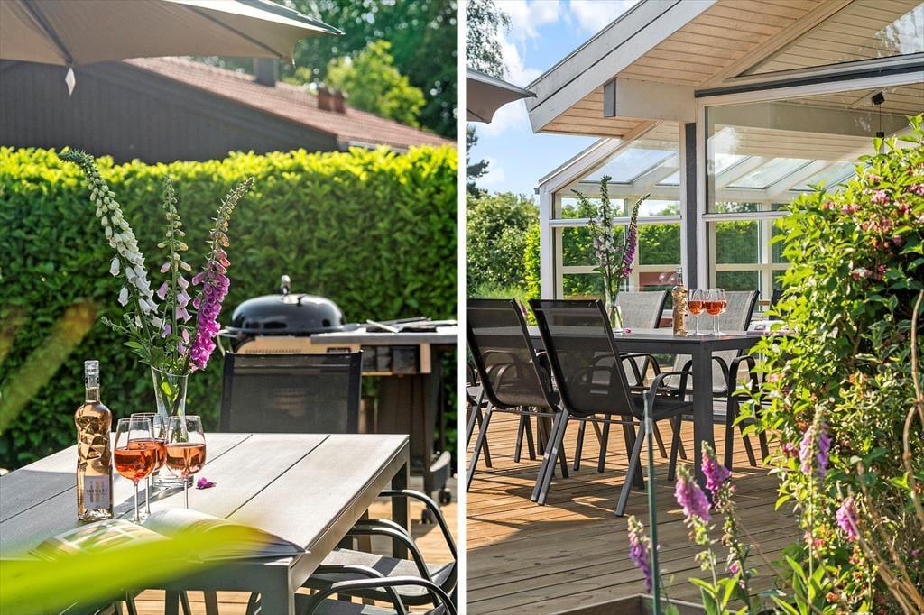 Udendørs har sommerhuset en rigtig dejlig terrasse. En terrasse, som der er udgang til fra stuen. Her er der både plads til at nyde aftensmåltidet tilberedt på sommerhusets kulgrill, til at nyde solen, til at nyde skyggen og til at læse en bog mens eftermiddagskaffen nydes.