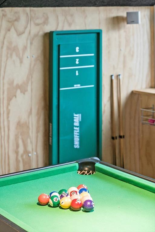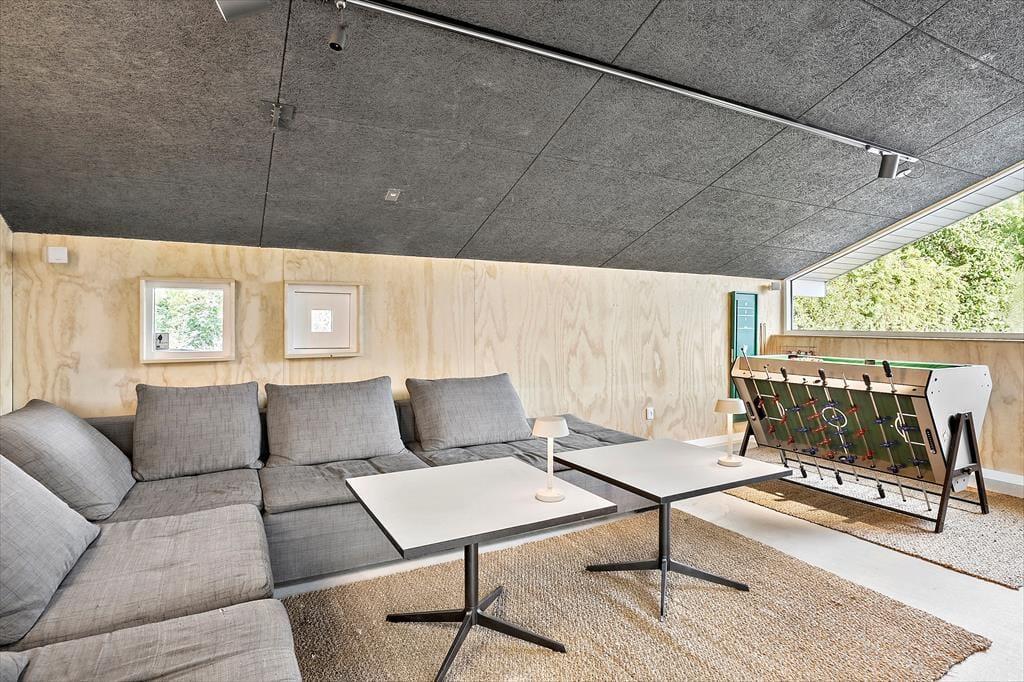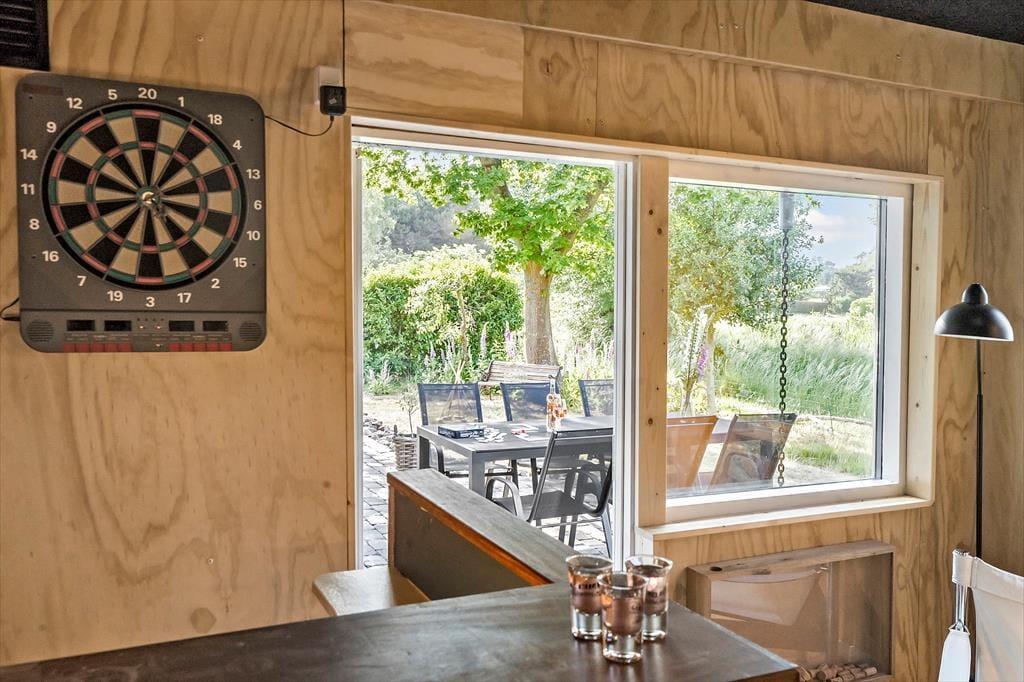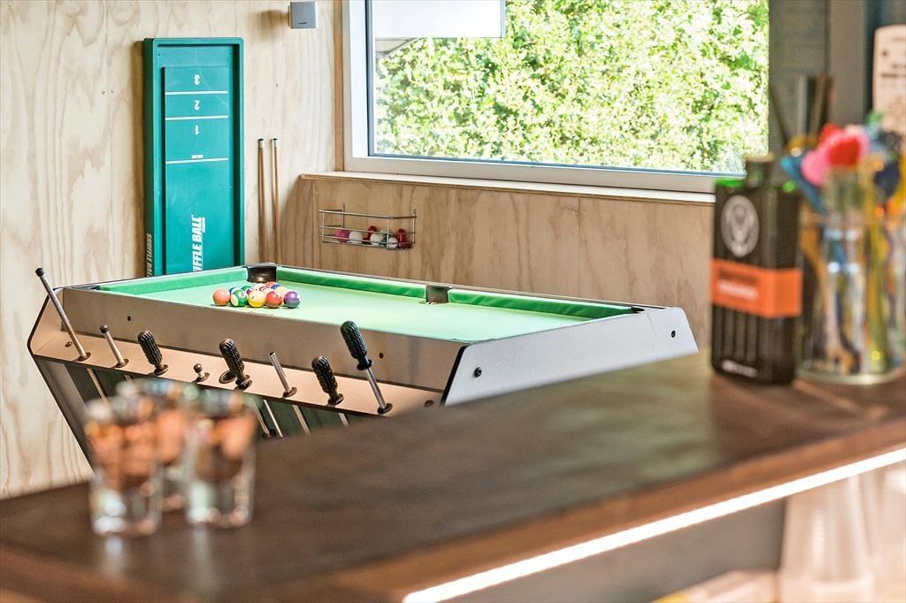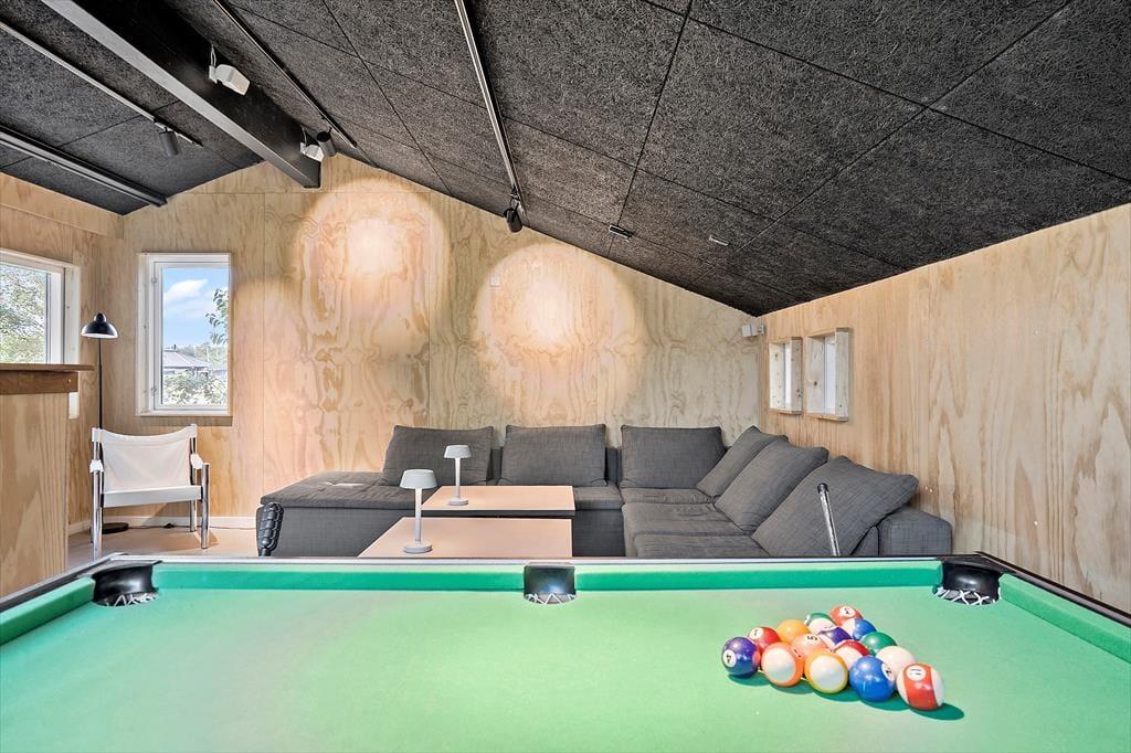 Huset har et stor aktivitetsrum med bordfodbold, airhockey, billard bord, en lille bar, møblement og hjemme biograf.