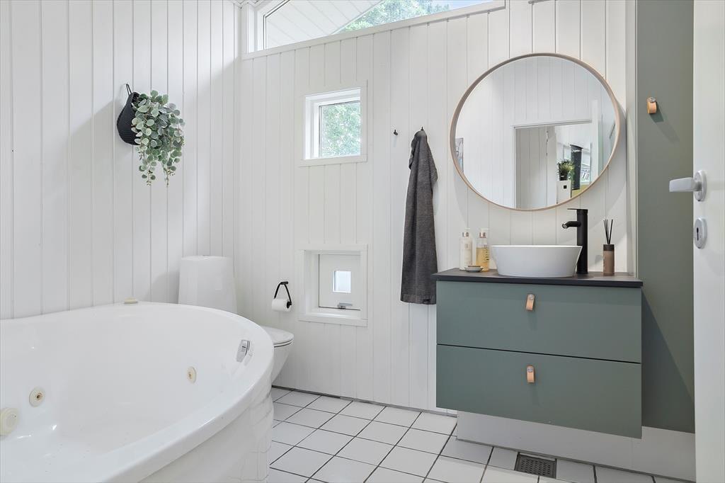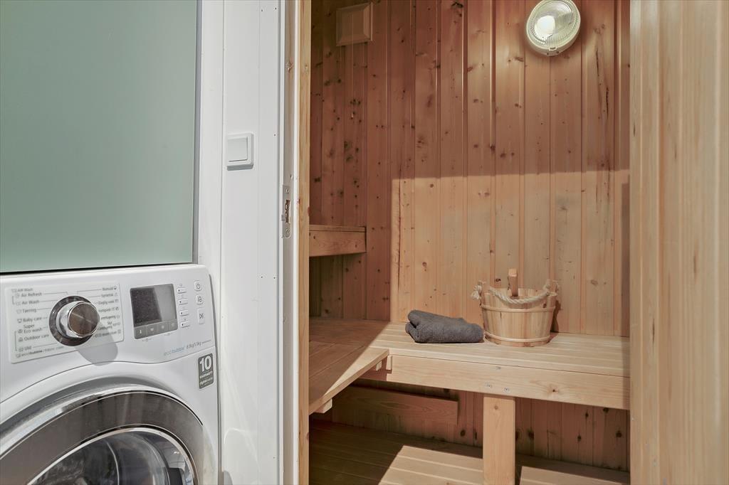 Et af husets stole plusser er det ekstra toilet, så der ikke er kø om morgenen, når der skal børstes tænder. På det store badeværelse er der spabad og sauna så I kan blive forkælet med et boblebad efterfulgt af en tur i sauna.