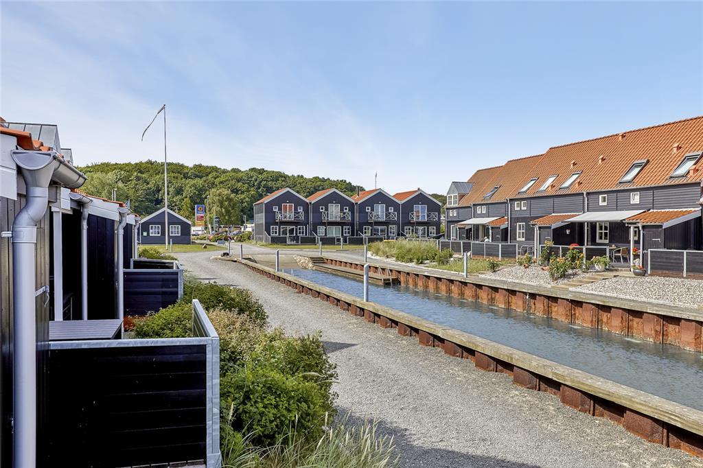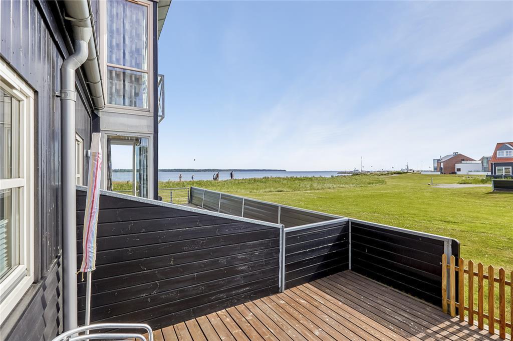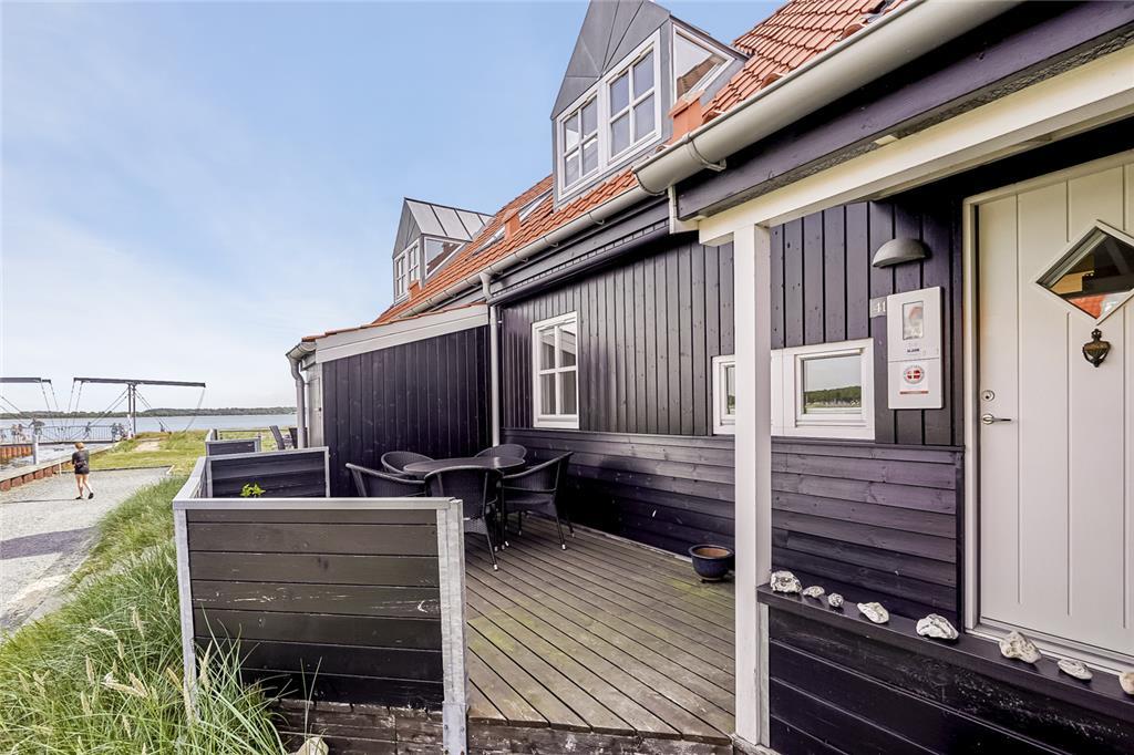 Der er hyggelige terrasser både ud for stuen og ud for køkkenet. Den ene med markise. Her kan man også nyde udsigten over vandet.