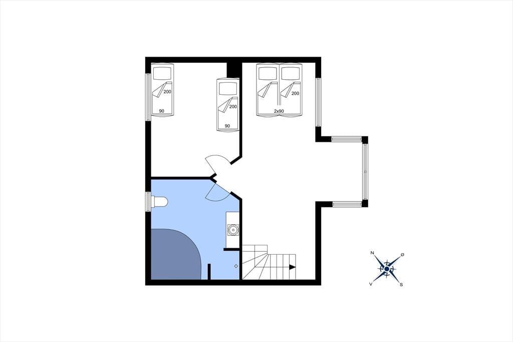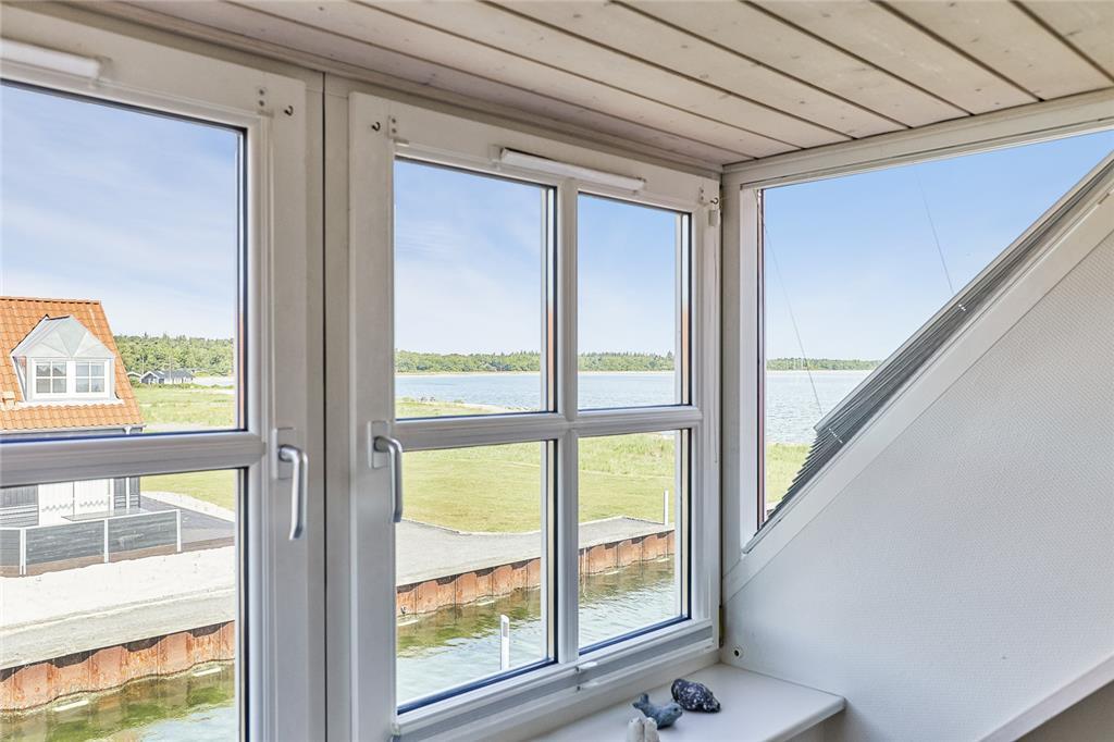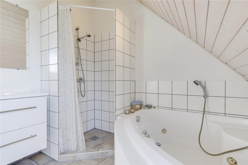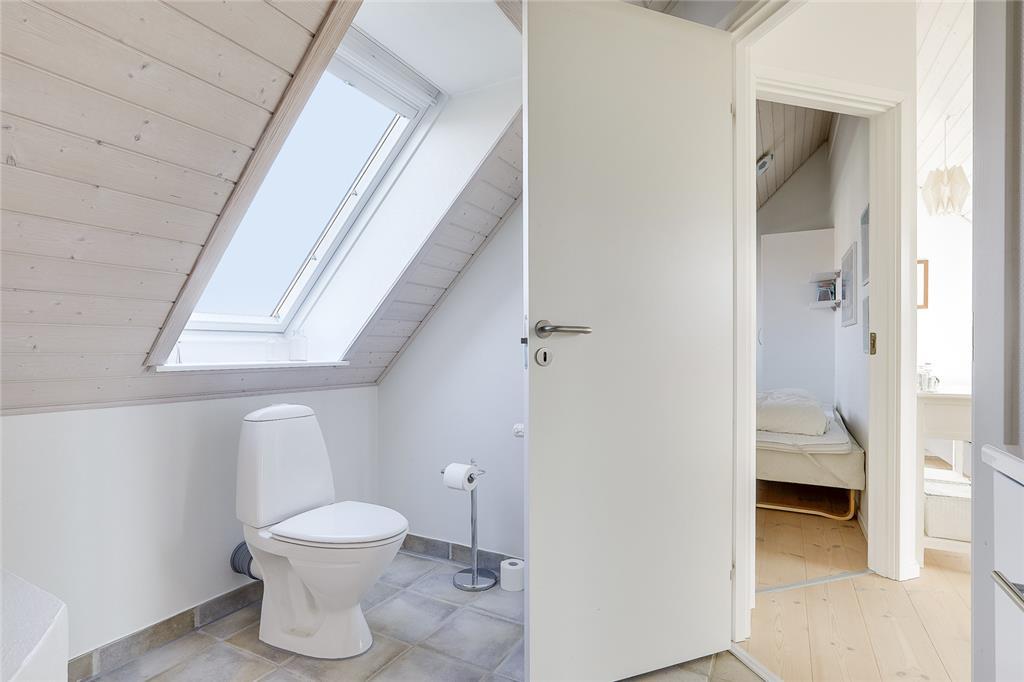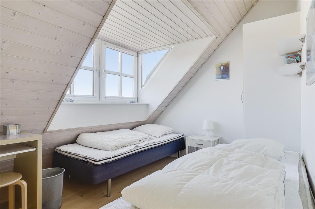 Fra stuen fører en trappe op på 1. sal, hvor der er repos, som er kombineret stue og soverum med en dobbeltseng. Herfra kan man nyde den fantastiske udsigt over strand og skov. På 1. sal er der ligeledes 1 soverum med to enkeltsenge samt stort badeværelse med spabad.