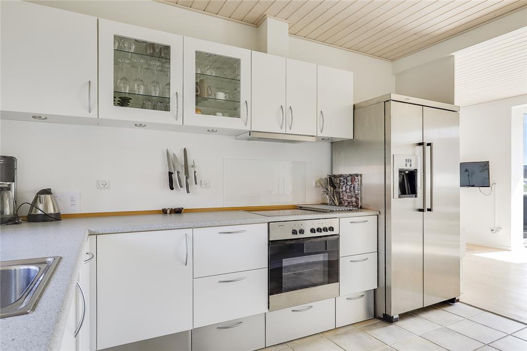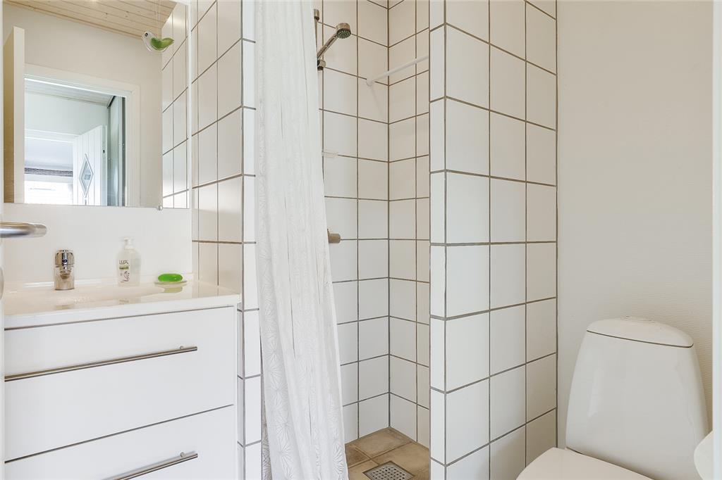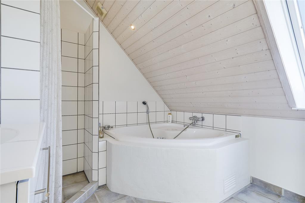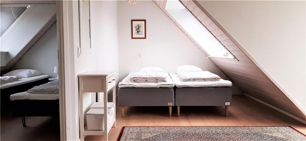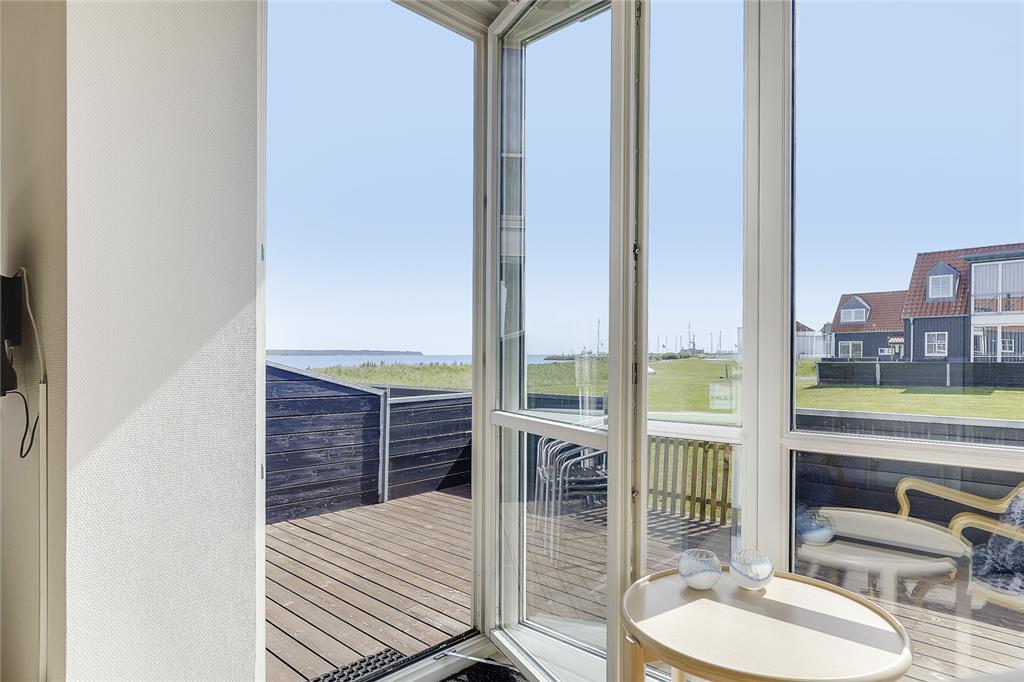 Fra stuen fører en trappe op på 1. sal, hvor der er repos, som er kombineret stue og soverum med en dobbeltseng. Herfra kan man nyde den fantastiske udsigt over strand og skov. På 1. sal er der ligeledes 1 soverum med to enkeltsenge samt stort badeværelse med spabad.