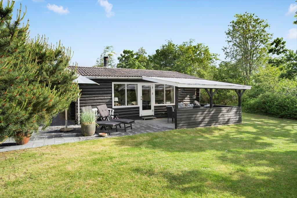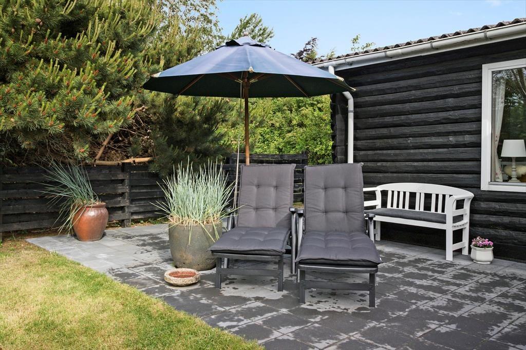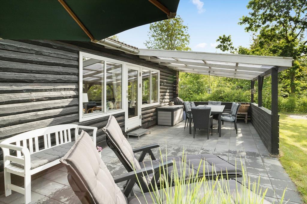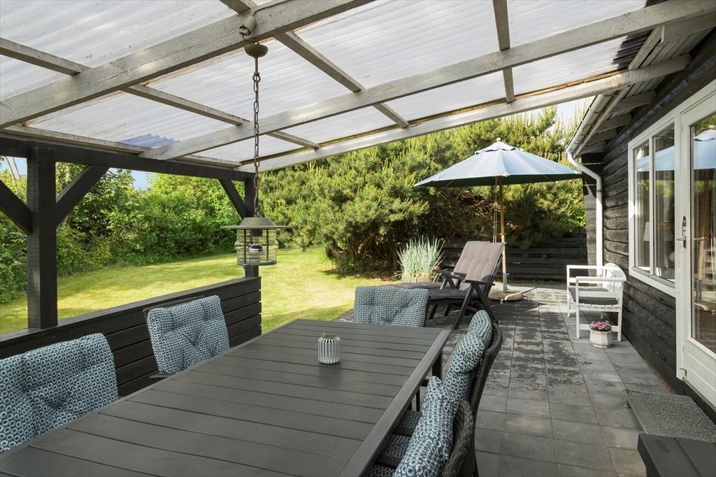 Med udgang fra stuen findes sommerhusets terrasse som består af både en overdækket og en åben del, samt gangarealer rundt om hele huset. Sommerhuset ligger trukket langt tilbage på en stor grund og er derfor meget privat. Grunden er stor og giver rig mulighed for masser af udendørs aktiviteter, her i blandt hygge omkring et bålsted.