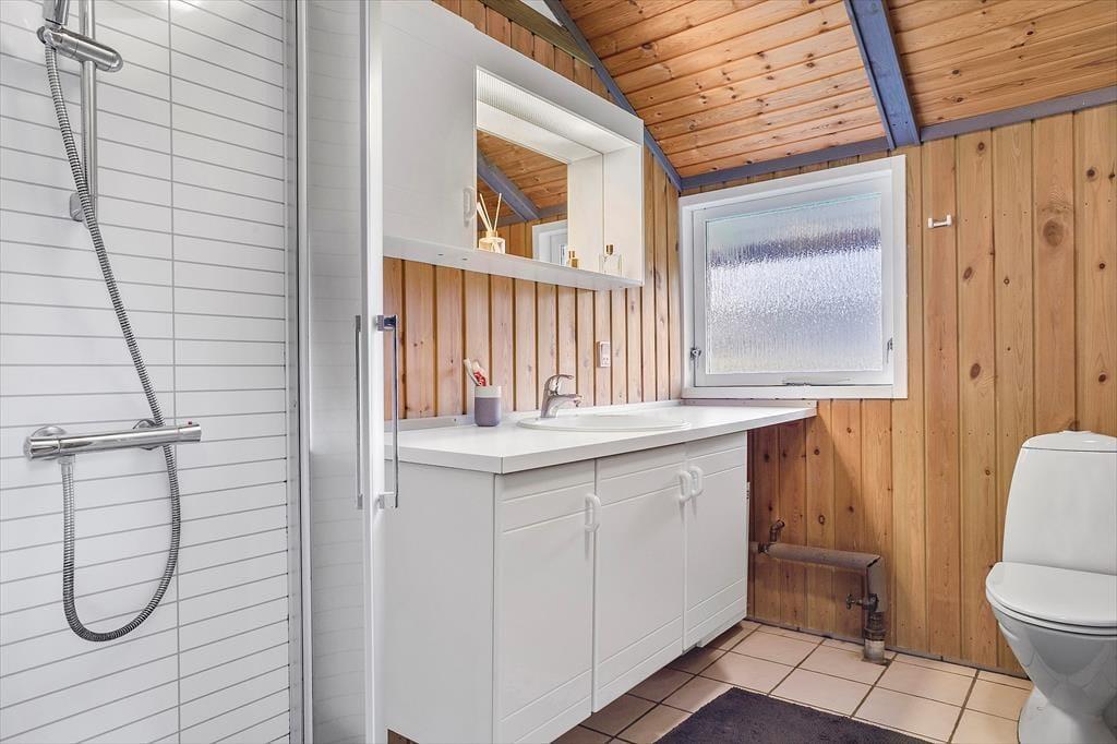 Badeværelset er med brusebad og dejlige lyse klinker, der fremstår pænt i klassisk sommerhusstil.