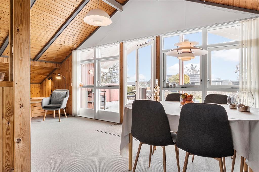 Fra fordelingsgangen går man videre ind i husets samlingsrum; det dejlige, åbne køkken/alrum og stue. De store vinduer giver et godt lysindfald og udsyn til haven, hvilket fremhæves af loftet der er til kip. Samtidig er trævæggene bevaret, så der er en hyggelig sommerhusstemning, hvor hele familien kan samles.