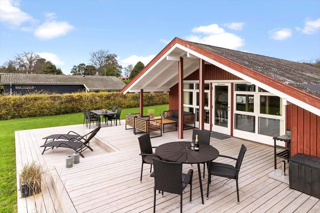 Med udgang fra stuen er en dejlig sydvendt træterrasse, der er delvist overdækket. Her er gode havemøbler samt loungemøbler og solstole, så der er rig mulighed for at samles til hygge på terrassen eller nyde solen i godt vejr. Der er en grill til rådighed, så om sommeren kan terrassen blive samlingspunktet for dagens måltider.