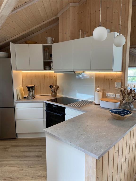 Vi har her fornøjelsen af, at byde velkommen til et lyst og lækkert sommerhus med højt til loftet og god plads til familien.