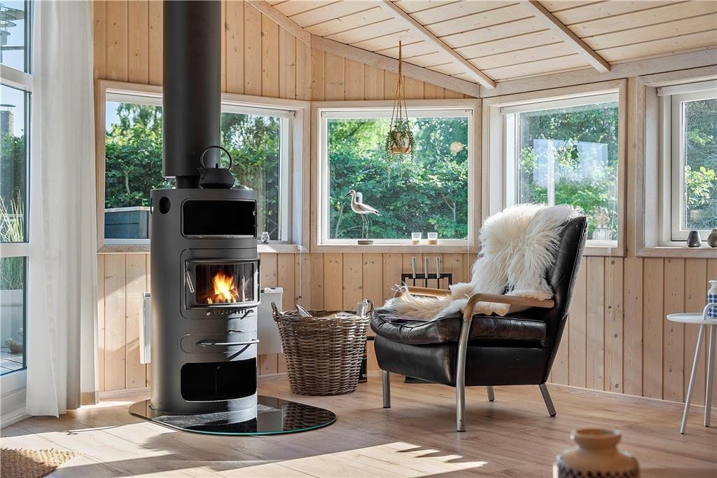 Sommerhuset opvarmes med brændeovn, varmepumpe og elvarme.