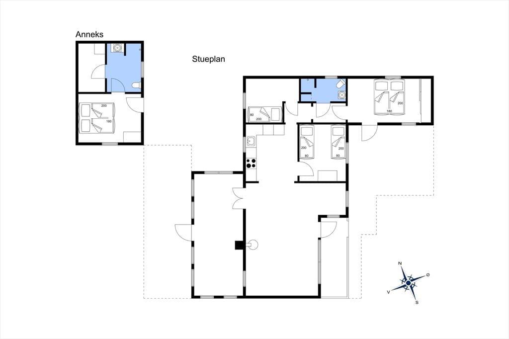 Sommerhuset tilbyder 7 sovepladser fordelt på 4 værelser. I hovedhuset finder du tre værelser: to med dobbeltsenge og ét med en enkeltseng. Det fjerde værelse er placeret i et separat anneks og er udstyret med en dobbeltseng samt eget badeværelse, hvilket giver ekstra privatliv.