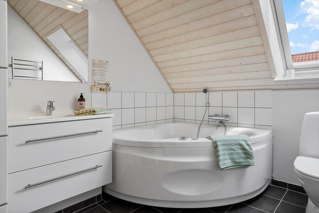 På første sal finder du to velindrettede soveværelser. Det ene soveværelse har en charmerende karnap med havudsigt. Der er også et badeværelse med spa – hop i spabadet, lad skuldrene falde ned, og nyd den afslappende feriestemning.