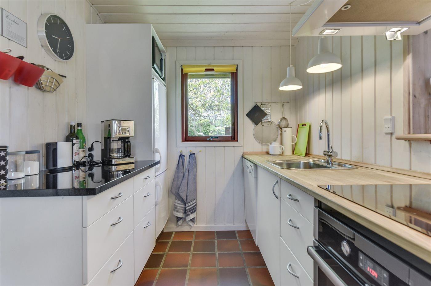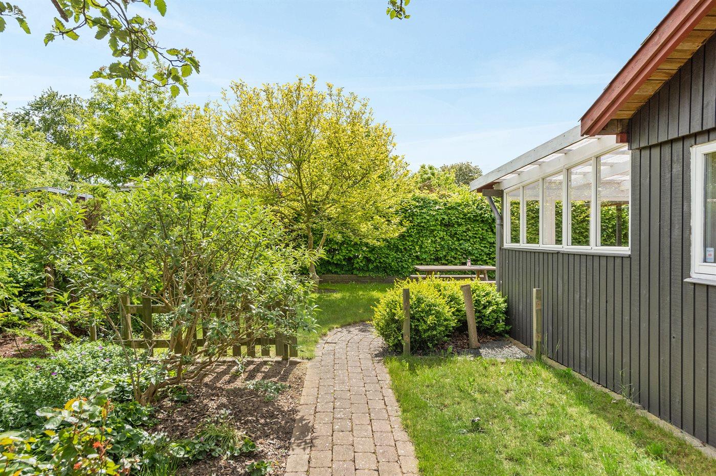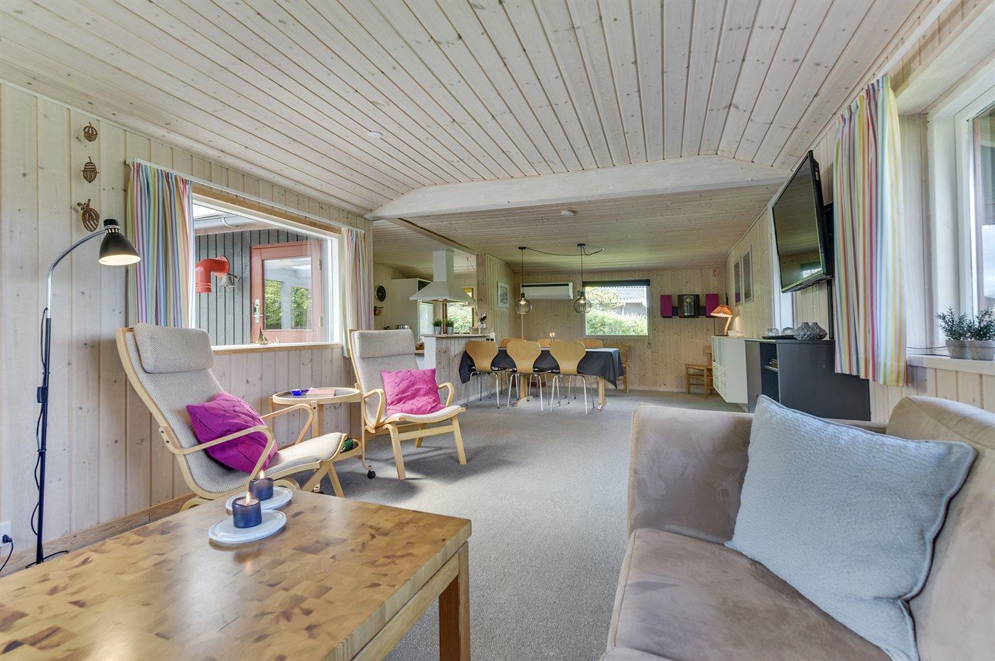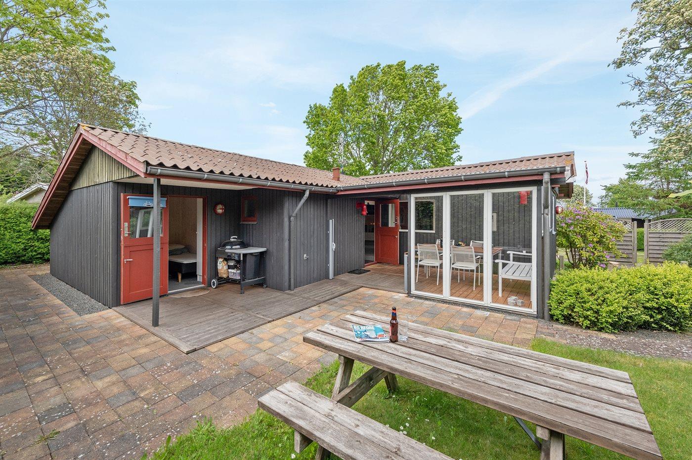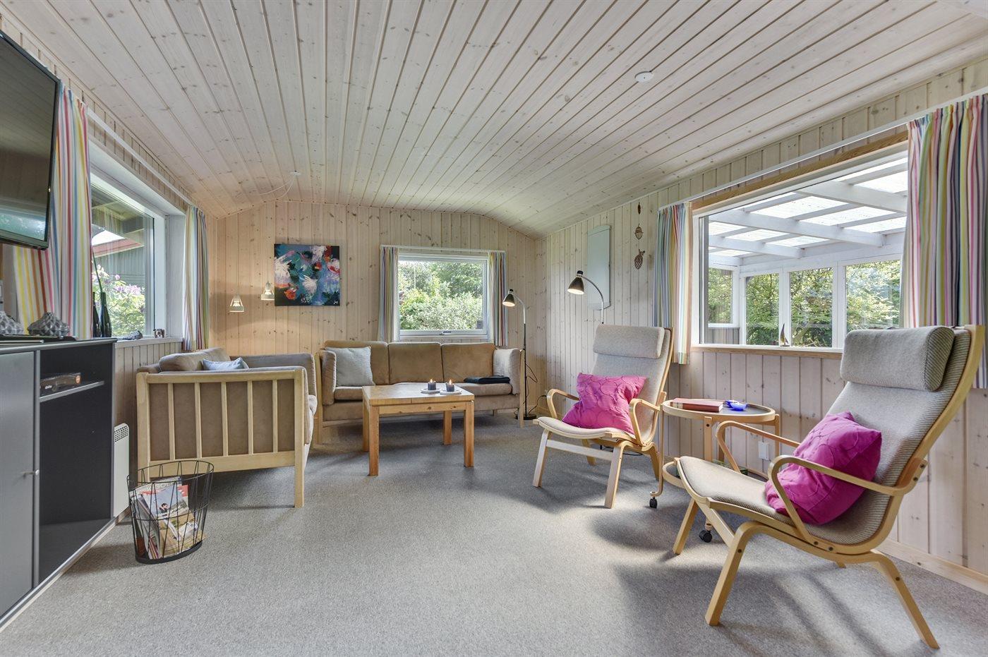 Dette pæne sommerhus i træ, renoveret i 1999, ligger på en delvist lukket havegrund - kun 50 m fra fælles legeplads. Til huset hører en åben samt en dejlig overdækket terrasse med havemøbler. Køkkenet ligger i åben forbindelse med spise-/opholdsstuen og er bl.a. udstyret med opvaskemaskine, lille fryser, mikrobølgeovn, varmluftovn og komfur med keramiske kogeplader. I spise-/opholdsstuen finder I TV med parabol (digital), DVD-afspiller samt stereoanlæg med CD-afspiller. Sovepladserne fordeler sig på 1 værelse med dobbeltseng, 1 værelse med køjeseng samt 2 sovepladser (enkeltsenge) i husets anneks. Til de mindste feriegæster står barneseng og høj barnestol til rådighed. Der er installeret energibesparende varmepumpe. Et pænt sommerhus i et familievenligt område med god badestrand.